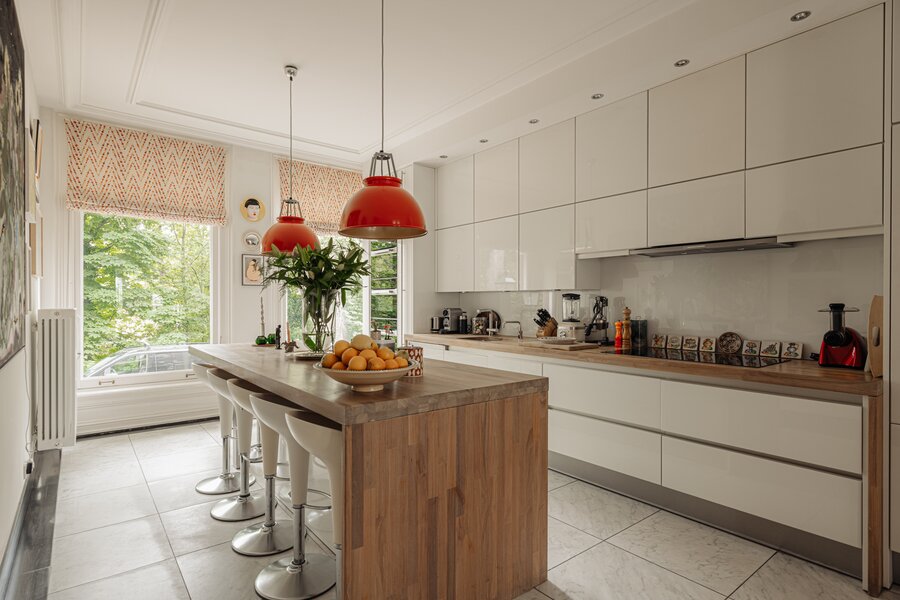 Op de bel-etage vindt u een sfeervolle woonkeuken met kookeiland – het hart van het huis – en een riante eetkamer met toegang tot een zonnig terras. Een perfecte plek voor lange diners en ongedwongen samenzijn.