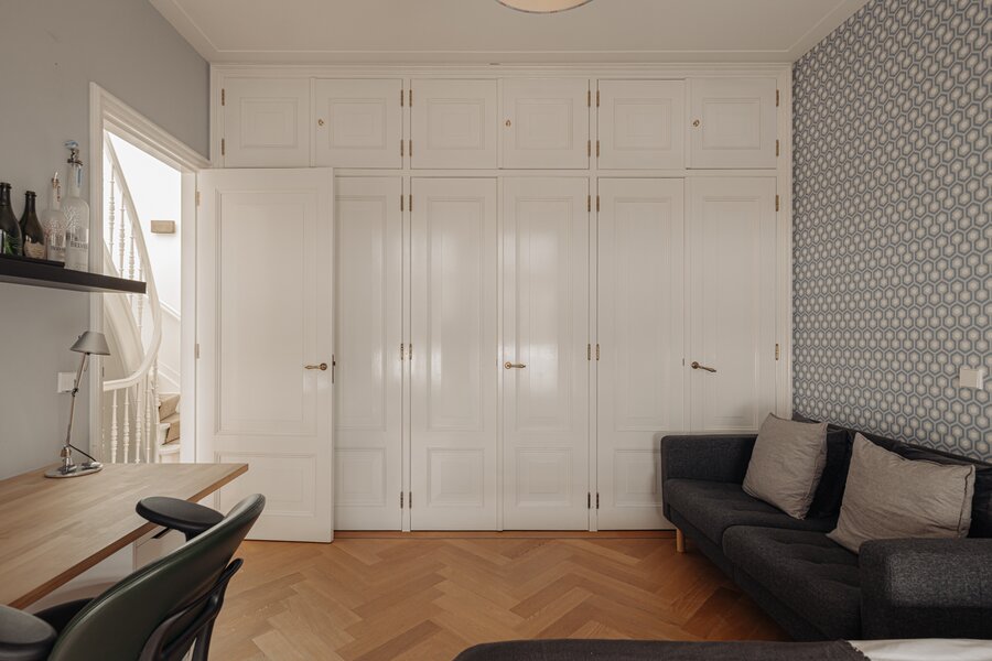 The top two floors offer four spacious bedrooms, two luxurious bathrooms, a dressing room, and a utility room. Each space has been thoughtfully designed with light, tranquillity, and functionality in mind – complete with custom-built cabinetry.