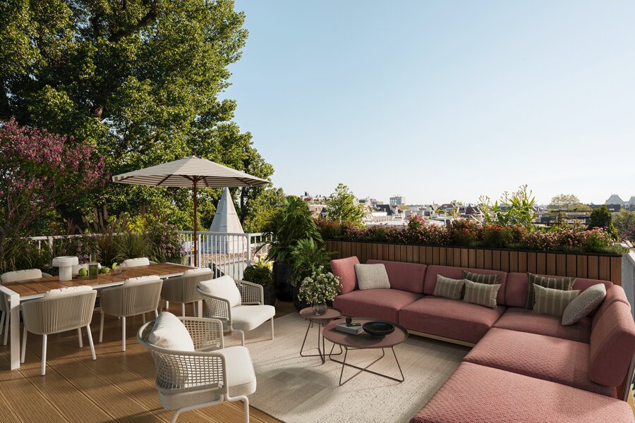 Het dakterras is de 'kers op de taart'. Hier ervaart u het Vondelpark op z’n mooist, met vrij zicht over het groen én de stad.