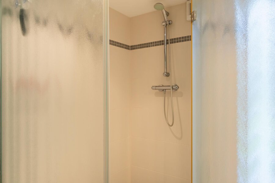 Ruime, geheel betegelde extra badkamer met een grote inloopdouche, een toilet en een dubbele wastafel met een modern bijbehorend wastafelmeubel en een spiegelkast met verlichting. De inloopdouche is voorzien van een glazen deur en beschikt over een draingoot, een thermostaatkraan en een glijstang met handdouche. Het plafond is voorzien van diverse inbouwspots. De glasbouwstenen zorgen voor een aangename daglichttoetreding.