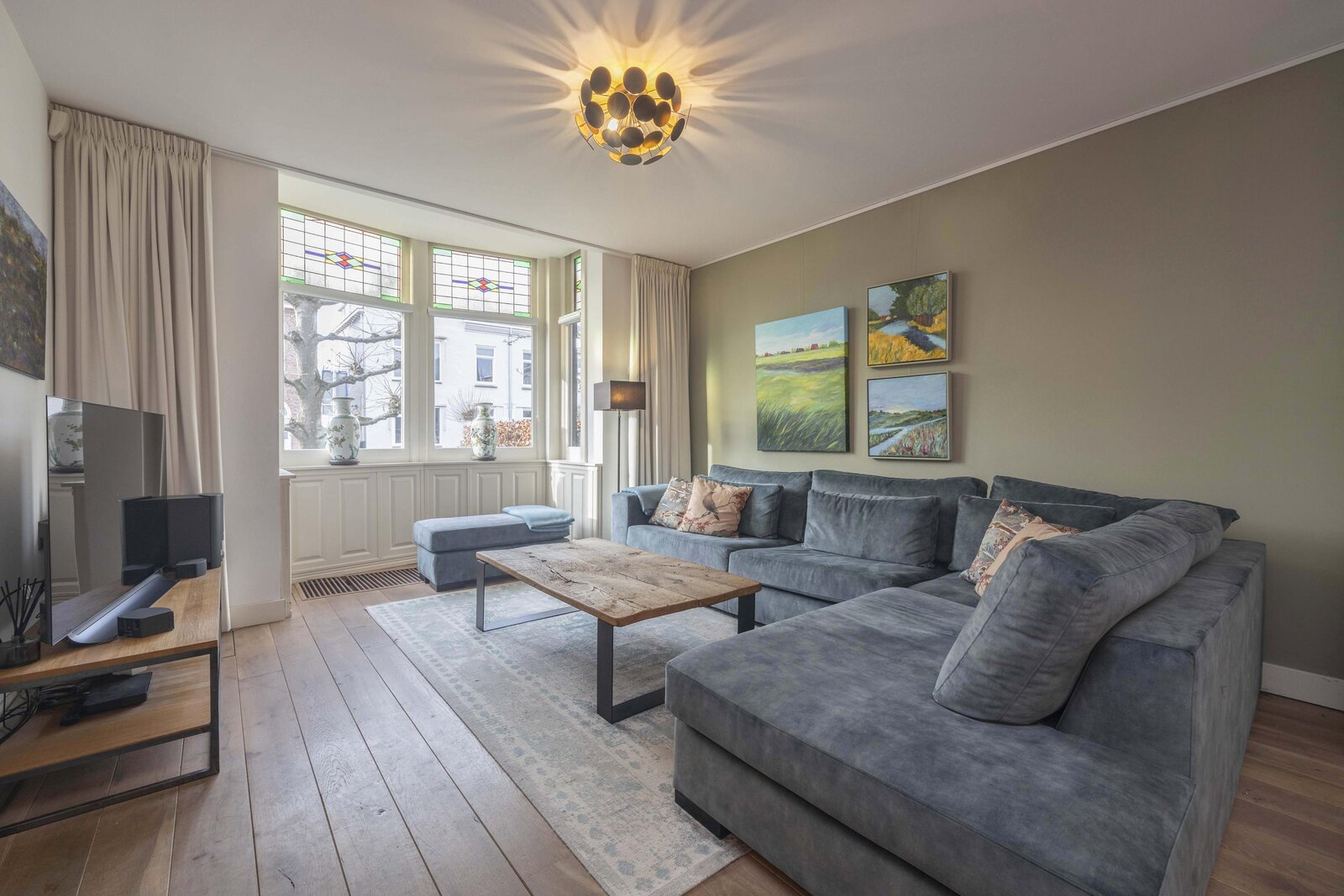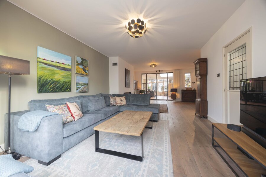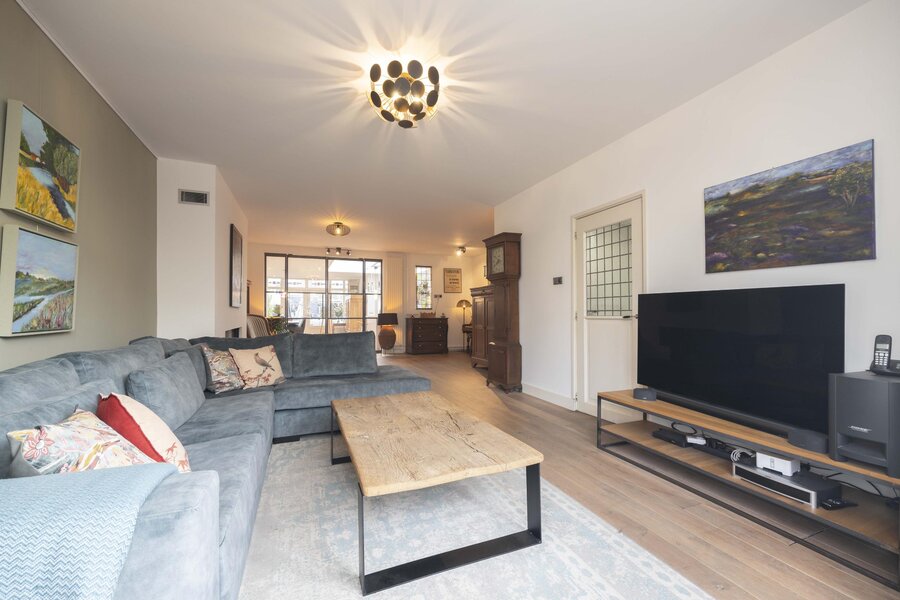 De tussendeur, eveneens uitgevoerd met glas in lood, geeft toegang tot de woonkamer. Deze ruimte is afgewerkt met een massief eikenhouten vloer en beschikt over een sfeervolle erker en een gashaard. Via een dubbele taatsdeur is de woonkeuken bereikbaar.