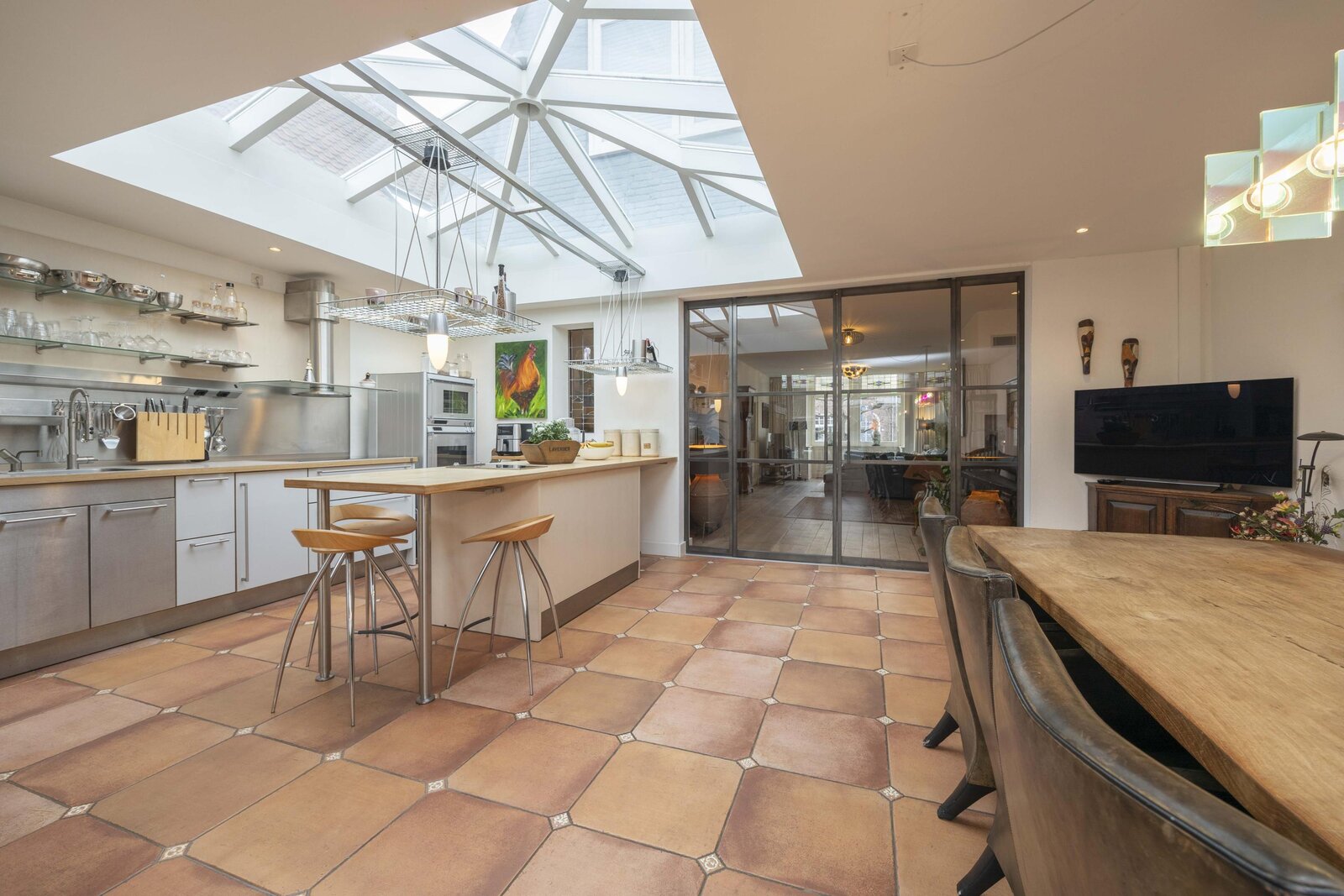 De woonkeuken is uitgevoerd in een hoogwaardige Bulthaup opstelling en voorzien van een oven, stoomoven, spoelbak, Quooker, inductiekookplaat met vijf zones en een afzuigkap. Het kookeiland met houten werkblad beschikt daarnaast over een koelkast in ladevorm en een extra inductiekookplaat met twee zones. Aansluitend bevindt zich de eetkamer met dubbele deuren naar de tuin.
