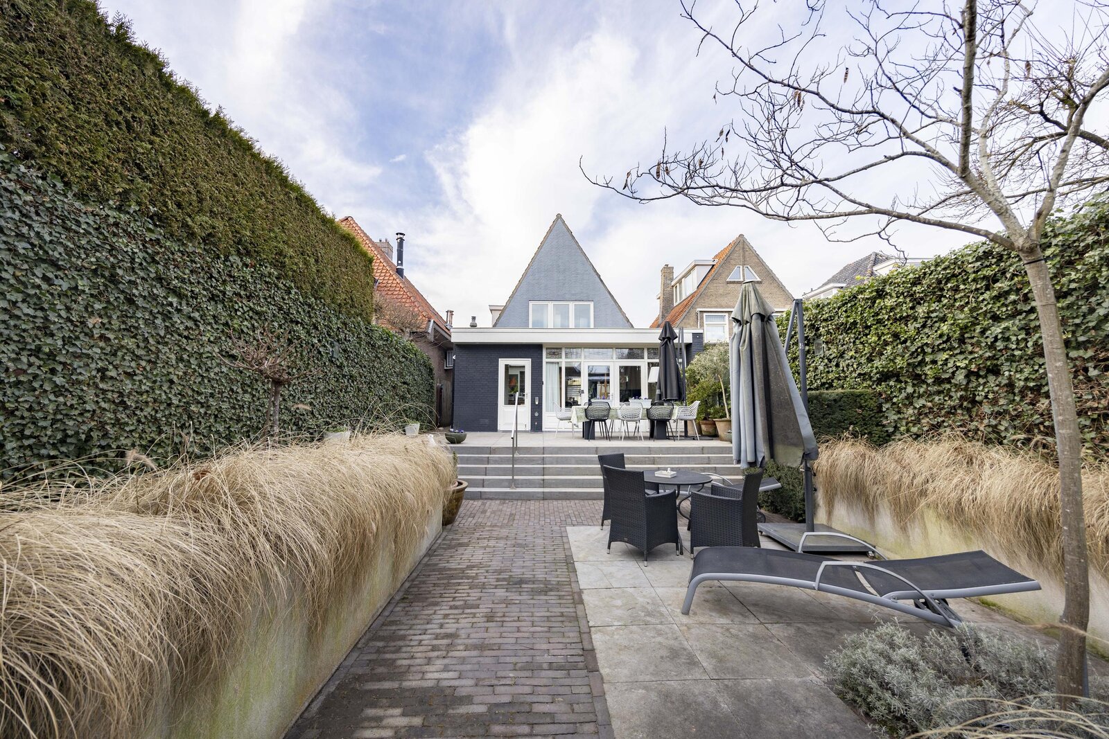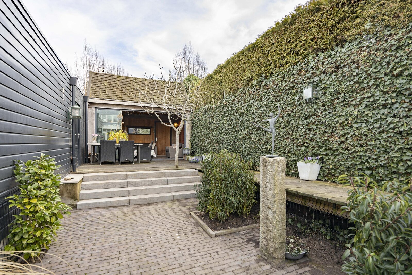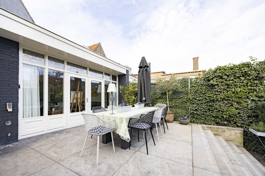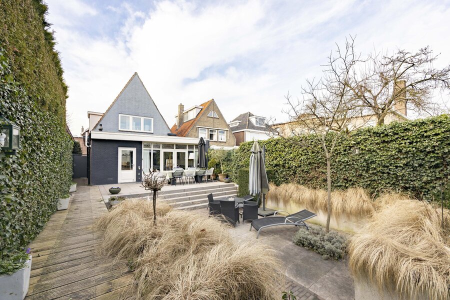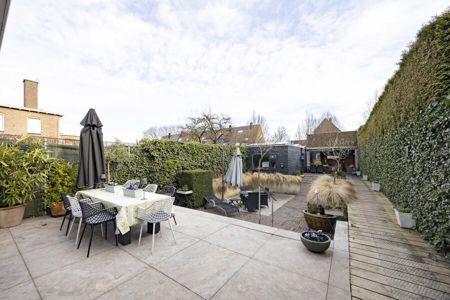 De fraai aangelegde achtertuin is gelegen op het oosten en beschikt over meerdere zitgedeeltes. Door de speelse hoogteverschillen komt de tuin bijzonder goed tot zijn recht. Daarnaast is er een achterom aanwezig.