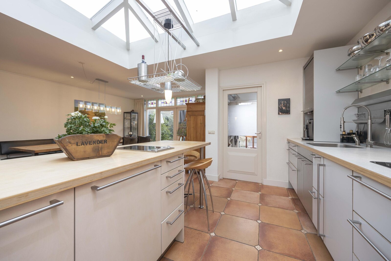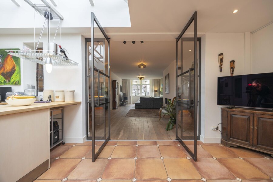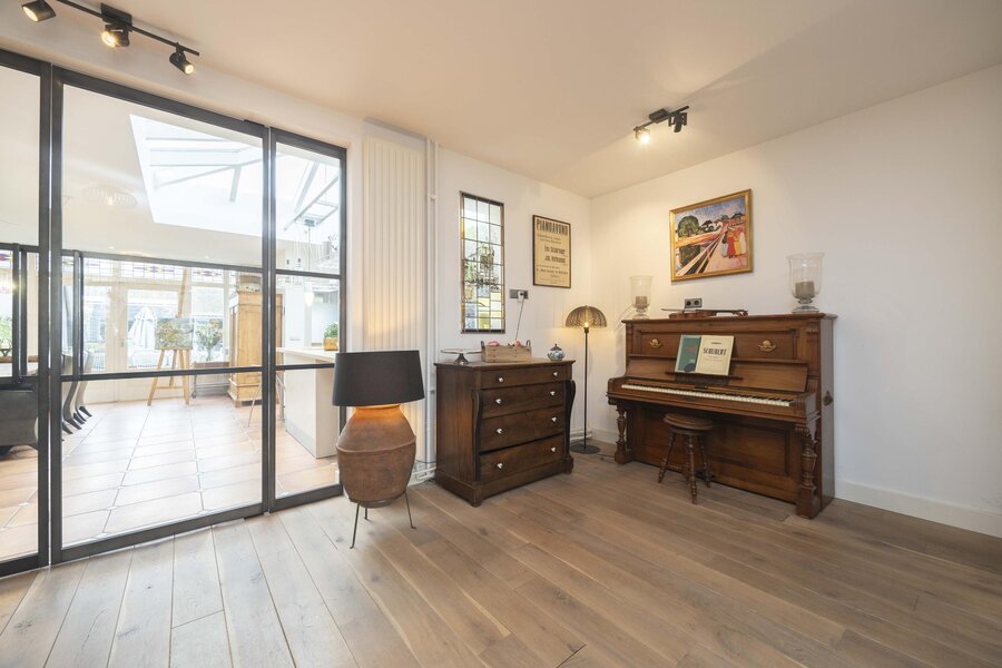 In de gehele aanbouw, waar de keuken en eetkamer zijn gesitueerd, is vloerverwarming aanwezig en is de vloer afgewerkt met een tegelvloer. Een groot lichtstraat zorgt voor een prettige hoeveelheid daglicht. Achter de keuken ligt de bijkeuken met een deur naar de achtertuin en de opstelling van de cv ketel.