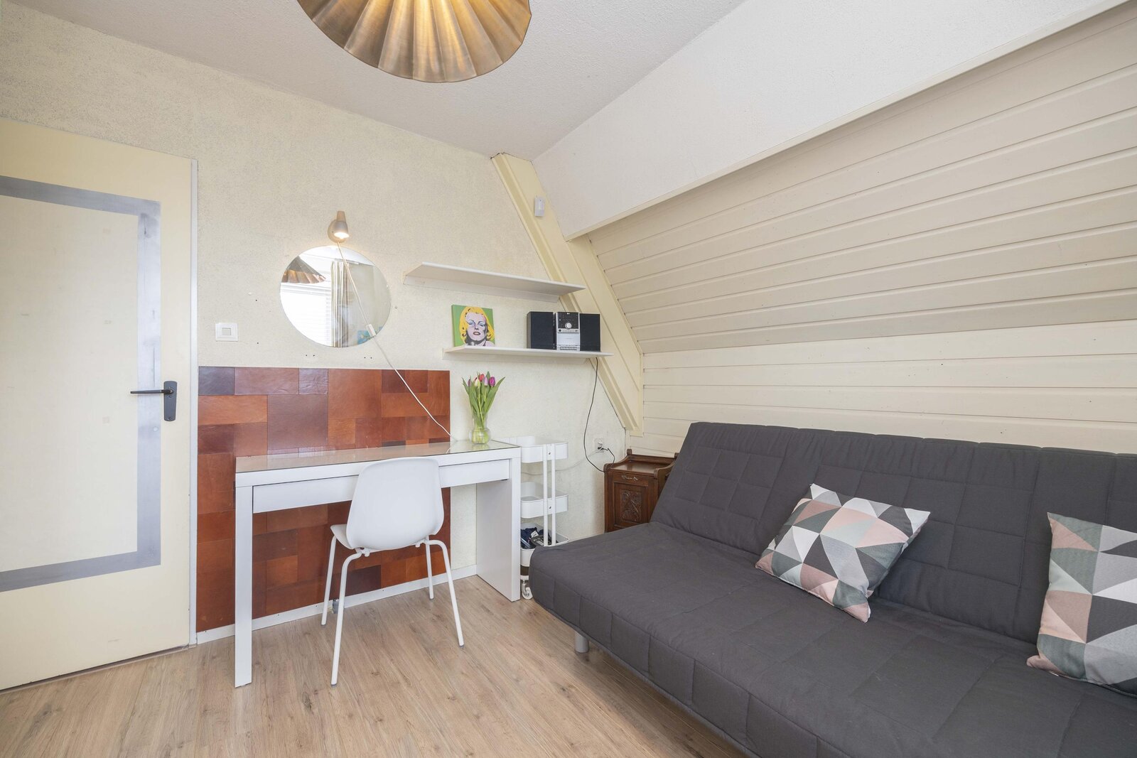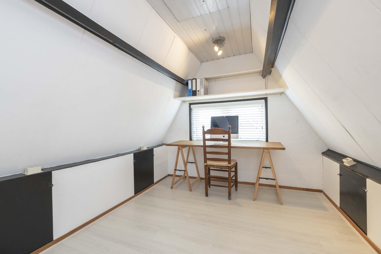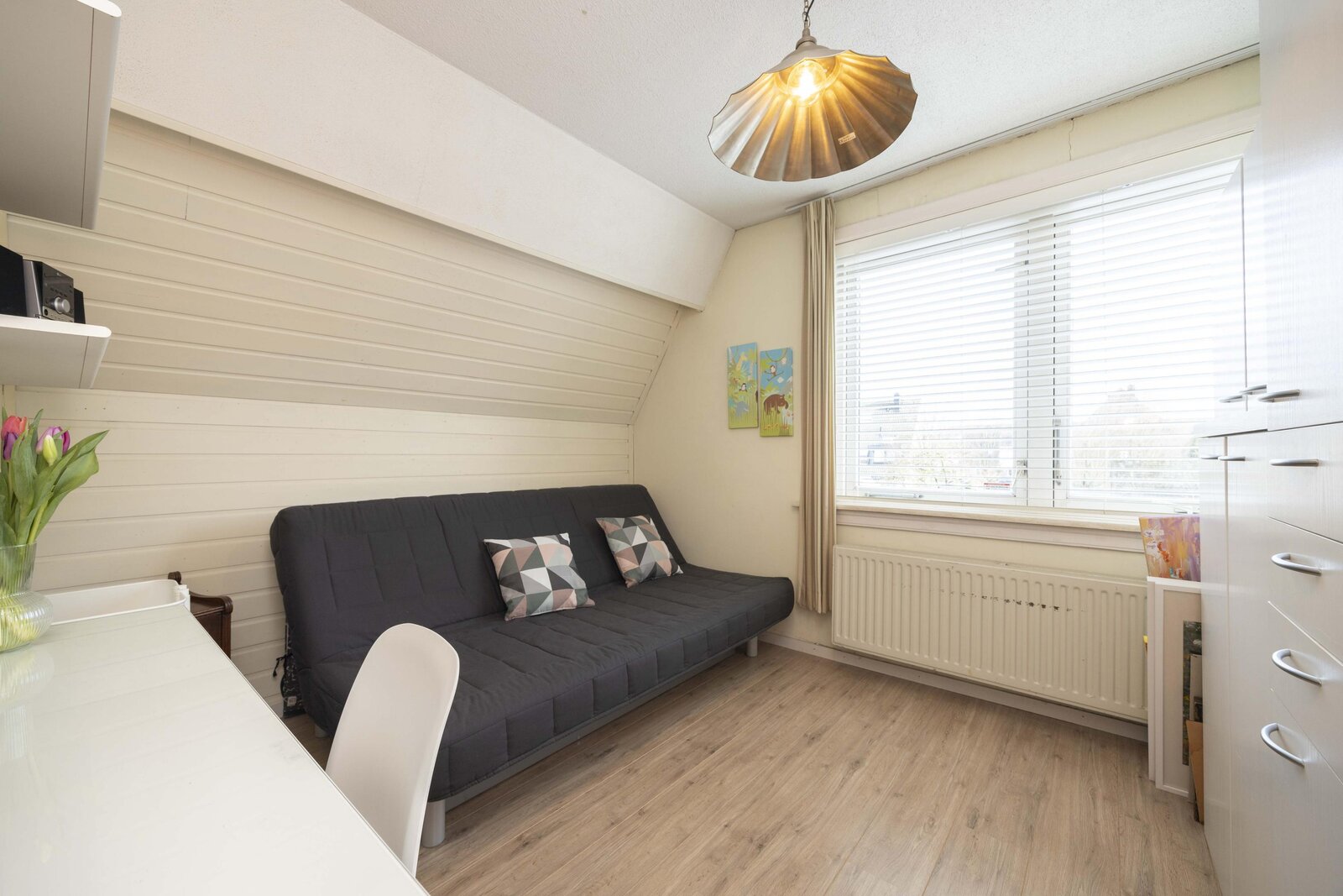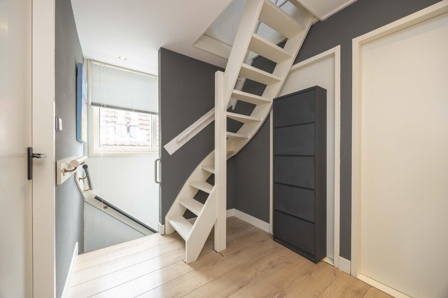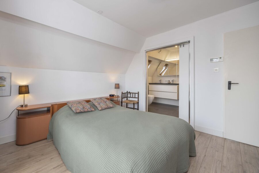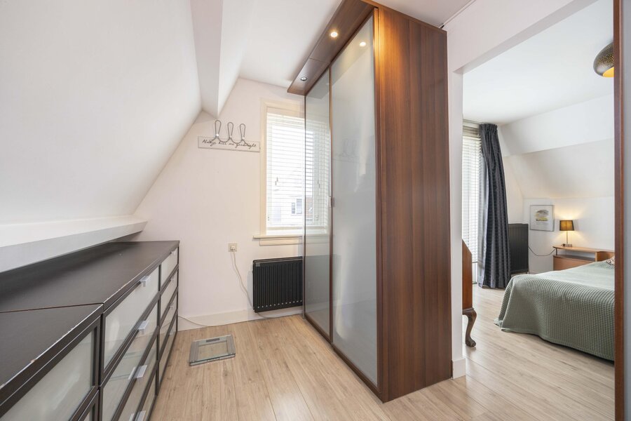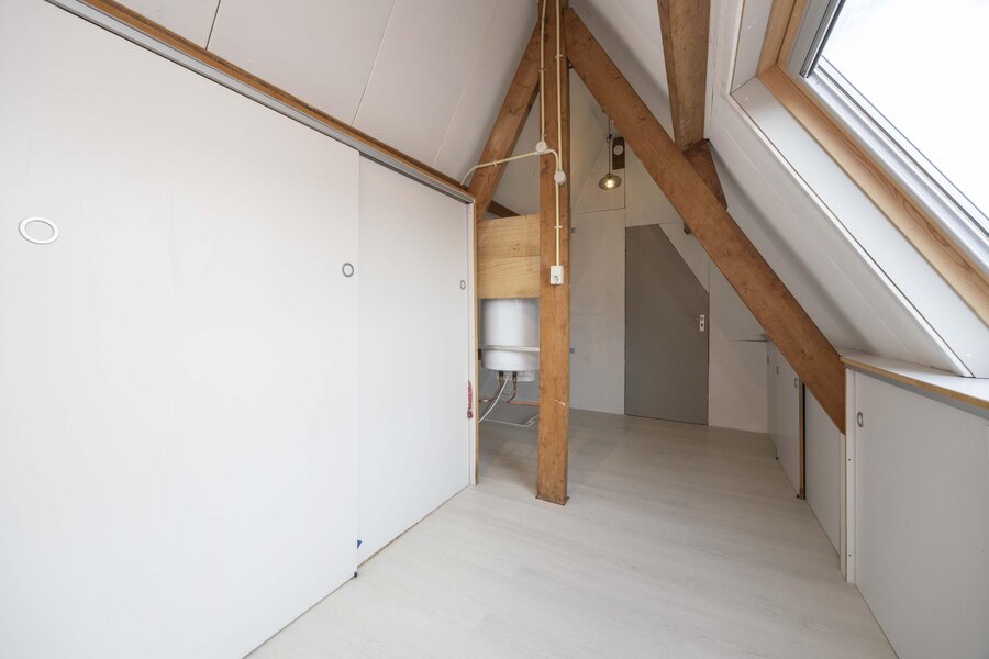 De overloop beschikt over praktische bergruimte achter het knieschot, een ingebouwde kast en de opstelling van de boiler. Daarnaast bevindt zich hier de vierde slaapkamer. Ook deze verdieping is afgewerkt met een laminaatvloer.