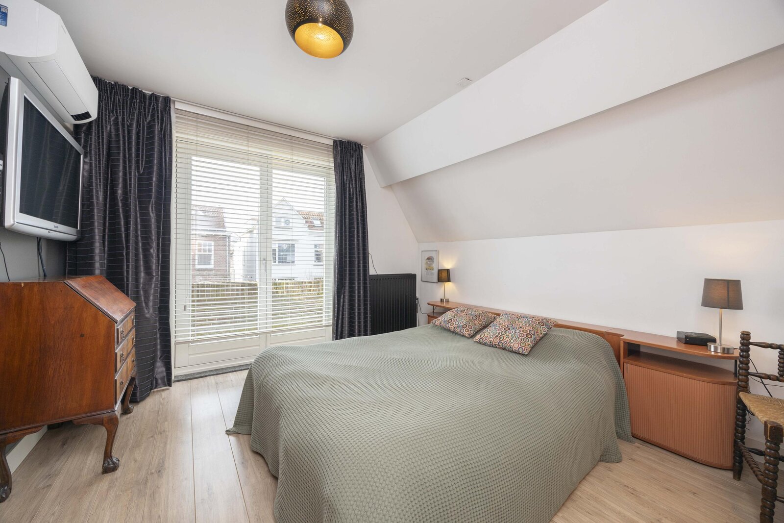 De overloop biedt toegang tot drie slaapkamers en de badkamer. De hoofdslaapkamer is gelegen aan de voorzijde van de woning en beschikt over een inloopkast, airconditioning en een balkon. Deze slaapkamer is en suite verbonden met de badkamer en heeft een eigen toegang tot deze ruimte.