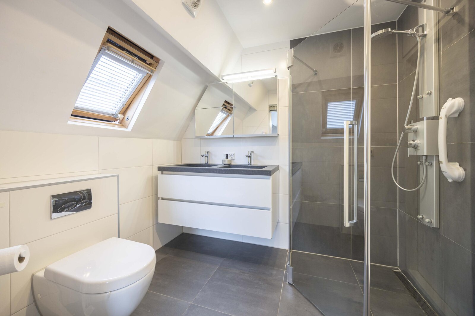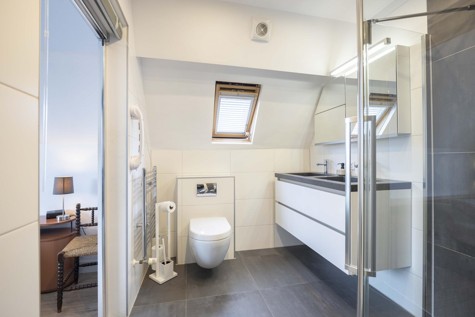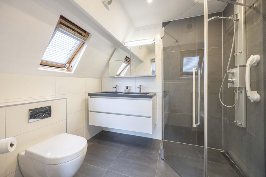 De twee overige slaapkamers zijn aan de achterzijde gesitueerd en zijn beide ruim van opzet. De badkamer is ingericht met een douche, handdoekradiator, dubbele wastafel met meubel en een toilet. De vloer is afgewerkt met natuurstenen tegels en voorzien van vloerverwarming.