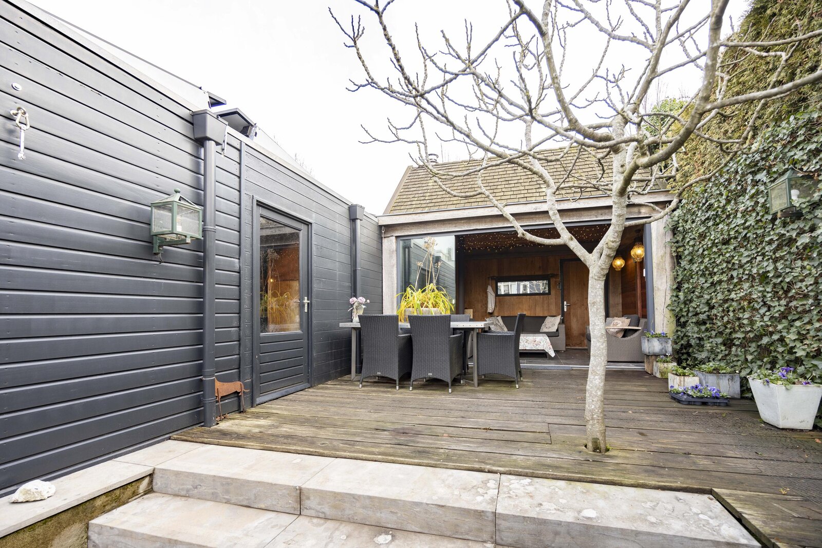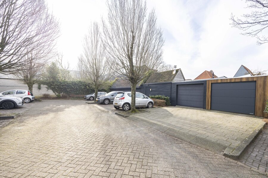 In de tuin bevindt zich een afsluitbaar tuinhuis met glazen schuifwanden, voorzien van een houtkachel en elektra, waardoor deze ruimte het hele jaar door te gebruiken is. Verder beschikt het perceel over een garage met elektrische roldeur en mogelijkheid tot laden van een voertuig. Op het dak van de garage zijn 18 zonnepanelen geplaatst.