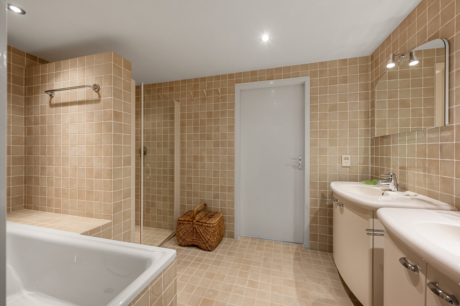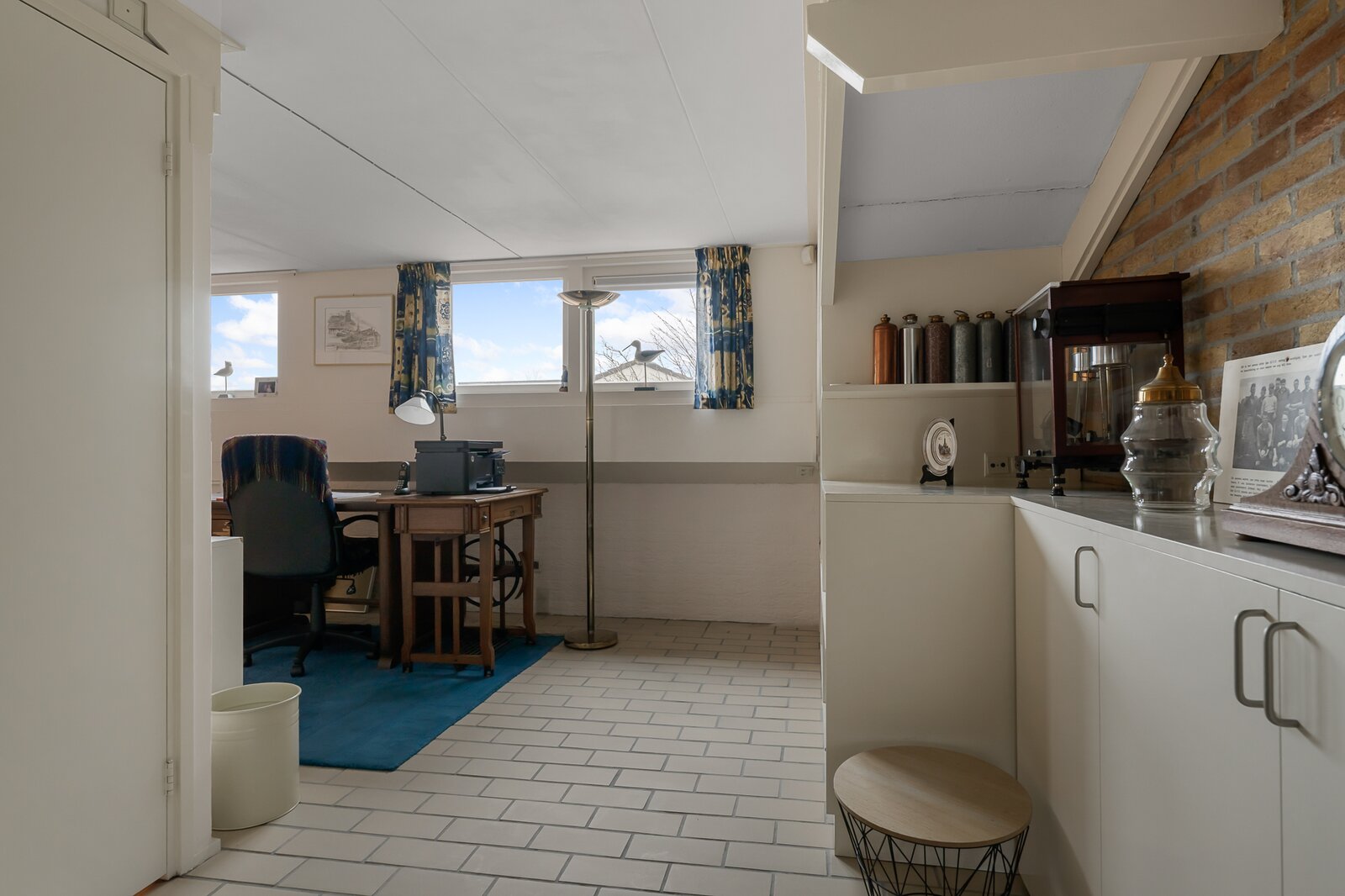 Via de entree komt u de woning binnen in een bijzonder ruime en speelse hal met grote raampartijen. Hier bevinden zich tevens de trapopgang, het toilet en de meterkast. De woonkamer beschikt over een open haard en een royale leefruimte met een prettige lichtinval dankzij de ramen rondom. Er is volop ruimte voor een comfortabele zithoek en een eethoek, waardoor dit het hart van de woning vormt. De open keuken is functioneel ingericht, voorzien van alle benodigde apparatuur en uitgevoerd in een lichte kleurstelling. Op de begane grond treft u daarnaast twee ruime slaapkamers, waarvan één momenteel in gebruik is als werkkamer, en een badkamer met ligbad, douche en dubbele wastafel. Tevens bevinden zich op de begane grond de ruime garage en een berging met C.V.-installatie ten behoeve van de heteluchtverwarming.