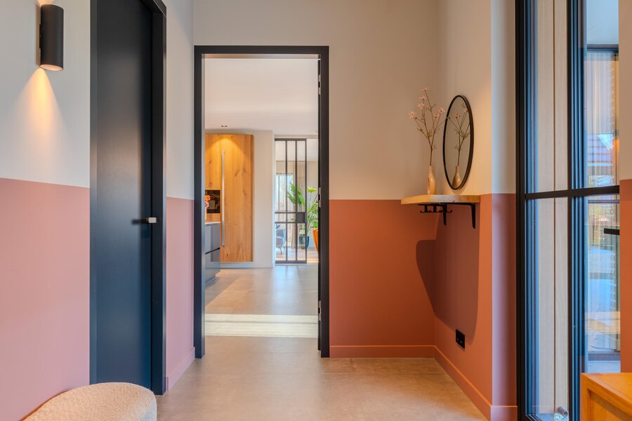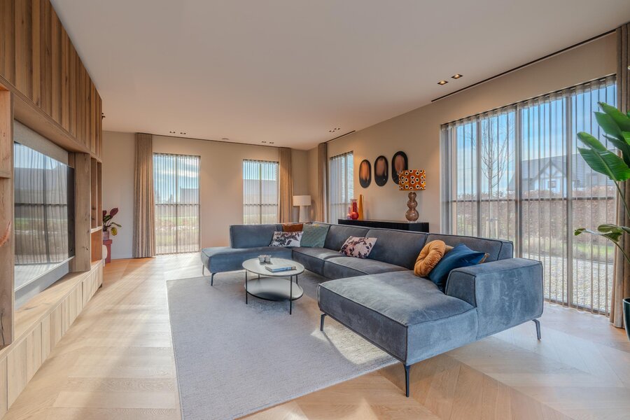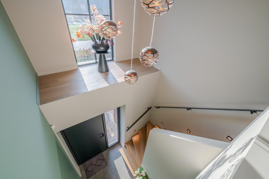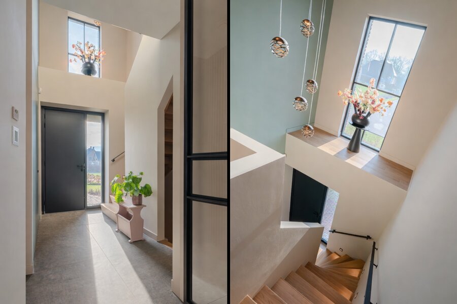 De entree maakt direct indruk. Een royale ontvangsthal met hoge vide zet de toon voor de rest van de villa, waar licht, ruimte en een warme, moderne uitstraling samenkomen. Vanuit deze centrale hal ontvouwen de leefruimtes zich op een natuurlijke en logische wijze.