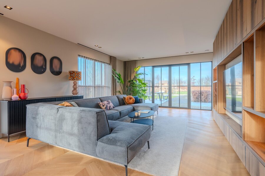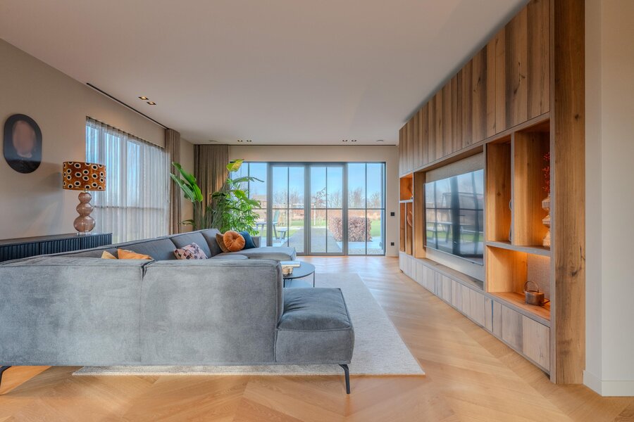Je betreedt de grote leefkeuken, het hart van het huis. Aansluitend bevindt zich de woonkamer, die profiteert van optimale daglichttoetreding en is voorzien van een prachtig maatwerk tv-meubel. De ruimte voelt stijlvol en uitnodigend aan, met grote raampartijen en zicht op de omgeving. De harmonie tussen interieur en architectuur zorgt voor rust en balans. Neem plaats op de bank en geniet samen van een fijne filmavond. Met de glazen schuifdeur kan deze ruimte desgewenst worden afgesloten van de leefkeuken. De houten vloeren in moderne Hongaarse punt geven de gehele begane grond extra warmte en verfijning.