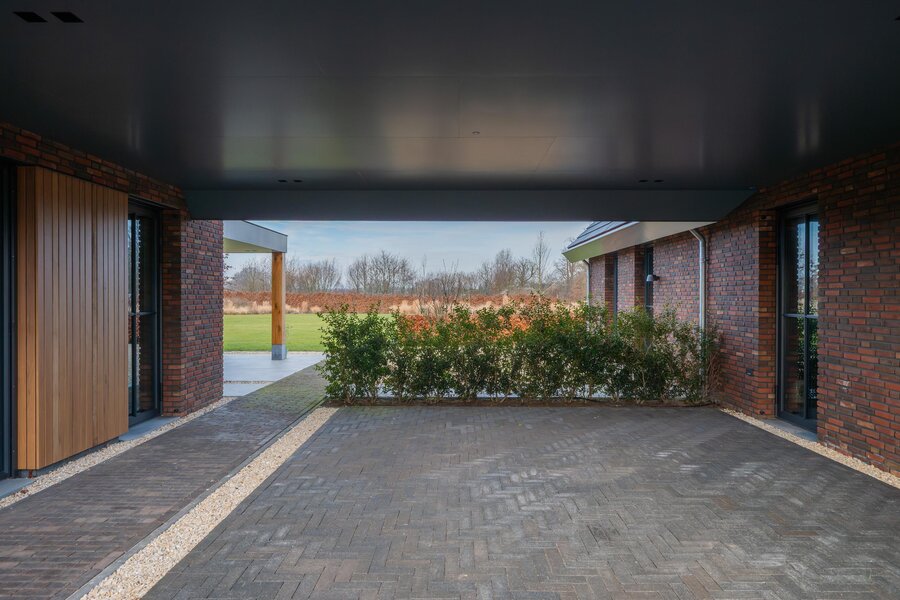 Aan de voorzijde zijn twee elektrische roldeuren geplaatst, terwijl aan de achterzijde een separate elektrische deur zorgt voor optimaal gebruiksgemak en bereikbaarheid. De garage biedt plaats aan circa vier auto’s en wordt aangevuld met een royale oprit en dubbele carport. Ook aan elektrisch rijden is gedacht: er zijn in totaal drie laadpunten aanwezig, waarvan één in de garage en twee buiten.