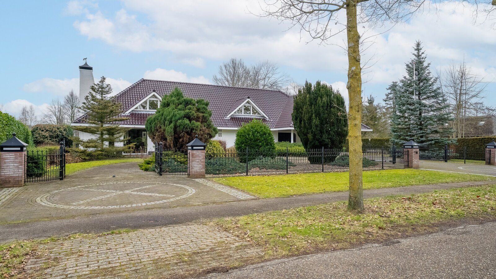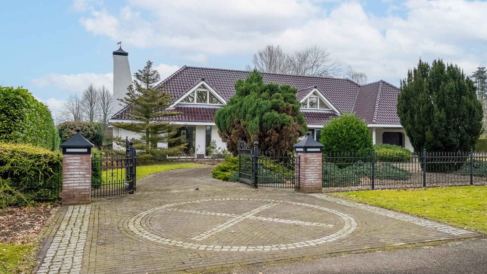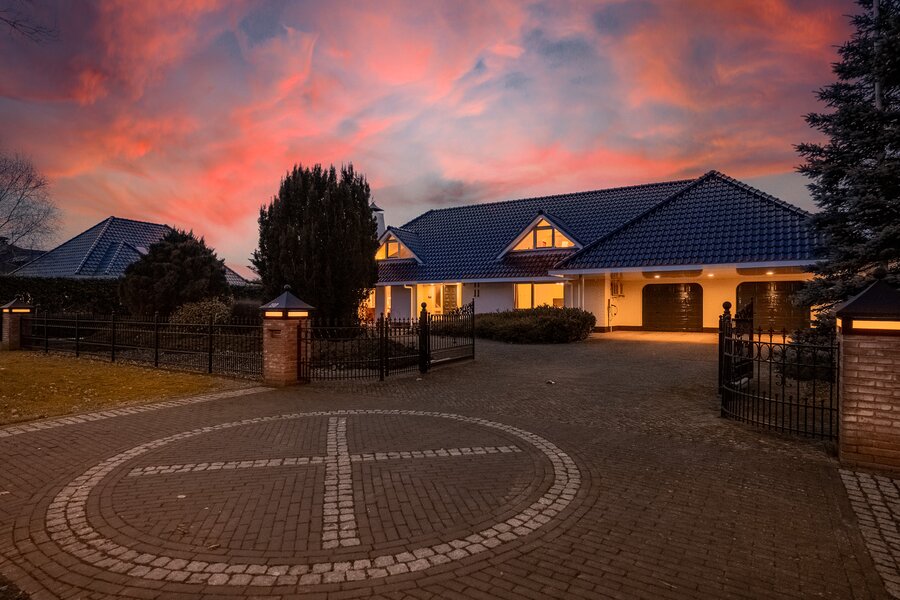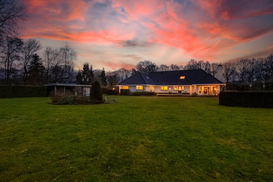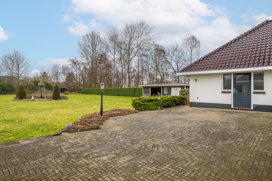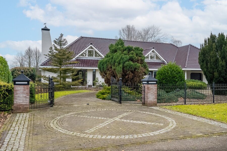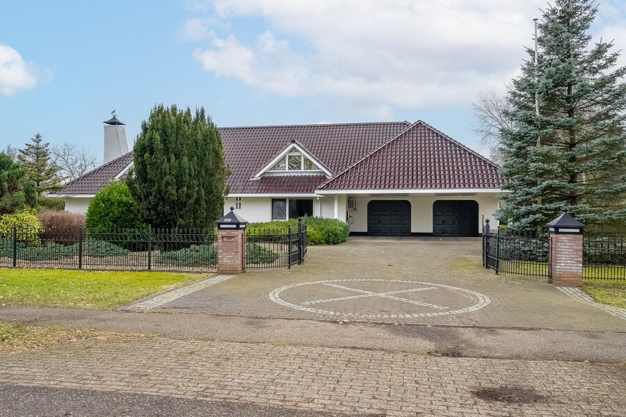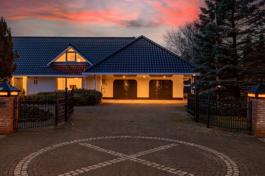 De woning beschikt over een dubbele inpandige garage met dubbele elektrische deuren, een dubbele carport én elektrisch bedienbare toegangspoorten. Parkeren kan hier ruimschoots op eigen terrein.