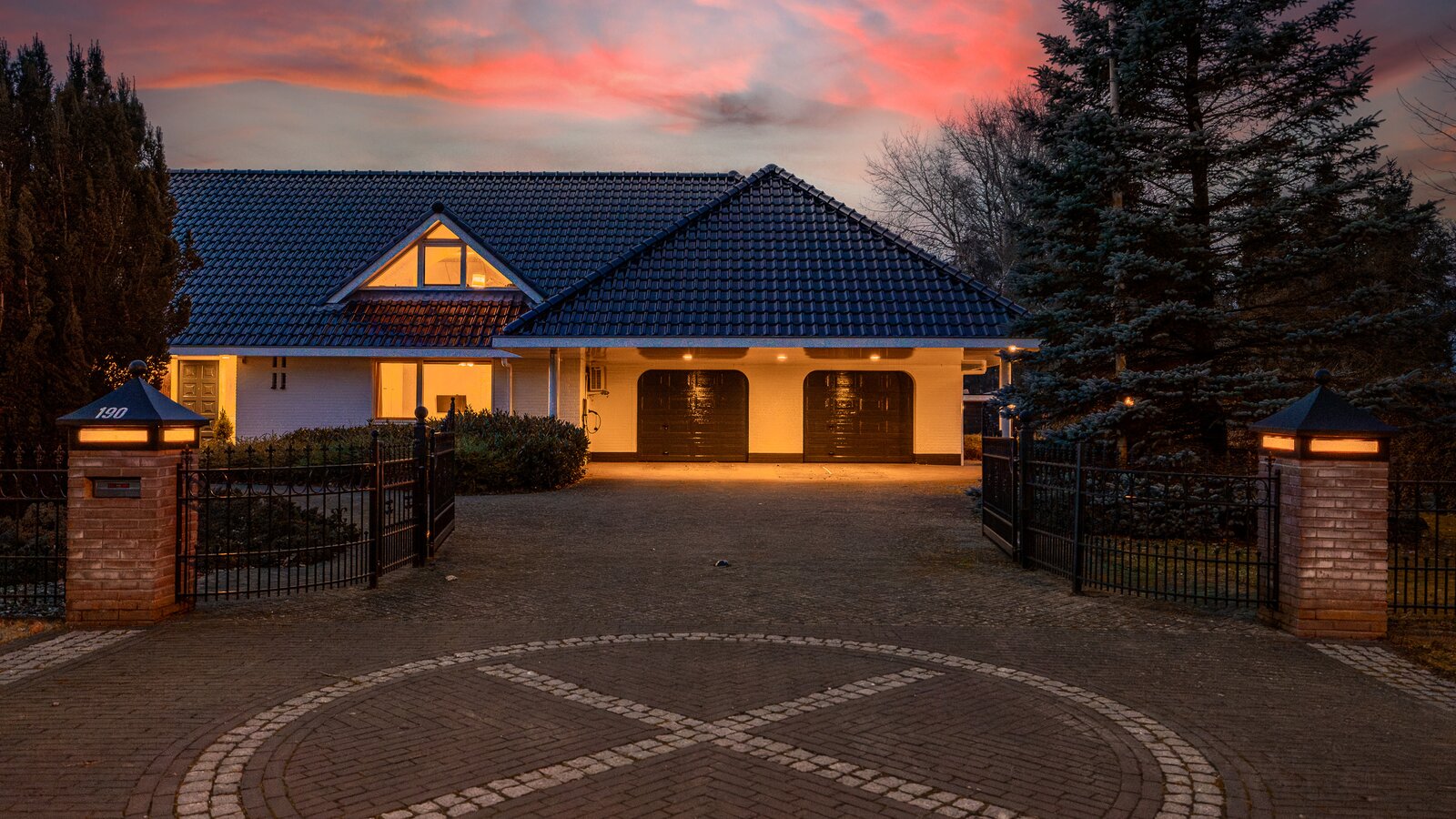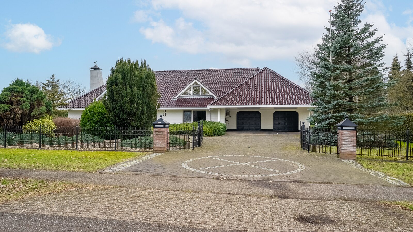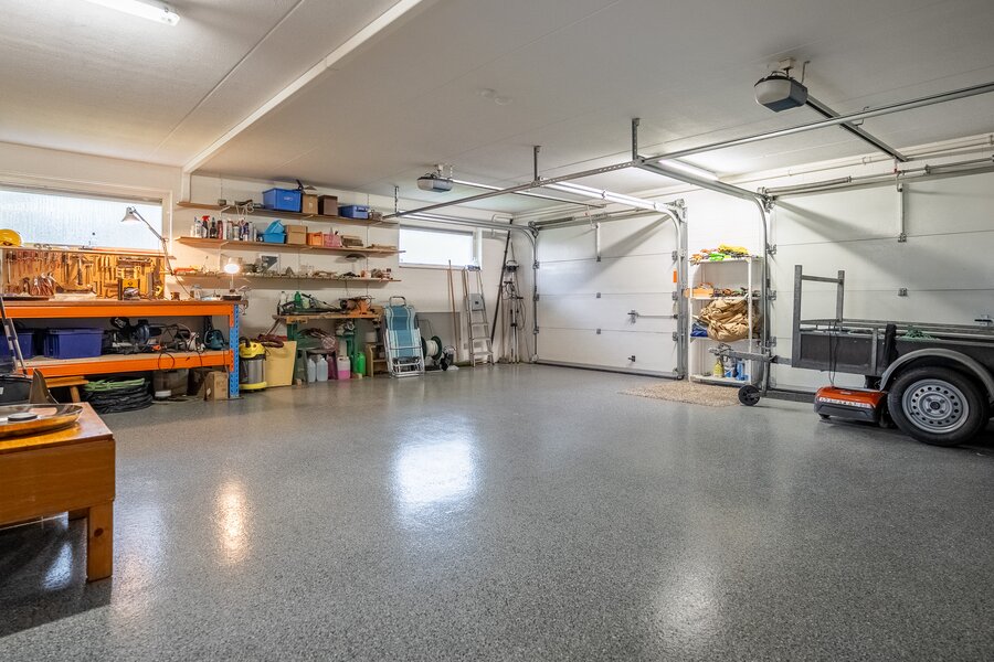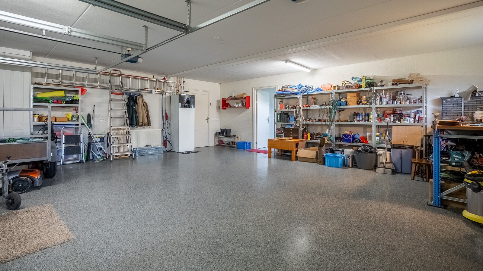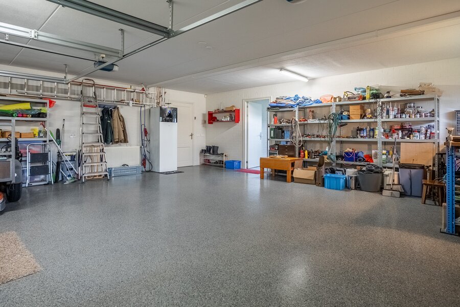 - Voorzien van een dubbele garage met elektrische deuren en een dubbele carport;