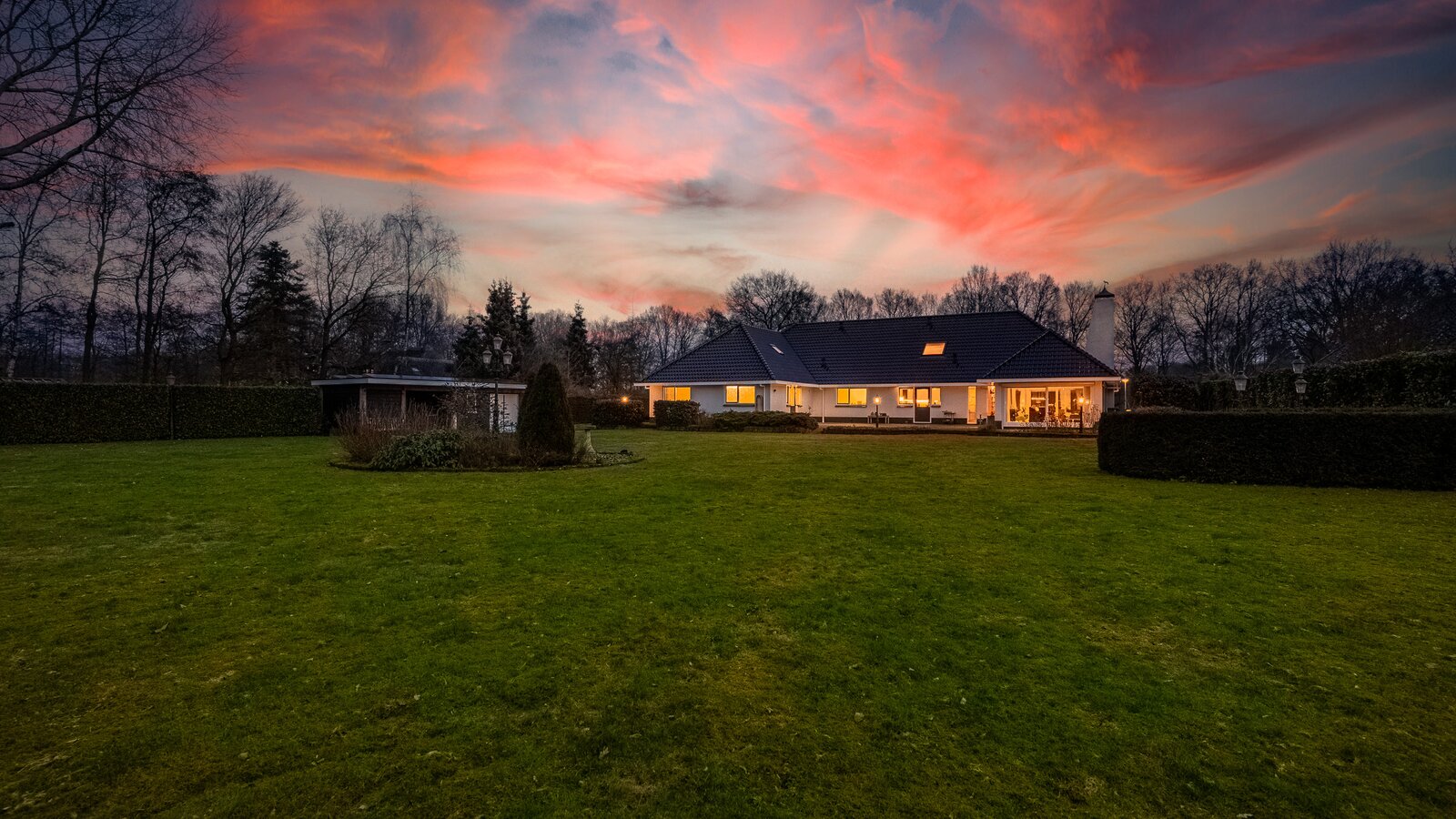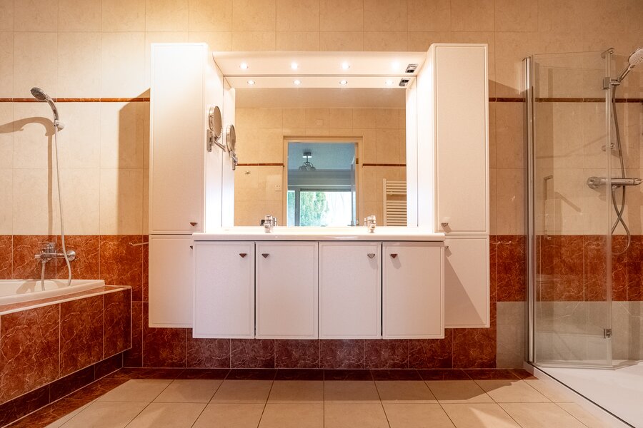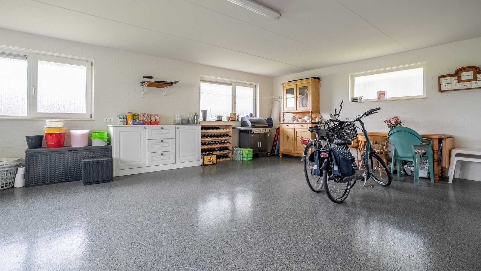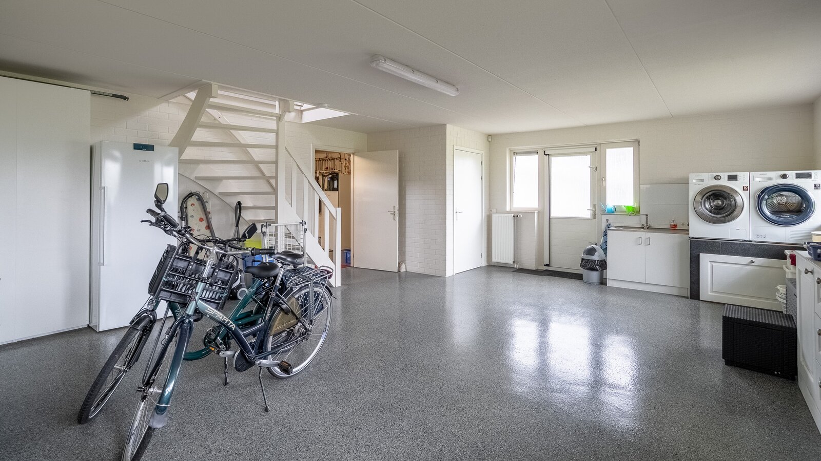 - Voorzien van een dubbele garage met elektrische deuren en een dubbele carport;
