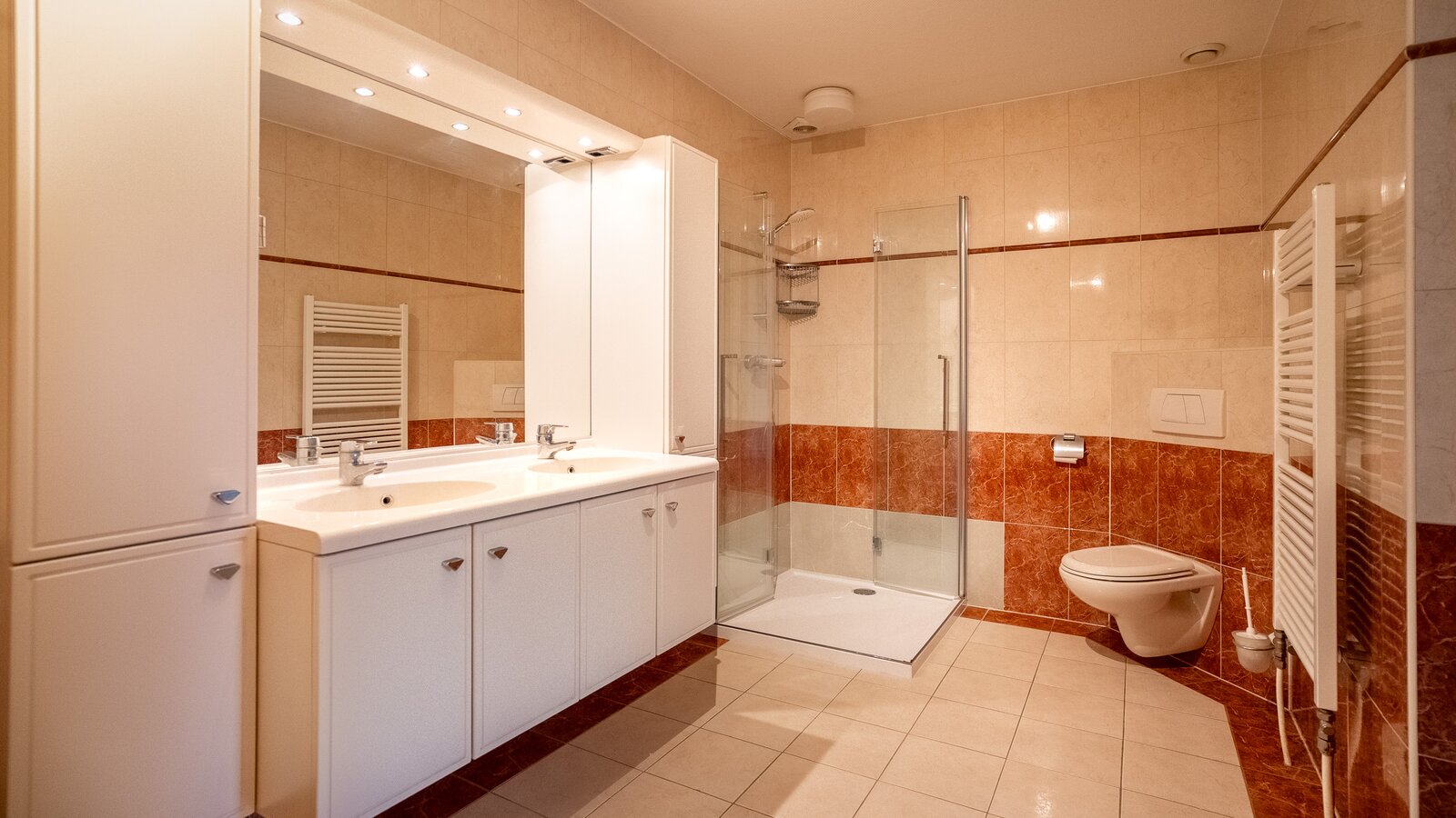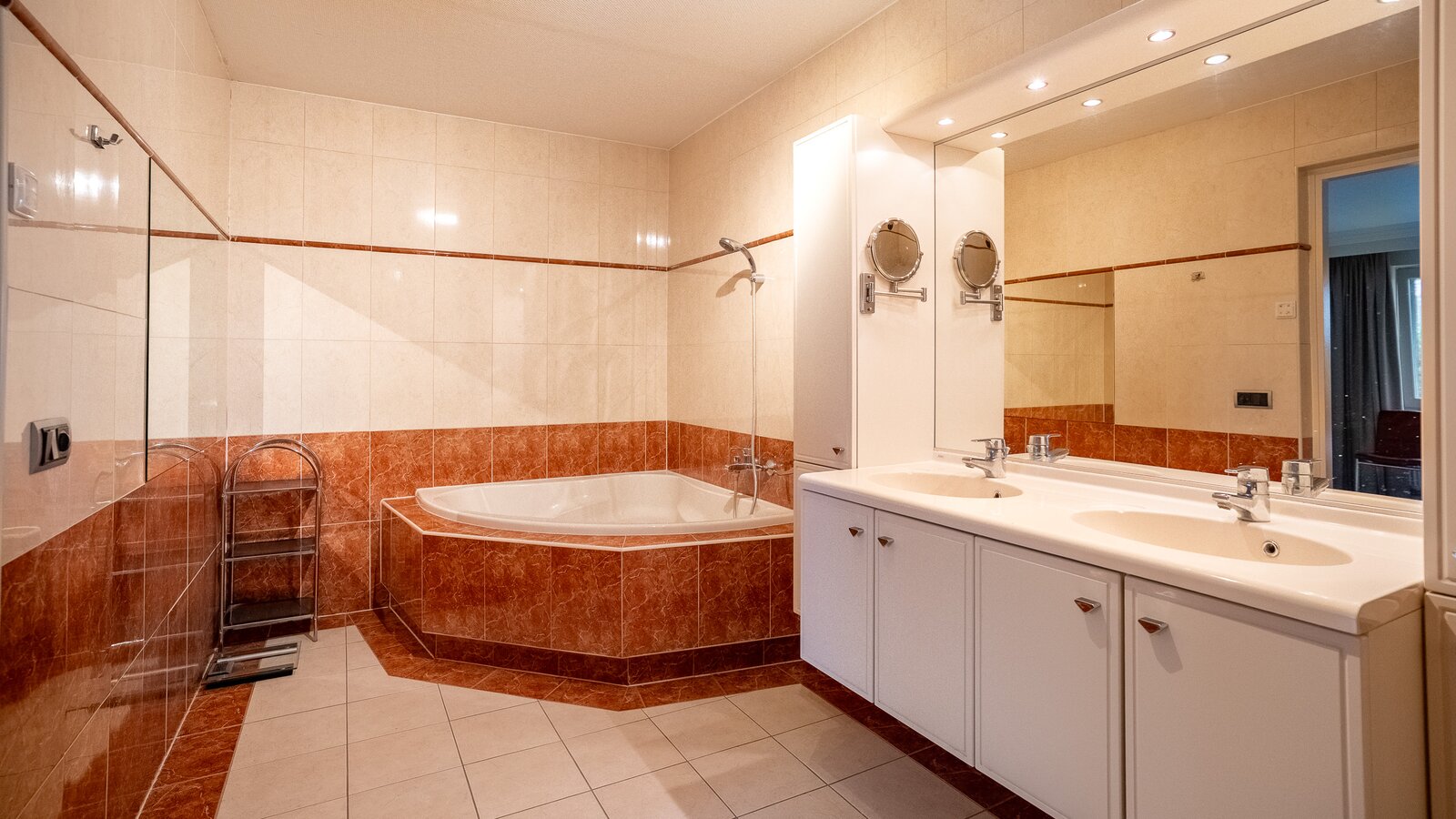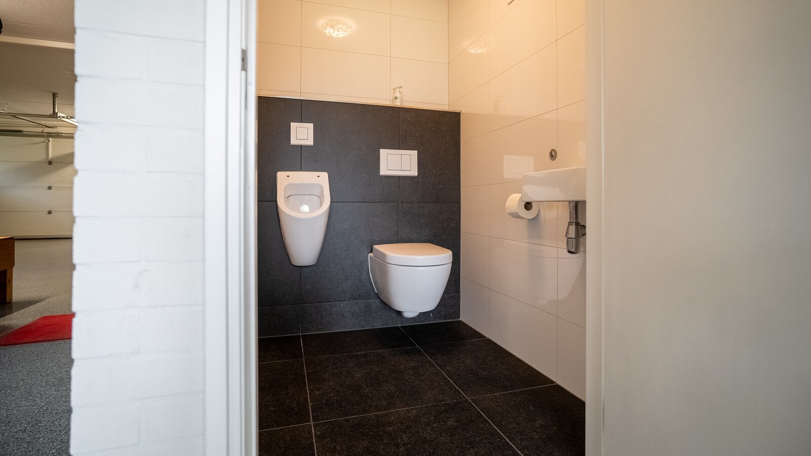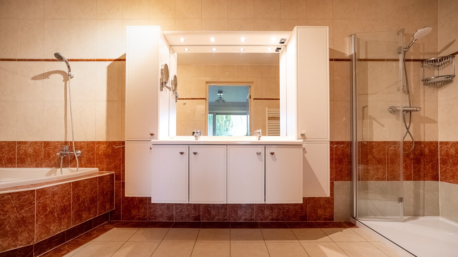 - Voorzien van een dubbele garage met elektrische deuren en een dubbele carport;