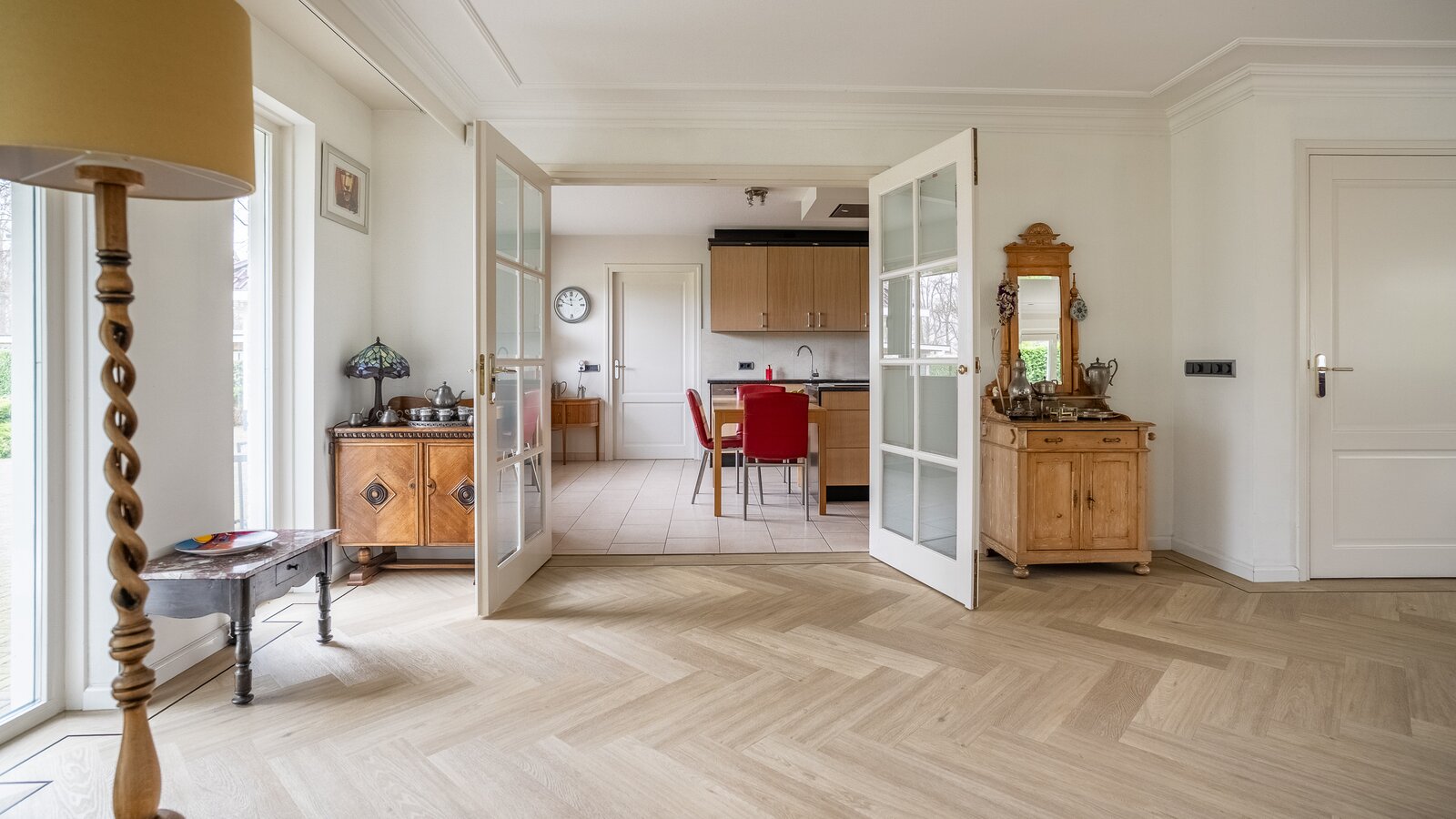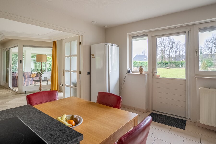 De royale, lichte woonkamer is voorzien van een prachtige in visgraat gelegde pvc-vloer en een sfeervolle haard, wat zorgt voor een warme en stijlvolle uitstraling. Grote raampartijen bieden een prachtig uitzicht op de groene tuin en laten het daglicht rijkelijk binnenstromen. De aangrenzende tuinkamer vormt een heerlijke plek om het hele jaar door te genieten van het uitzicht over de fraai aangelegde achtertuin. Binnen en buiten lopen hier naadloos in elkaar over.