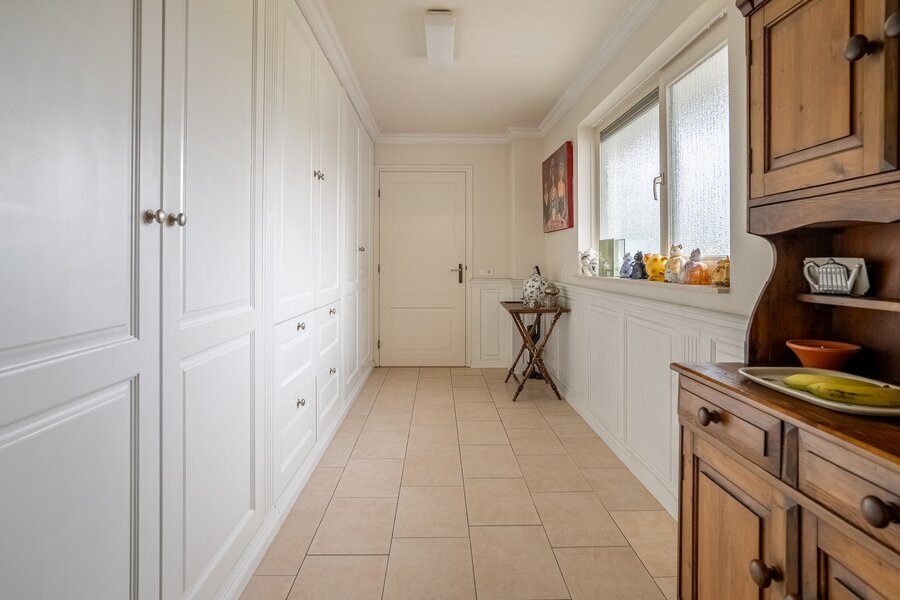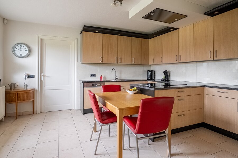 De royale woonkeuken met schiereiland is het hart van het huis: een perfecte plek voor gezellige diners en lange avonden tafelen. Aansluitend bevindt zich een praktische en ruime bijkeuken met volop bergruimte. Achter de bijkeuken en dubbele garage is een grote hobbyruimte met eigen toilet gelegen. De woning is levensloopbestendig dankzij een slaapkamer en badkamer op de begane grond – ideaal voor gelijkvloers wonen of het ontvangen van gasten.