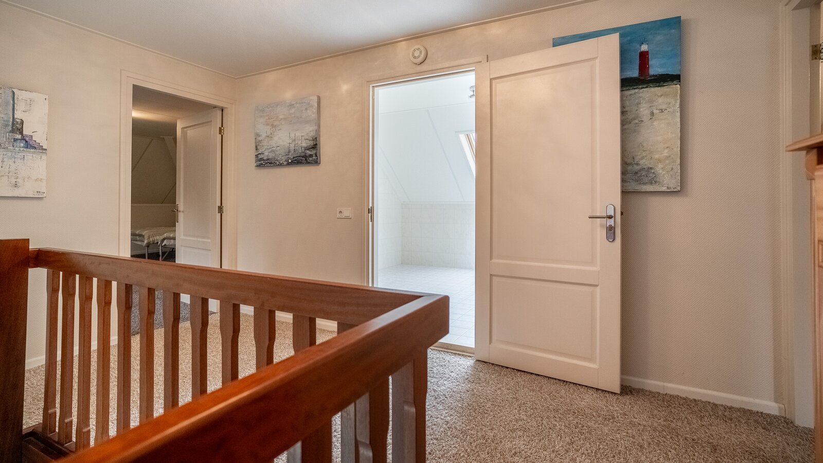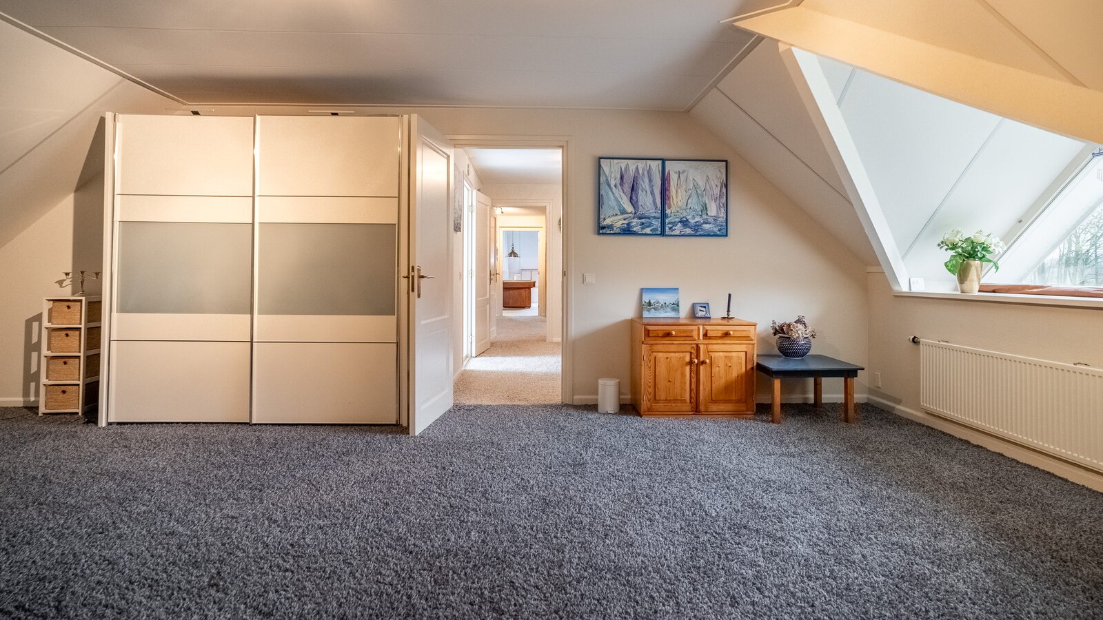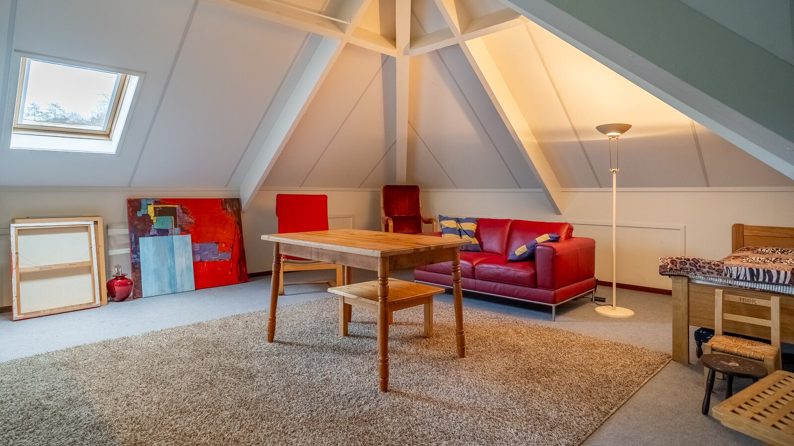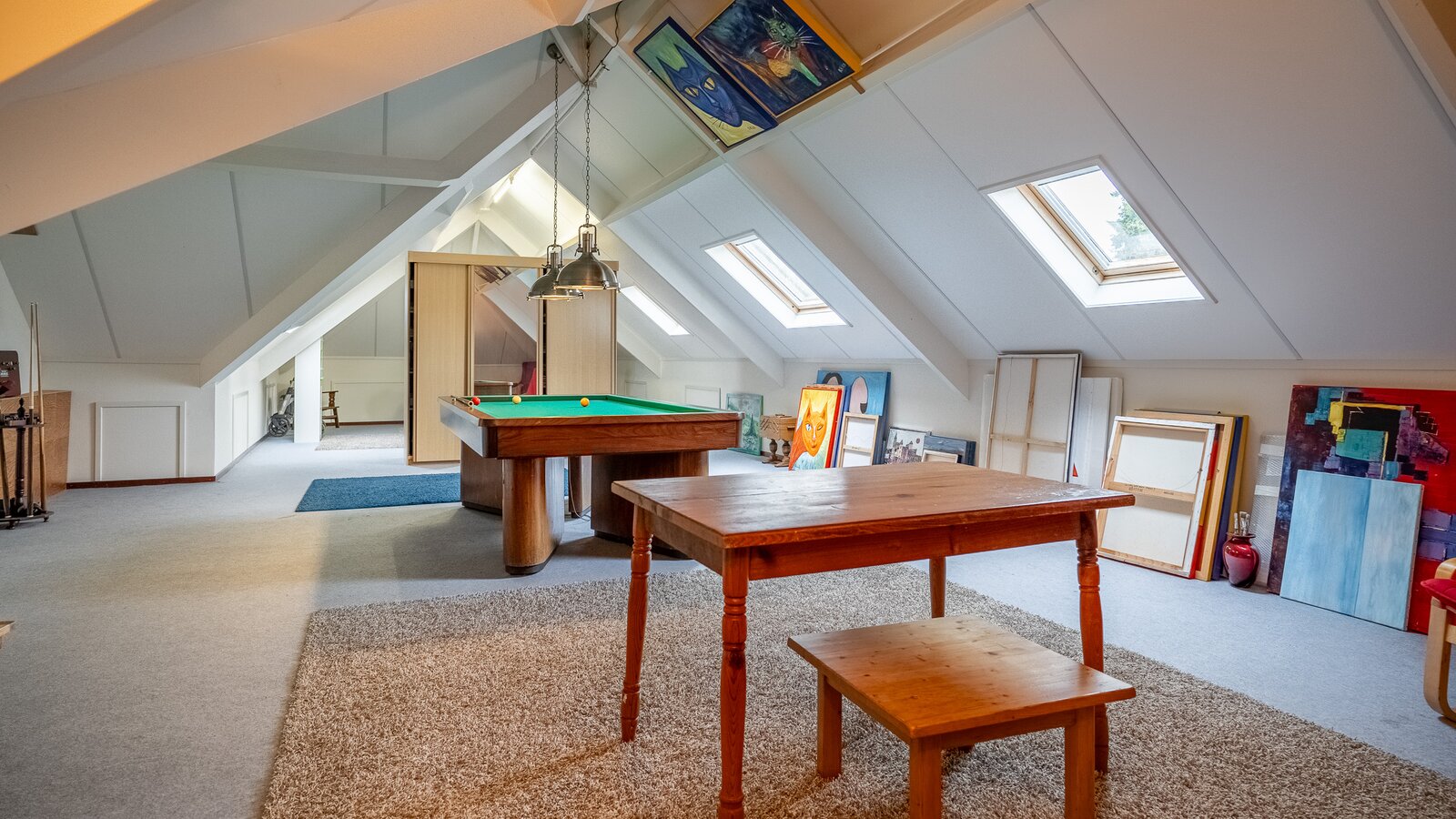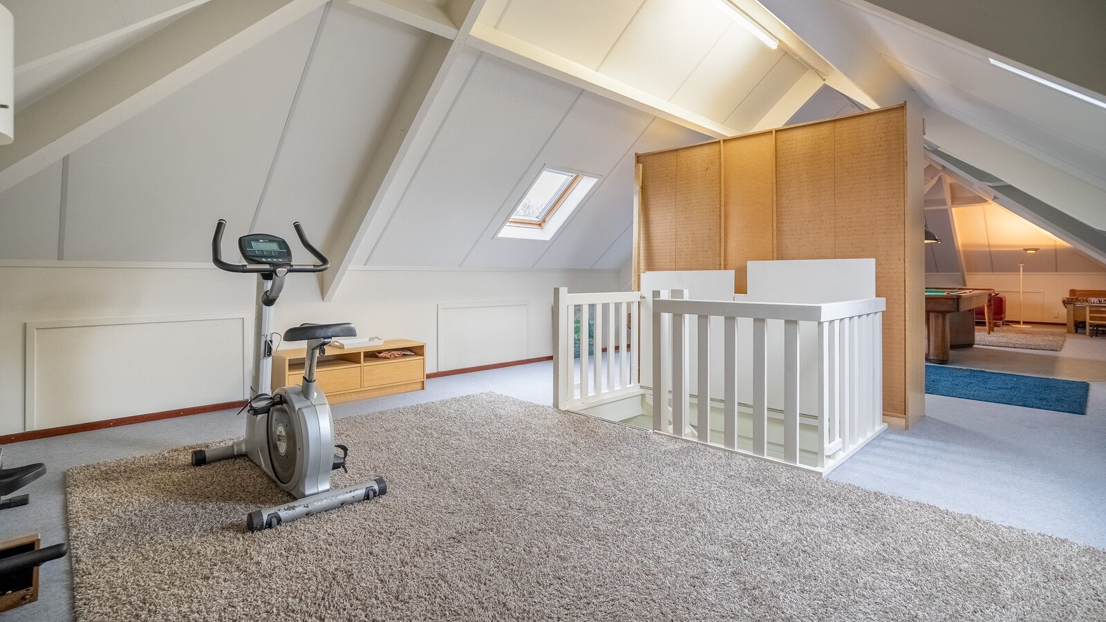 Op de verdieping bevinden zich drie ruime kamers (40, 38, 108 m²), waarvan één momenteel in gebruik is als hobbyruimte. Uiteraard kan deze ruimte eenvoudig worden ingericht als extra slaapkamer, werkkamer of speelkamer . De royale opzet biedt volop flexibiliteit voor diverse woonwensen.