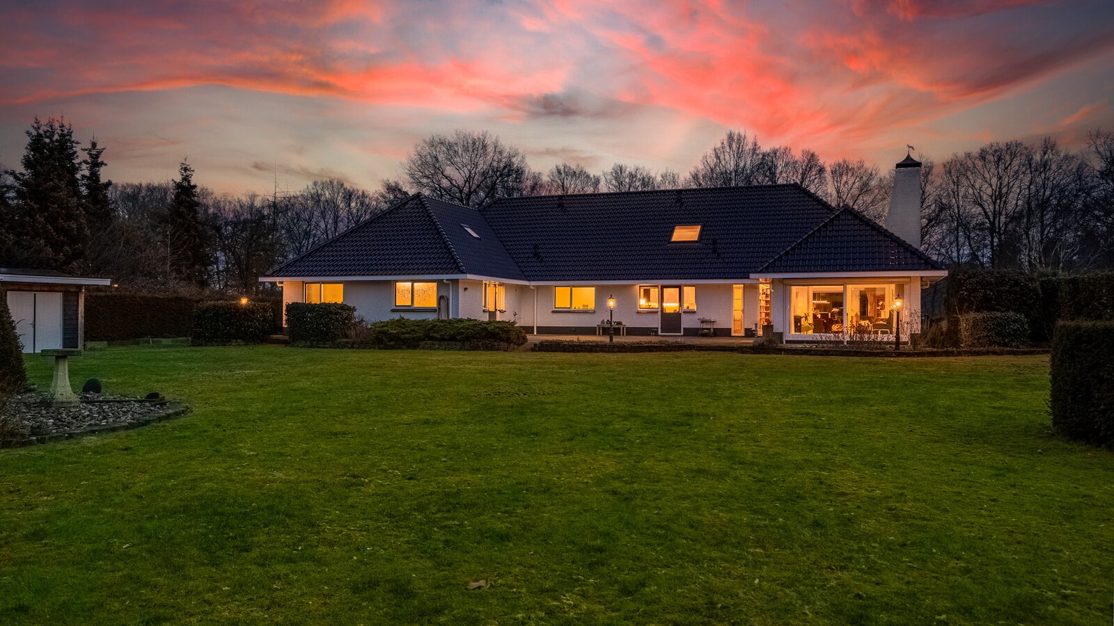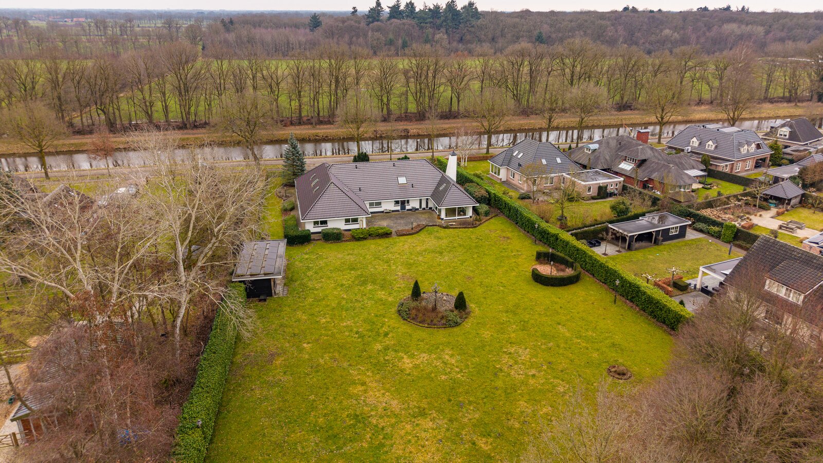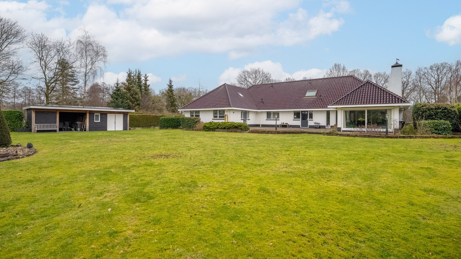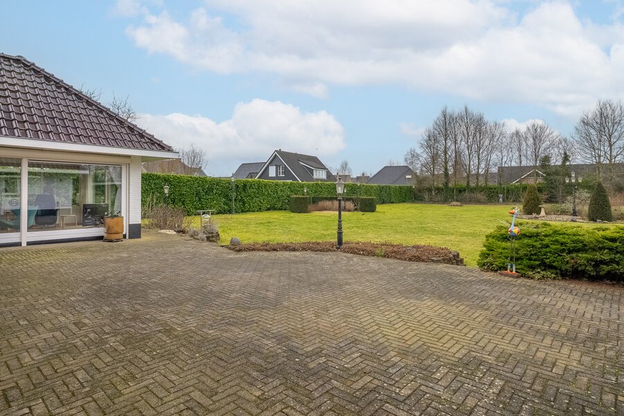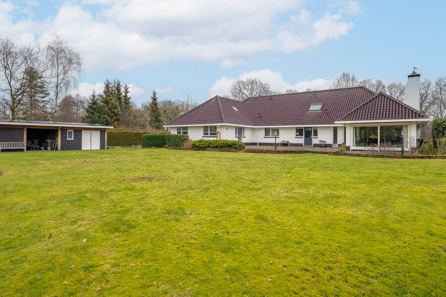 De royale achtertuin met zonnig terras biedt optimale privacy en beschikt over een overkapping en een houten berging. Het royale perceel van bijna 4.000 m² zorgt voor een oase van rust en ruimte – een zeldzame combinatie met de ligging aan het kanaal en het omliggende groen.