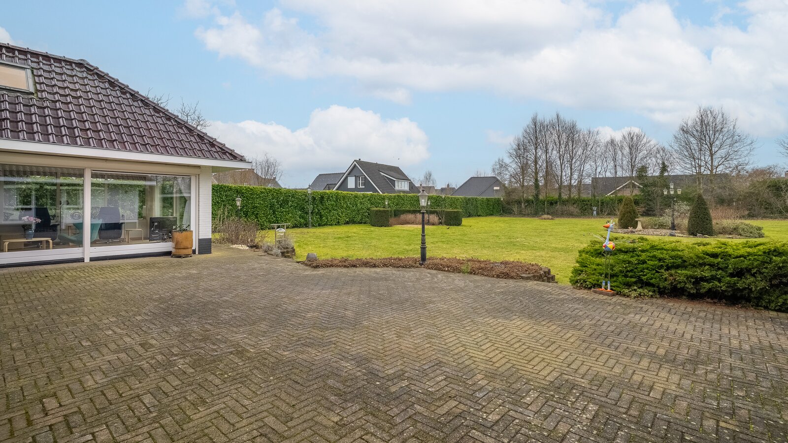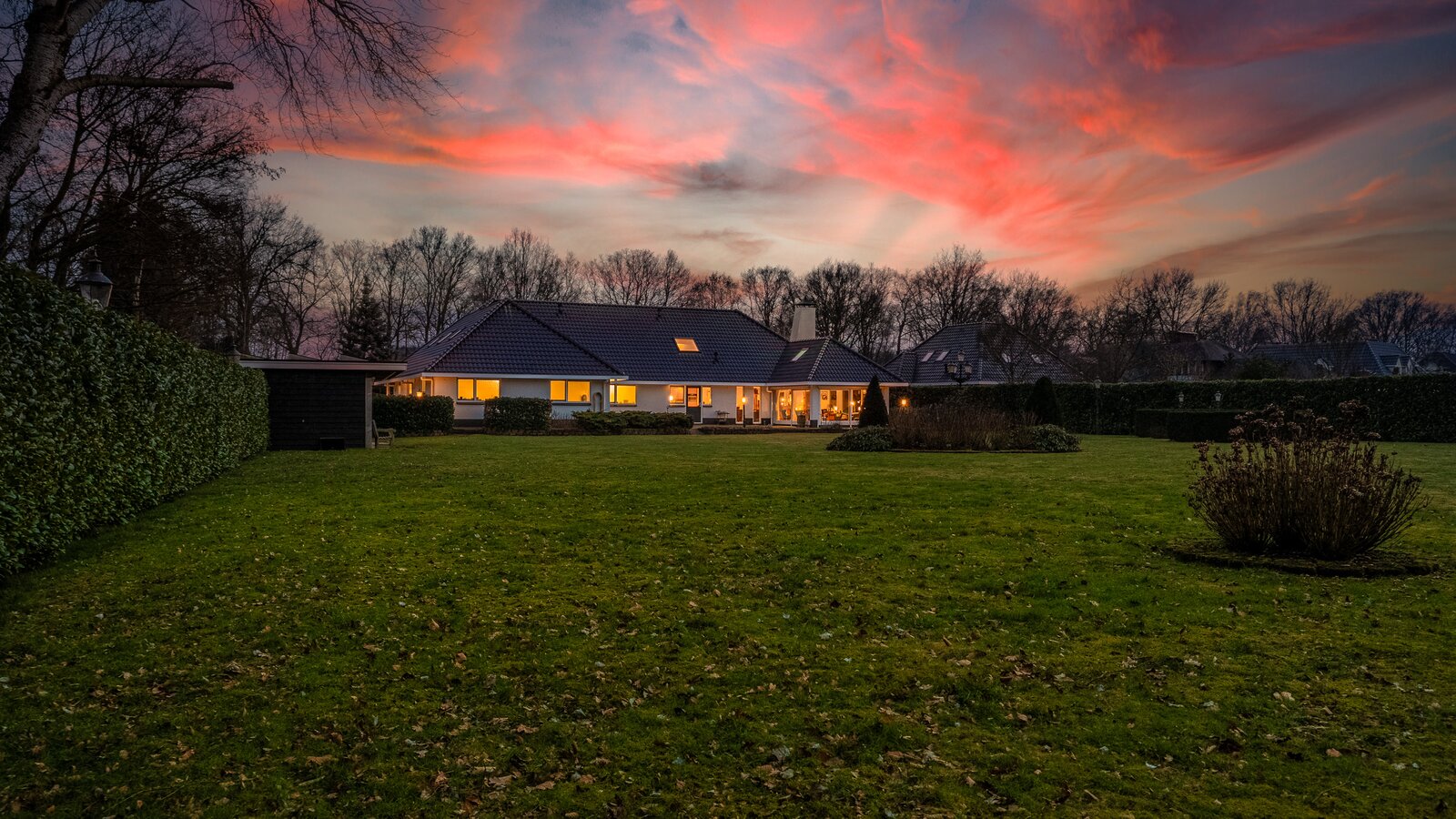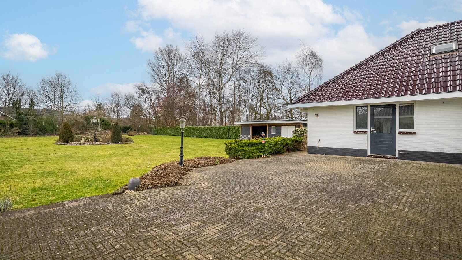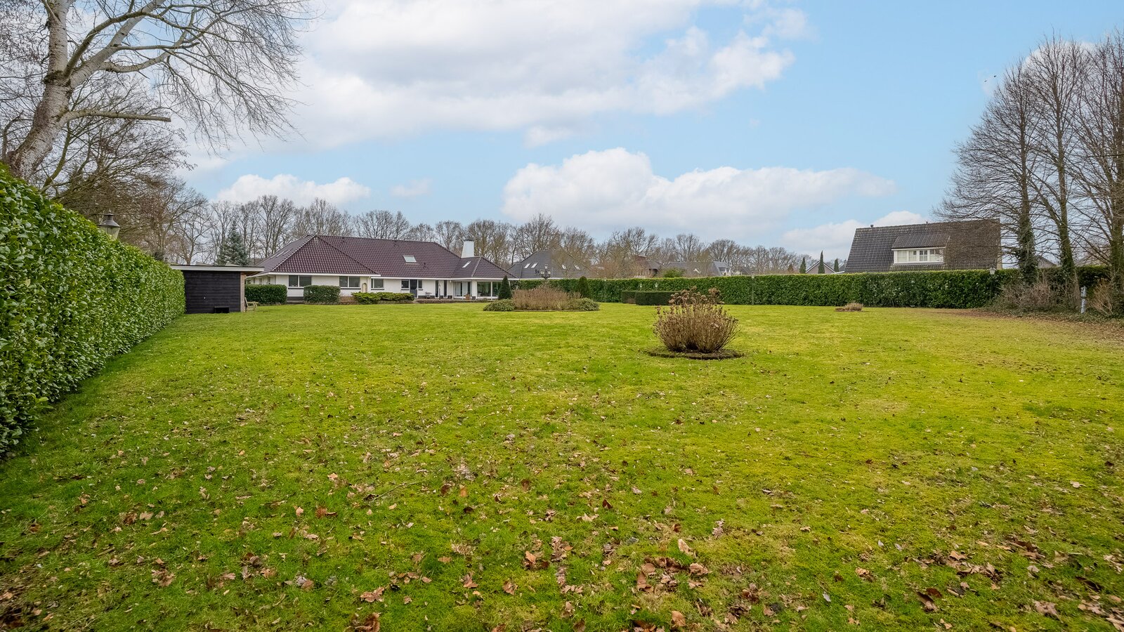 De royale achtertuin met zonnig terras biedt optimale privacy en beschikt over een overkapping en een houten berging. Het royale perceel van bijna 4.000 m² zorgt voor een oase van rust en ruimte – een zeldzame combinatie met de ligging aan het kanaal en het omliggende groen.