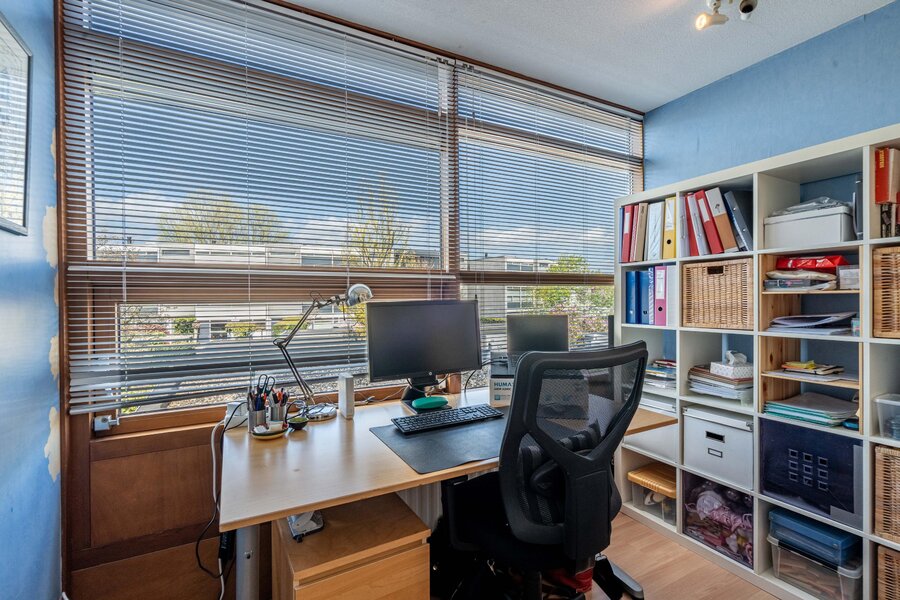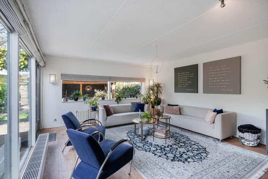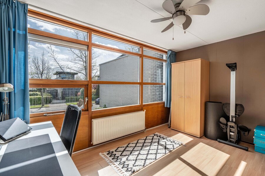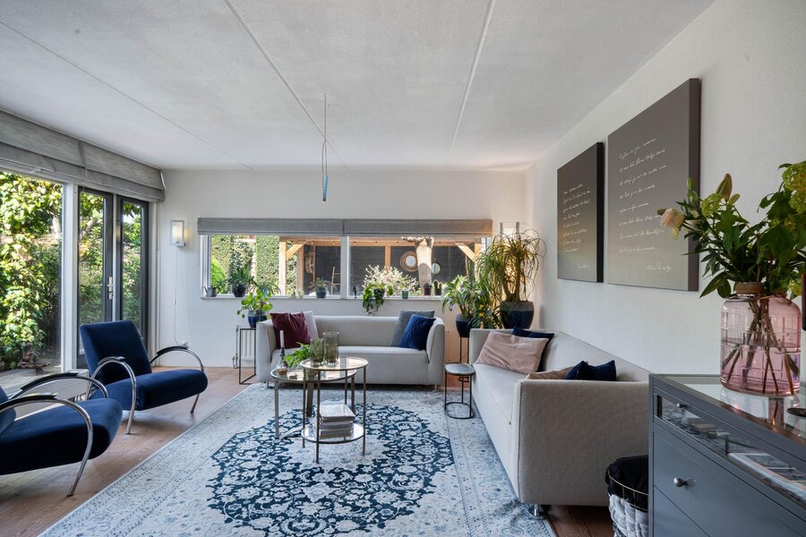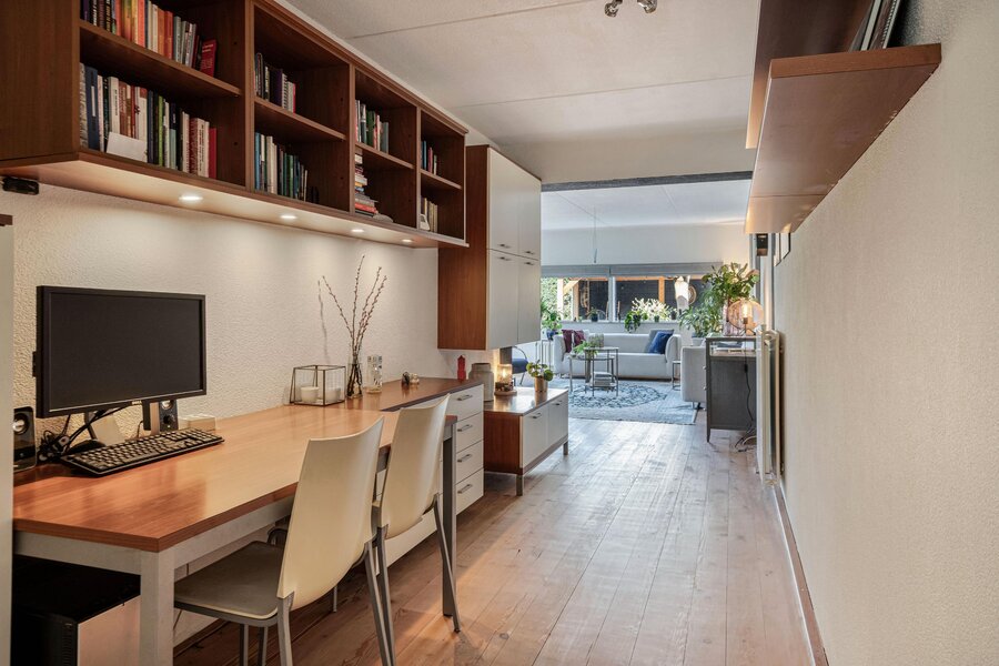Loop je verder links langs de keuken naar de achterzijde, dan kom je bij een gezellige werkplek. Aansluitend de woonkamer, met ook hier ramen van vloer tot plafond die de tuin naar binnen halen. De brede ramen op zithoogte zorgen voor een speels effect en geven het geheel extra karakter. Via de openslaande deuren stap je zo het groen in.