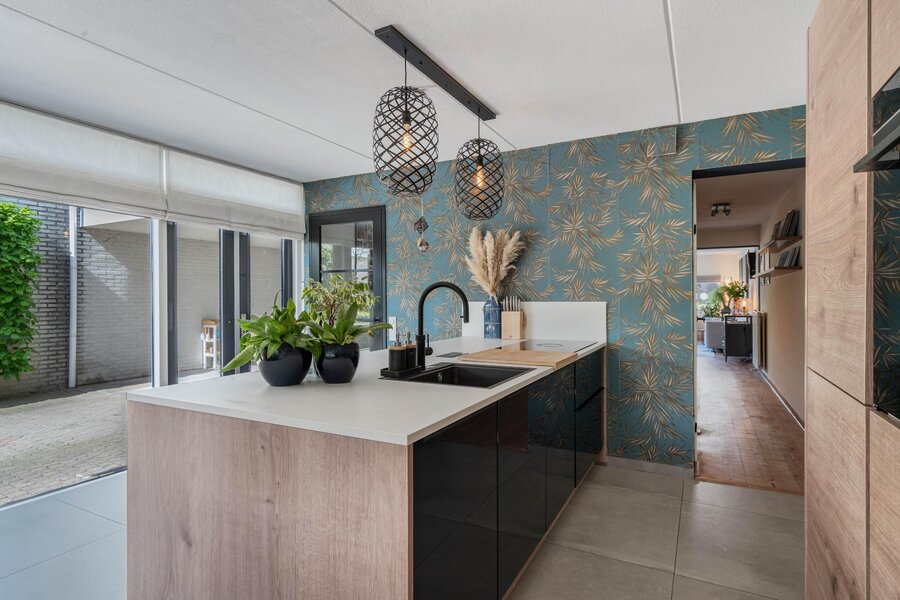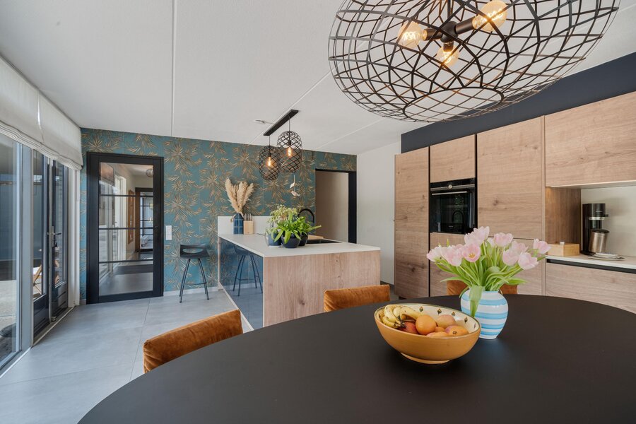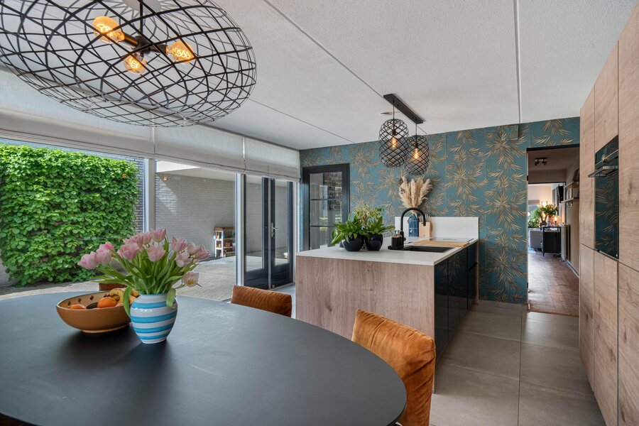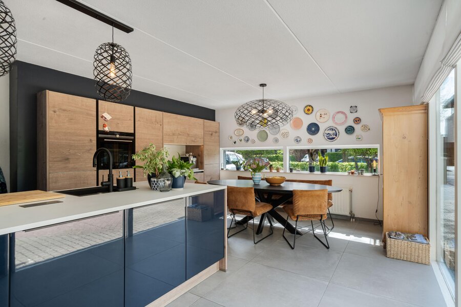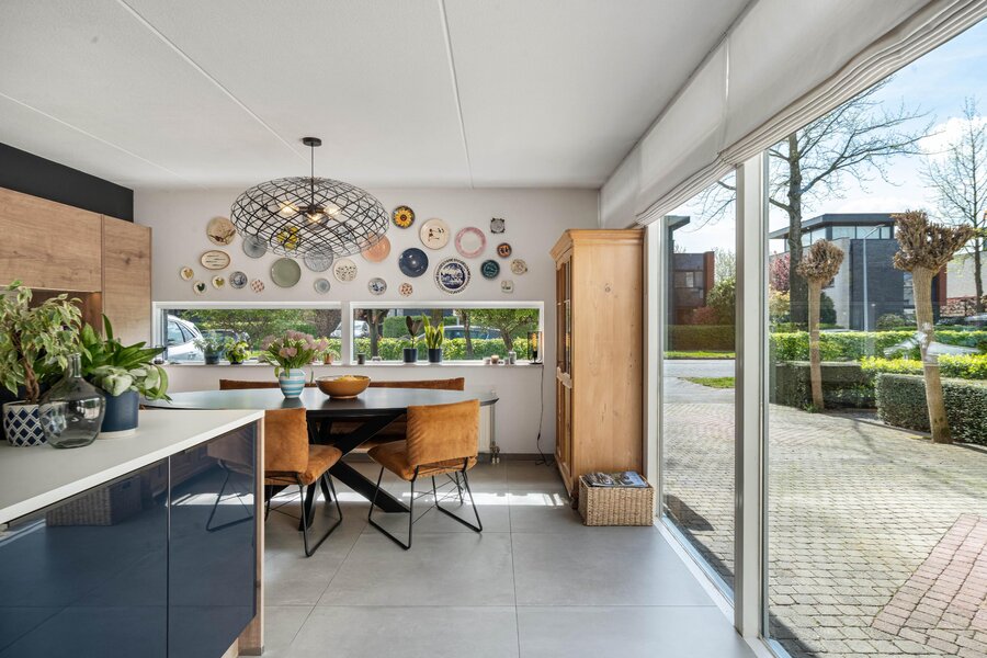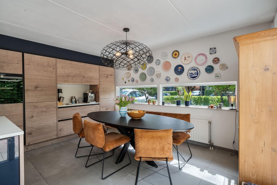 Ga je rechtsaf, dan kom je in de woonkeuken. Hier voel je meteen de energie van dit huis: licht, lucht en ruimte, versterkt door de vele raampartijen die grotendeels van vloer tot plafond reiken. De keuken met kookeiland is komt uit 2020 en is voorzien van alle benodigde apparatuur: vaatwasser, Quooker, stoomoven, inductie kookplaat met afzuiging, koel-vriescombinatie. Er is alle ruimte voor een royale eettafel en openslaande deuren naar de voortuin.