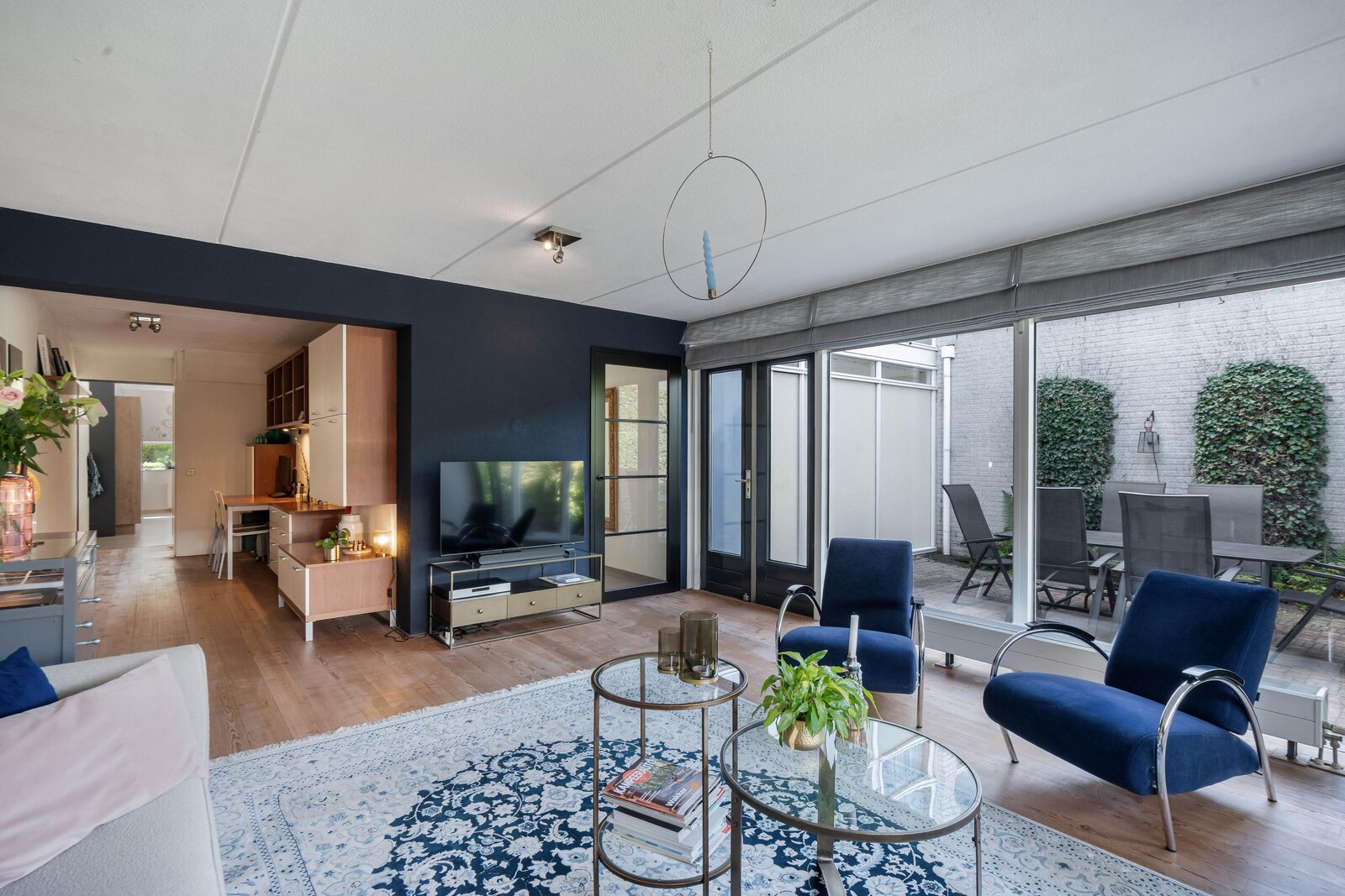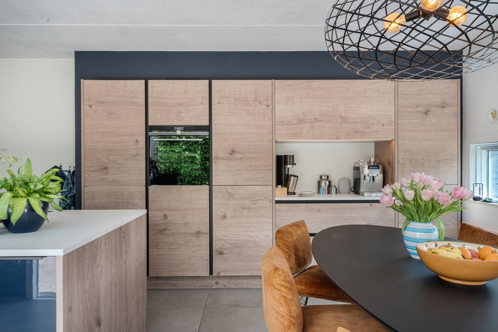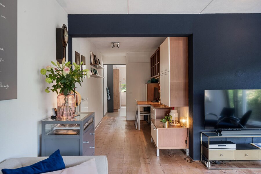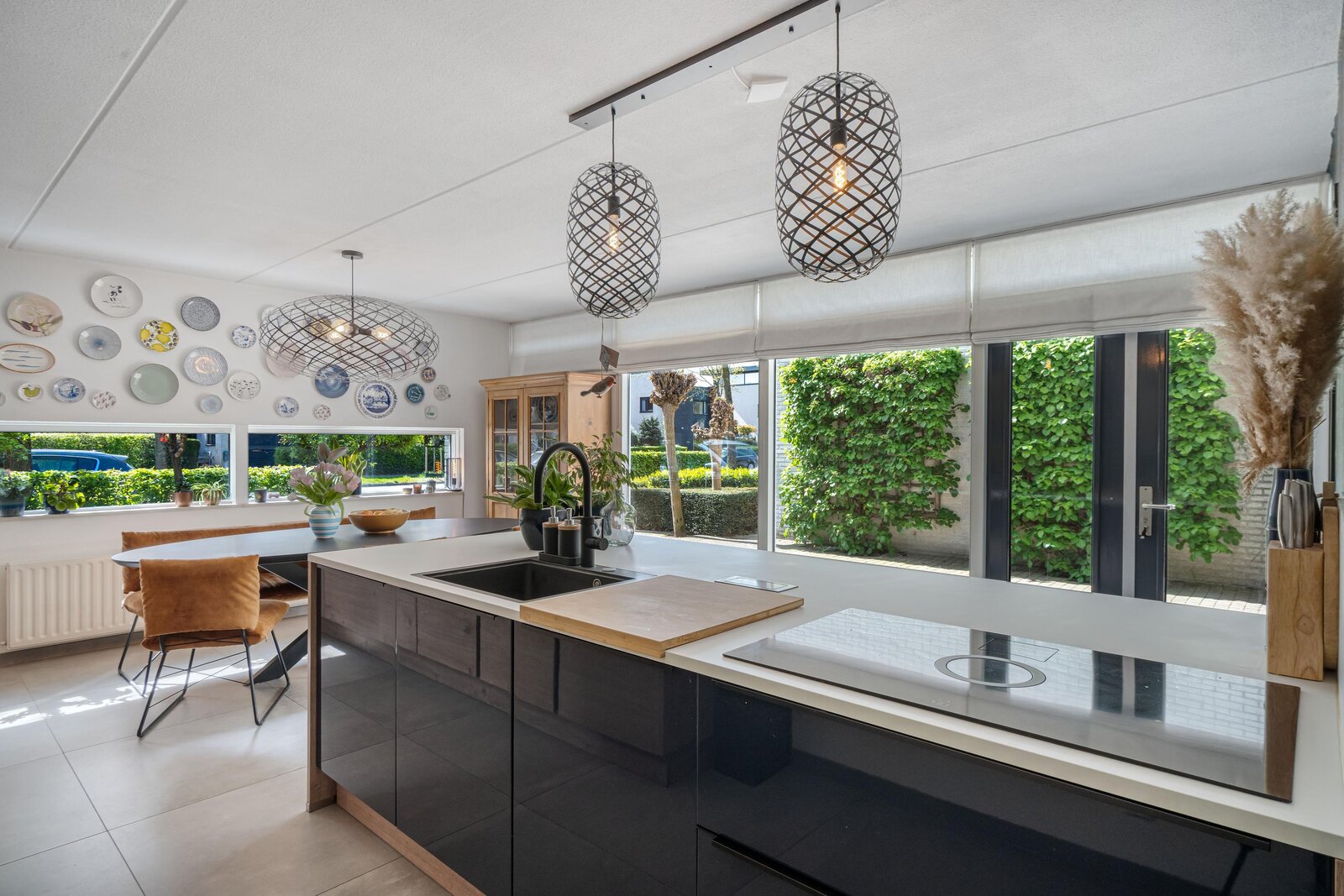 Ga je rechtsaf, dan kom je in de woonkeuken. Hier voel je meteen de energie van dit huis: licht, lucht en ruimte, versterkt door de vele raampartijen die grotendeels van vloer tot plafond reiken. De keuken met kookeiland is komt uit 2020 en is voorzien van alle benodigde apparatuur: vaatwasser, Quooker, stoomoven, inductie kookplaat met afzuiging, koel-vriescombinatie. Er is alle ruimte voor een royale eettafel en openslaande deuren naar de voortuin.