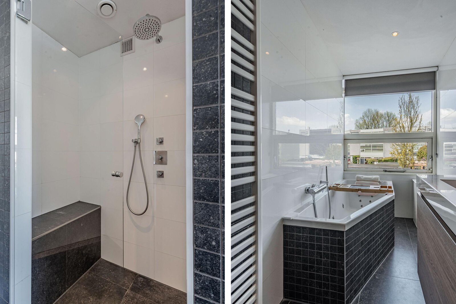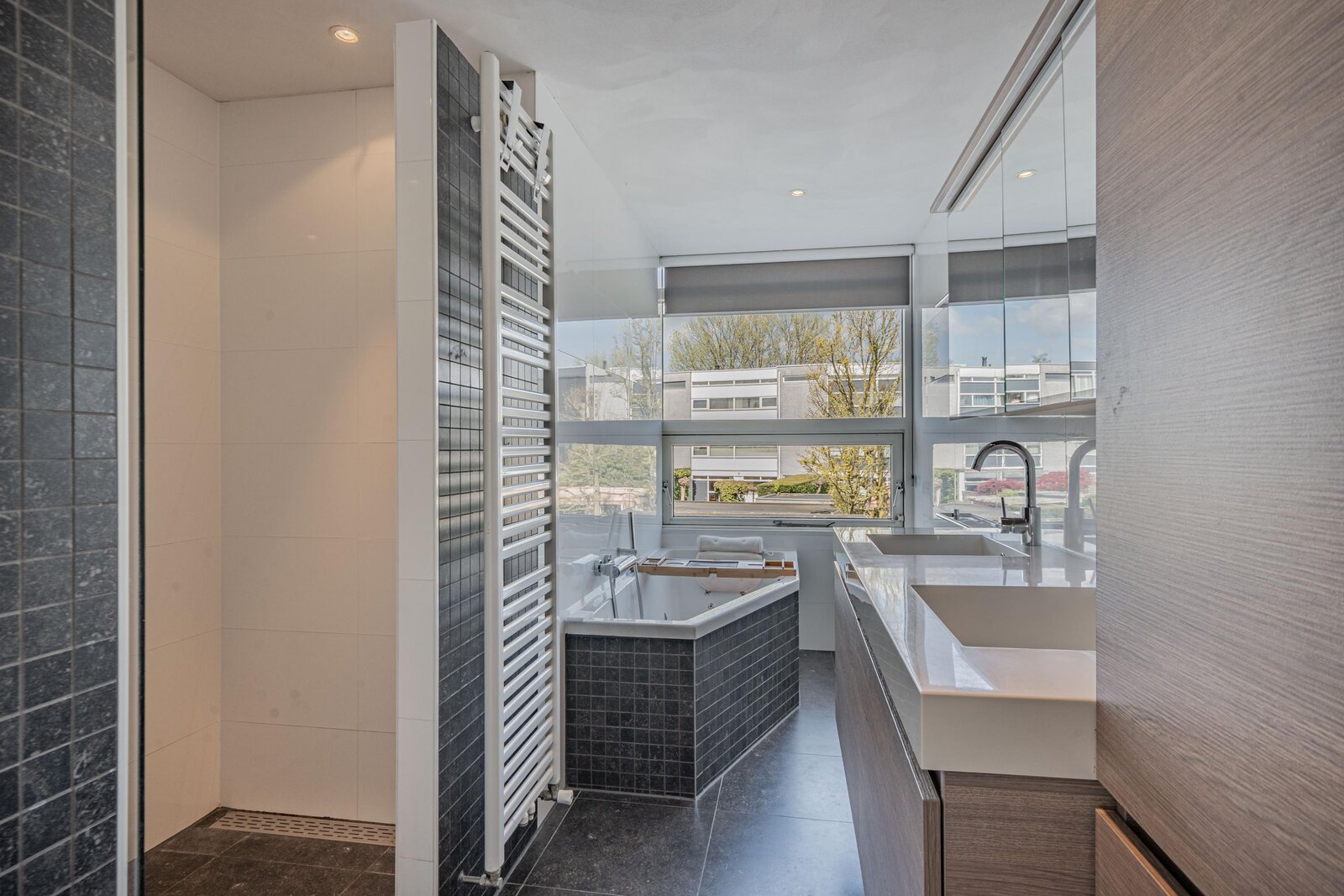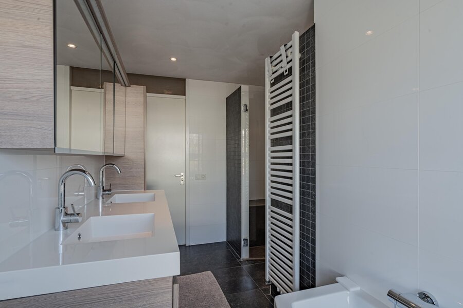 overloop met toilet en stookruimte, 5 goede slaapkamers en een royale badkamer. De badkamer is voorzien van dubbele wastafel, een royale inloopdouche, en een whirlpool ligbad.