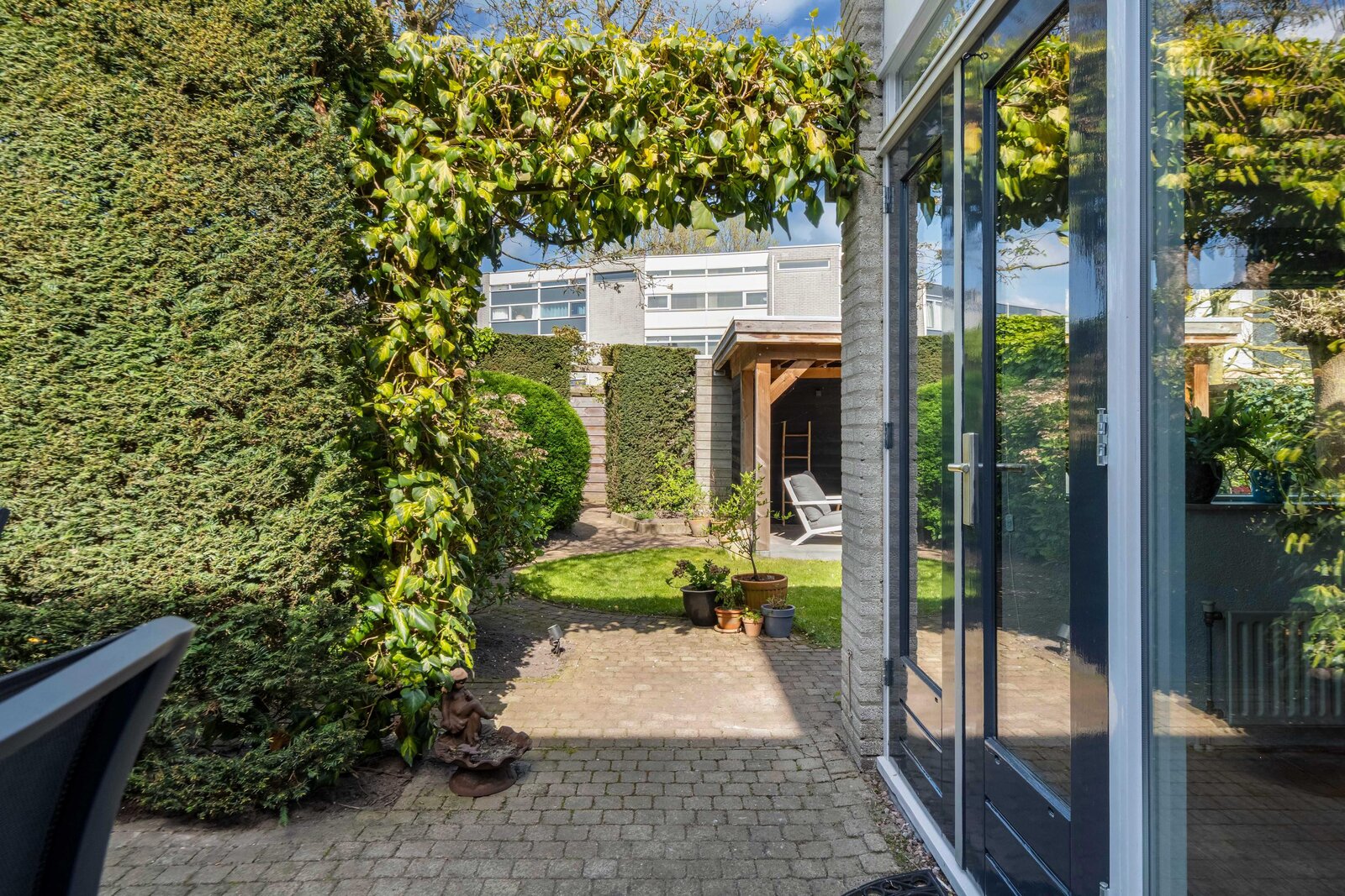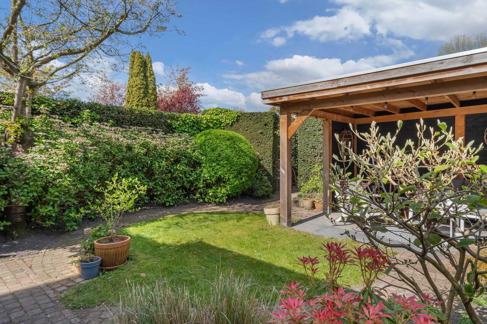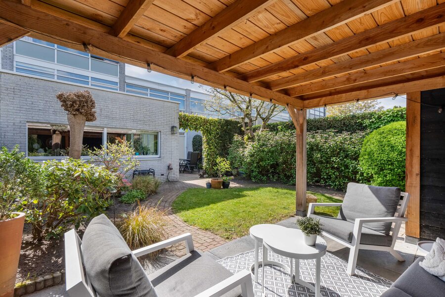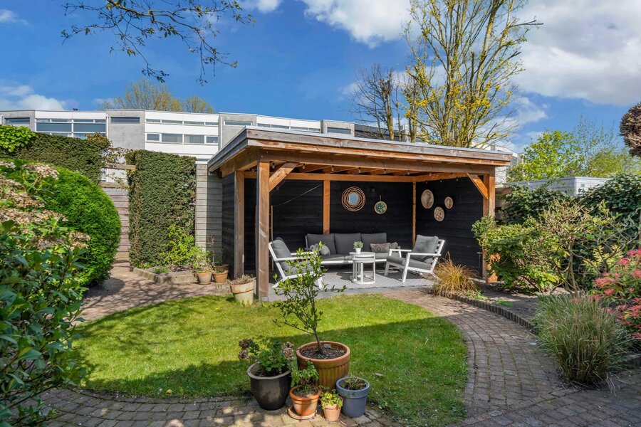 De tuin heerlijk groen en verrassend veelzijdig. U kunt naast de woonkamer dineren en daarna in de avond onder de overkapping heerlijk loungen. Noordwest gelegen, dus de hele middag en avond de zon.