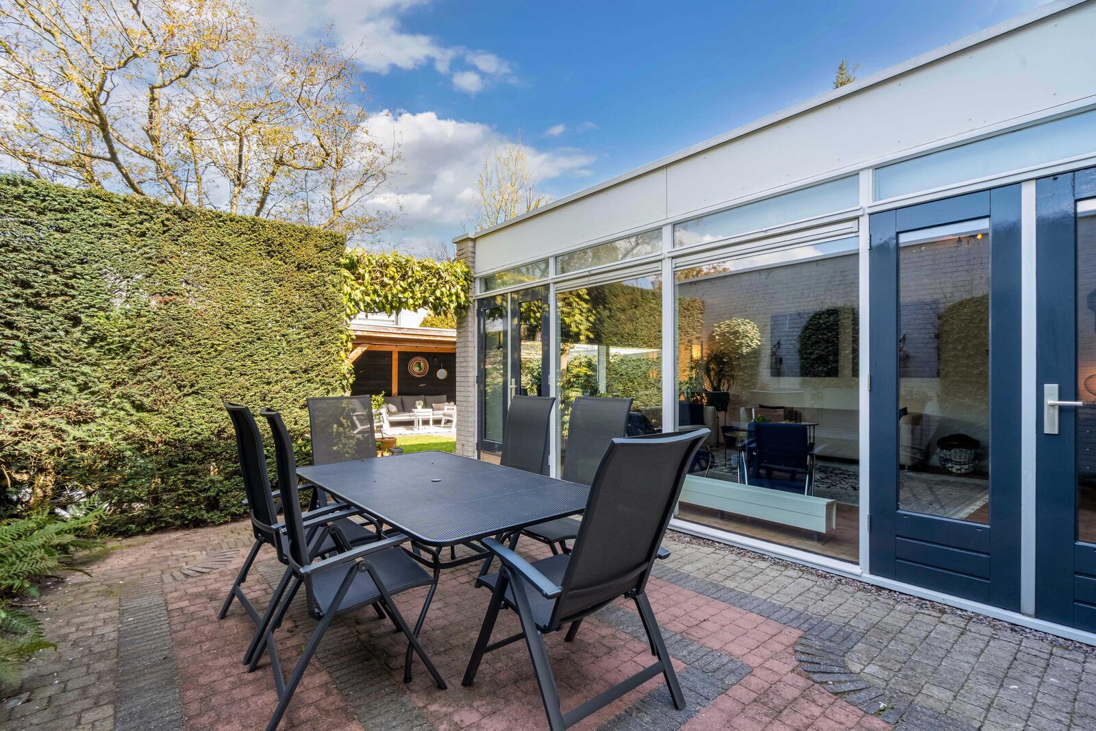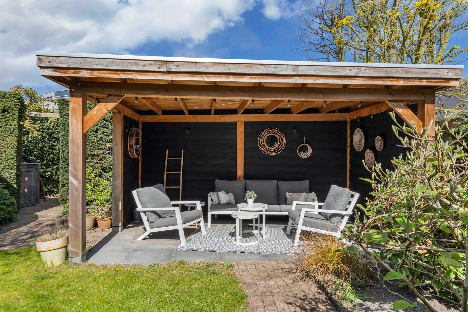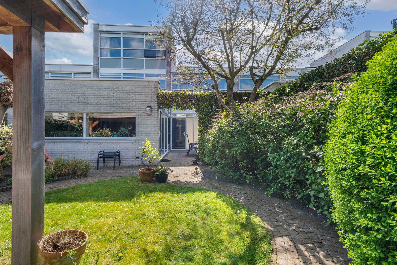 De tuin heerlijk groen en verrassend veelzijdig. U kunt naast de woonkamer dineren en daarna in de avond onder de overkapping heerlijk loungen. Noordwest gelegen, dus de hele middag en avond de zon.
