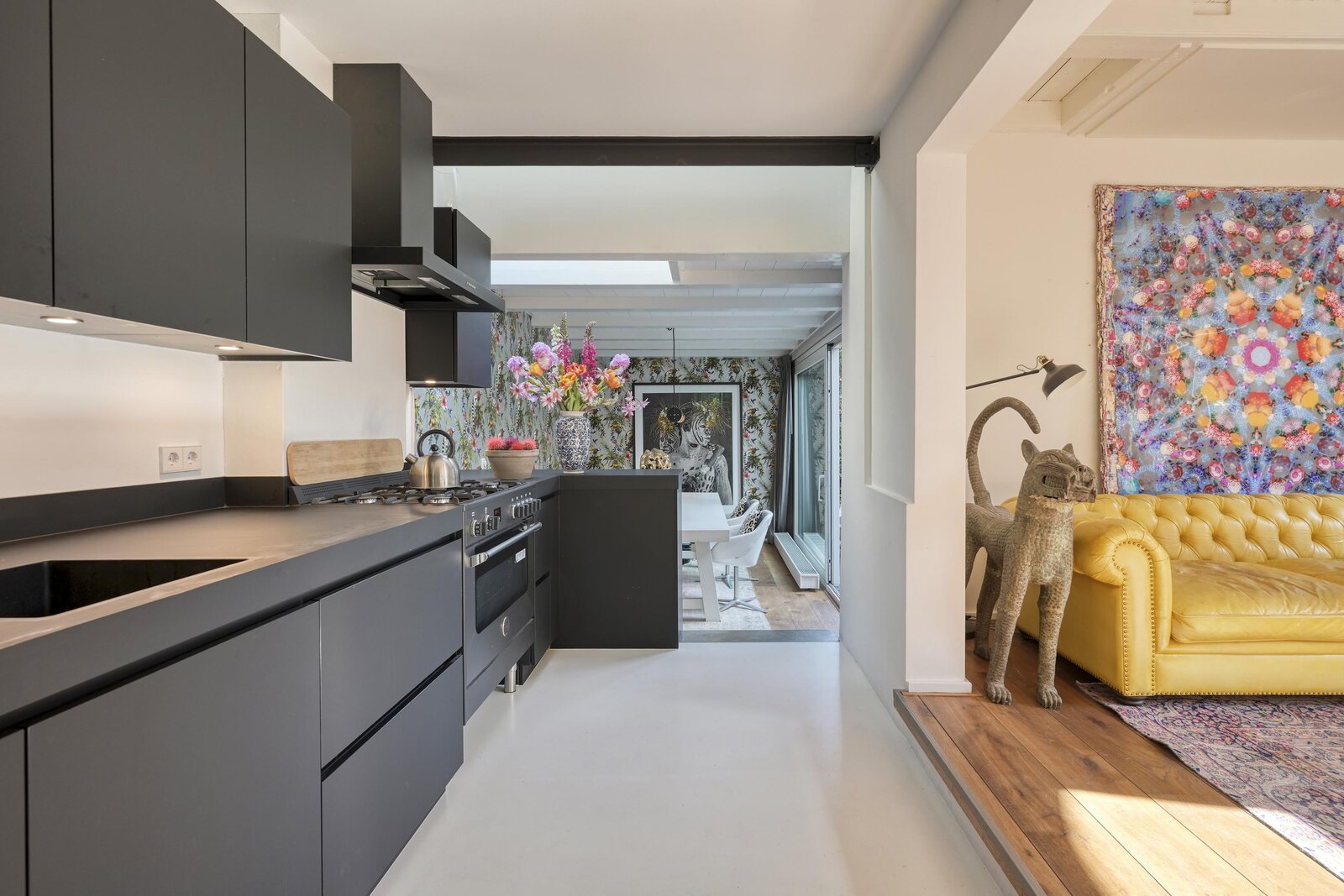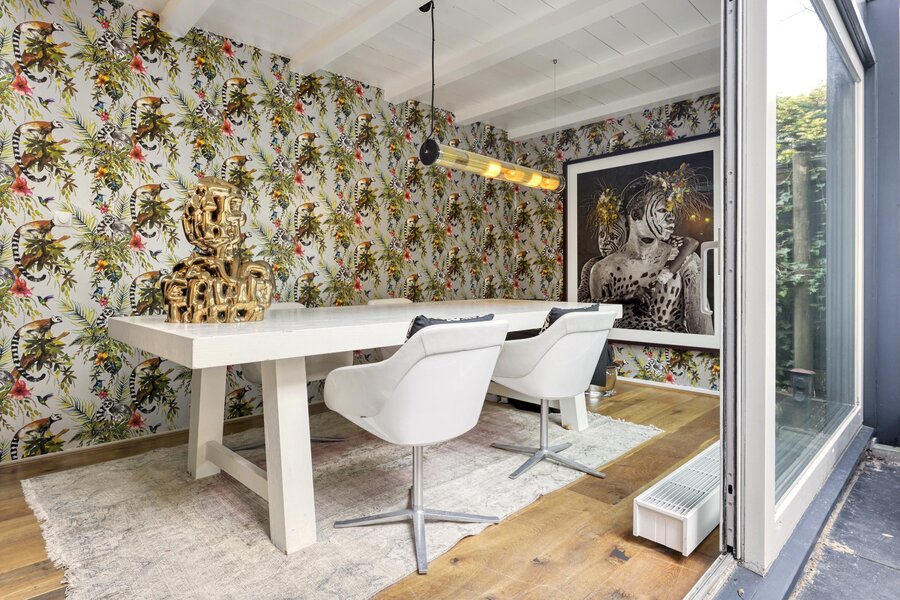 The adjoining extension is bright and spacious, forming a natural continuation of the living area. There is ample room for a generous dining table — perfect for dinners and long evenings with friends, overlooking the greenery. Thanks to the large sliding glass doors, inside and outside blend seamlessly. Here, you experience peace in the heart of the city.