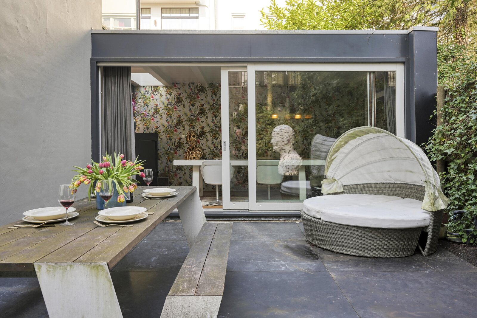 De tuin is groen, beschut en voelt als een verlengstuk van de woning. Opvallend stil voor deze locatie, met het geluid van vogels als dagelijkse achtergrond — midden in de stad.