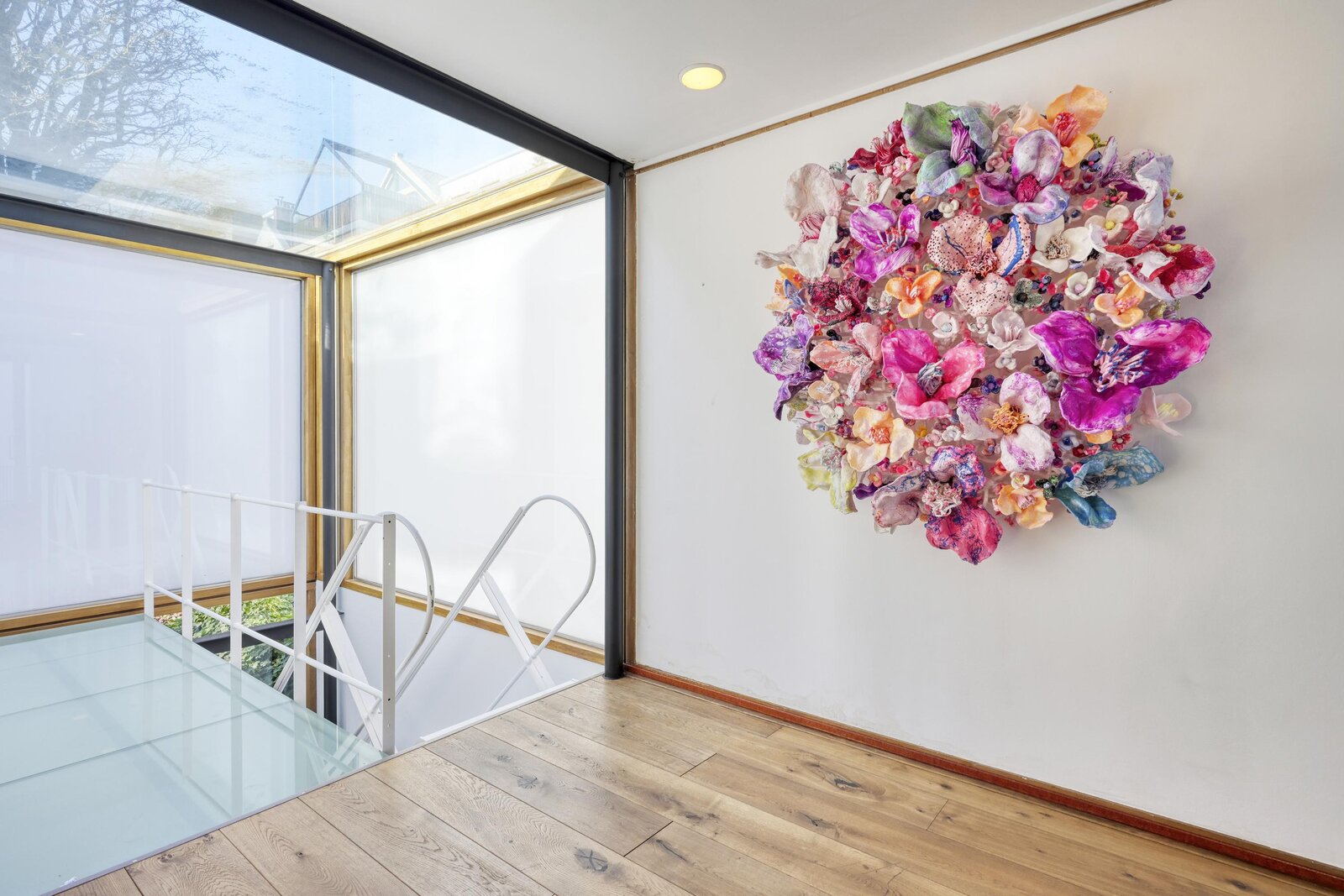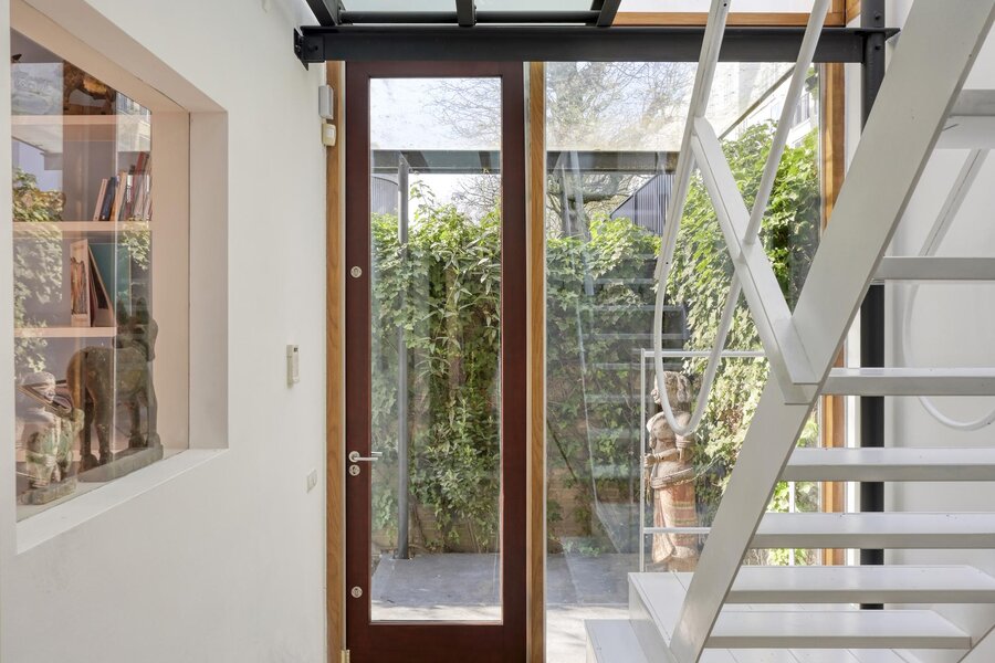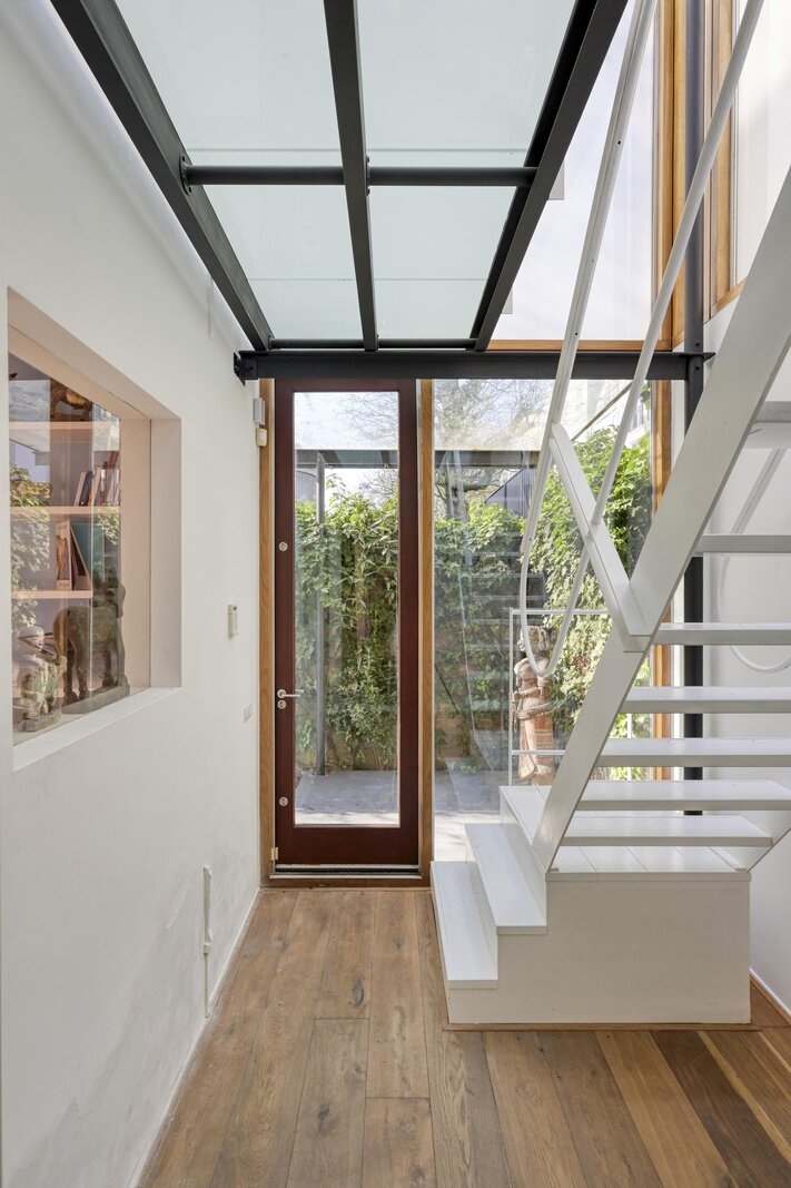 Via de stalen trap bereik je de eerste verdieping, waar het glas opnieuw zorgt voor een prettige lichtinval.