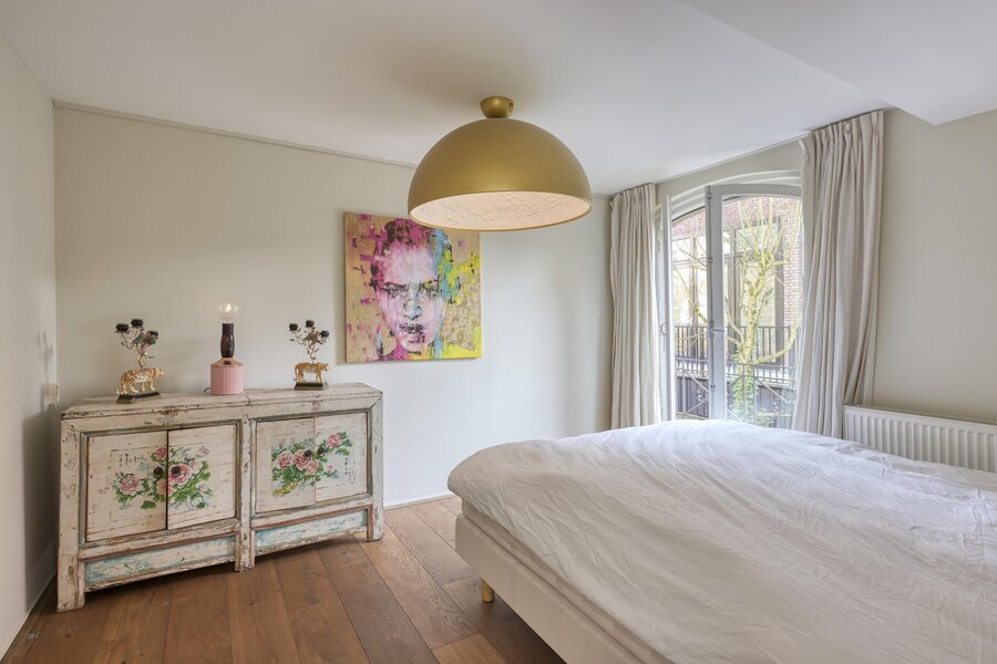 De hoofdslaapkamer kijkt uit op het Vondelpark en beschikt over Franse balkons. De hoge plafonds en zichtbare houten balken geven de ruimte karakter en warmte.