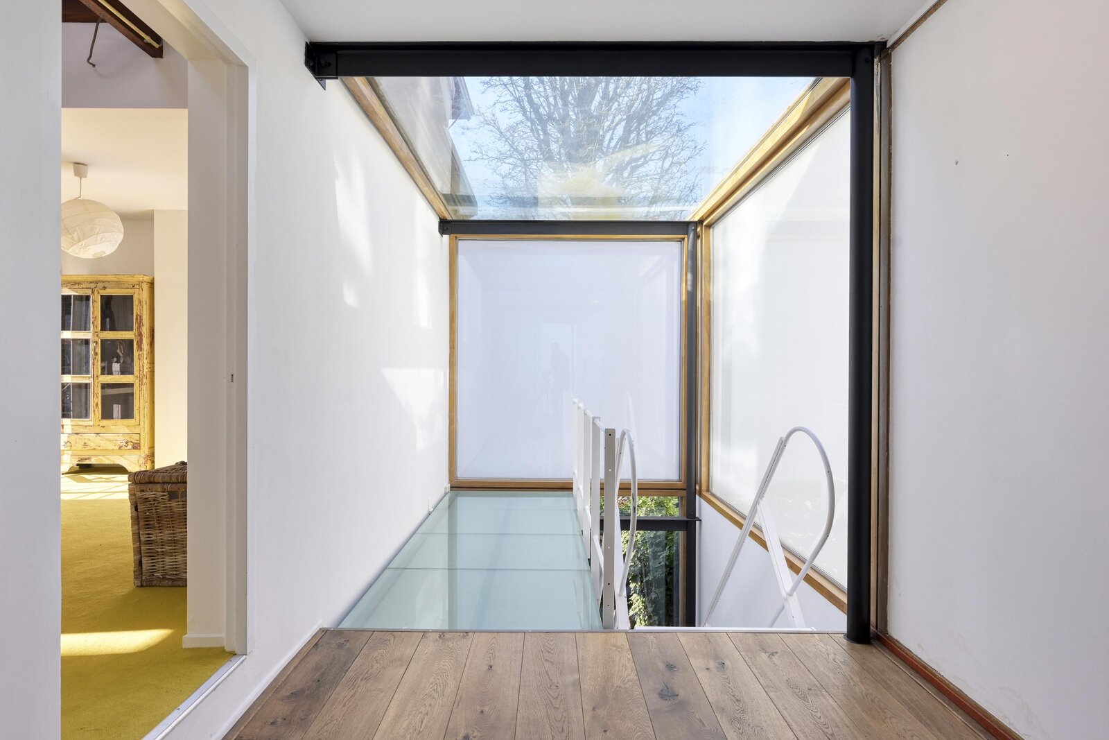Via the steel staircase, you reach the first floor, where glass once again ensures pleasant natural light.