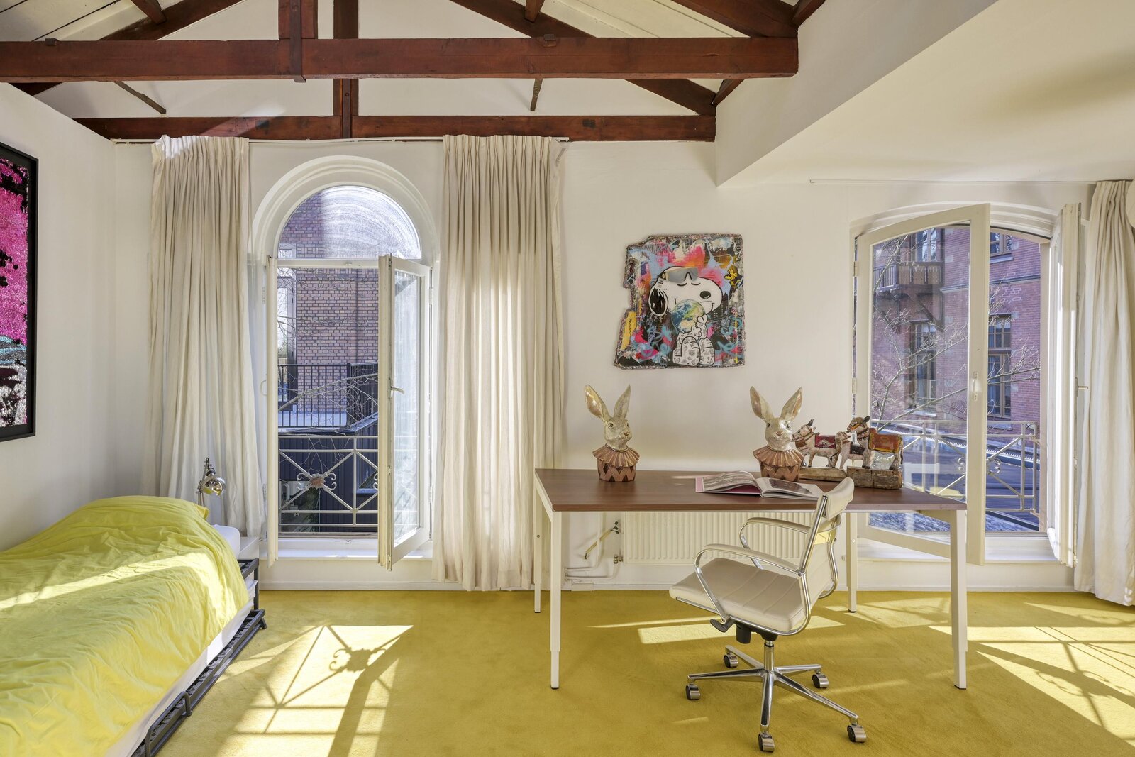 The principal bedroom overlooks the Vondelpark and features French balconies. The high ceilings and exposed wooden beams give the room warmth and character.