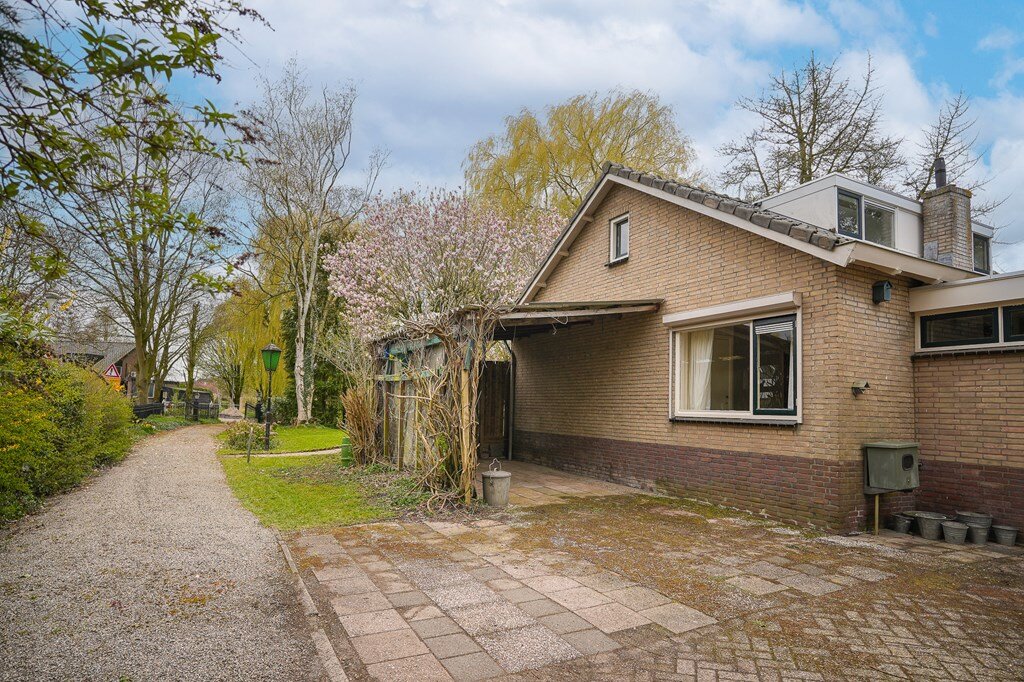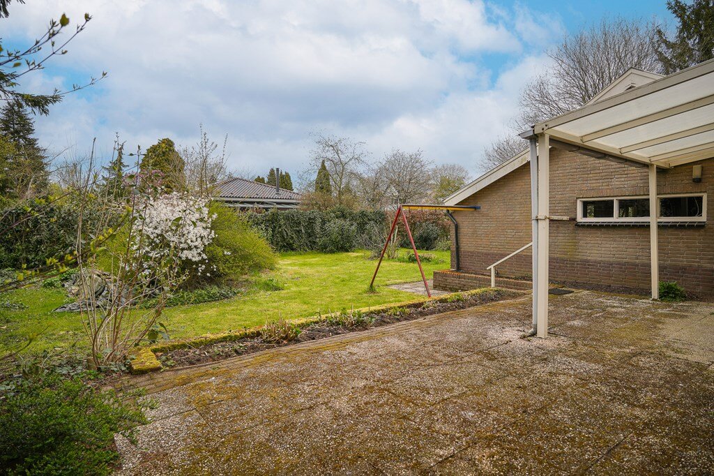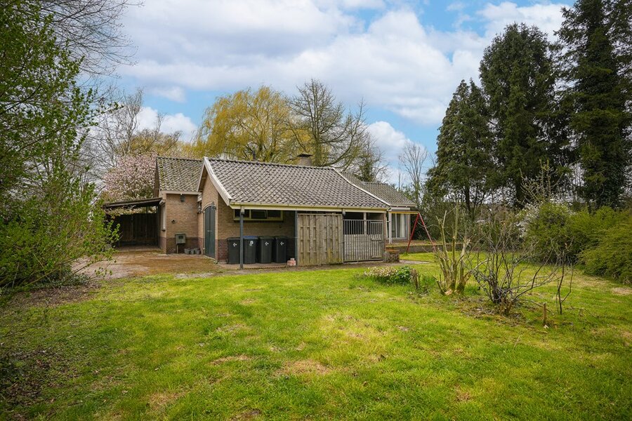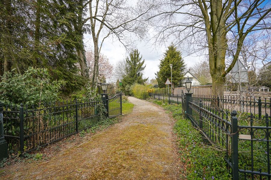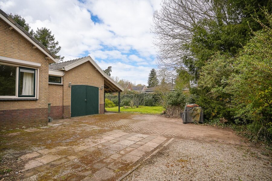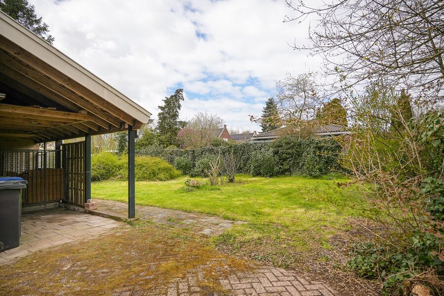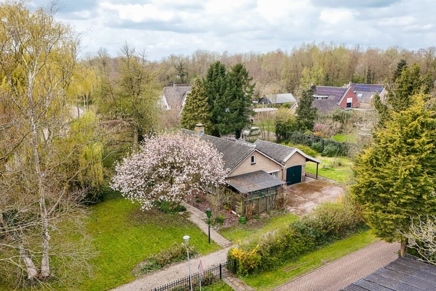 Het perceel is groot, groen en omgeven door volwassen beplanting. De tuin geeft privacy aan alle kanten. Dit is wat buiten wonen in een dorp is. Het perceel loopt rondom de woning en is diep genoeg om overal een fijne plek te vinden: volle zon, schaduw onder de grote bomen, of beschut op het terras direct aan de woonkamer. De lange oprit door de voortuin zorgt ervoor dat de woning op afstand van de weg ligt. Dat geeft rust en privacy, ook al woon je midden in het dorp. De magnolia aan de voorzijde bepaalt het beeld zodra je het erf oprijdt — een boom die in het voorjaar voor zichzelf spreekt.