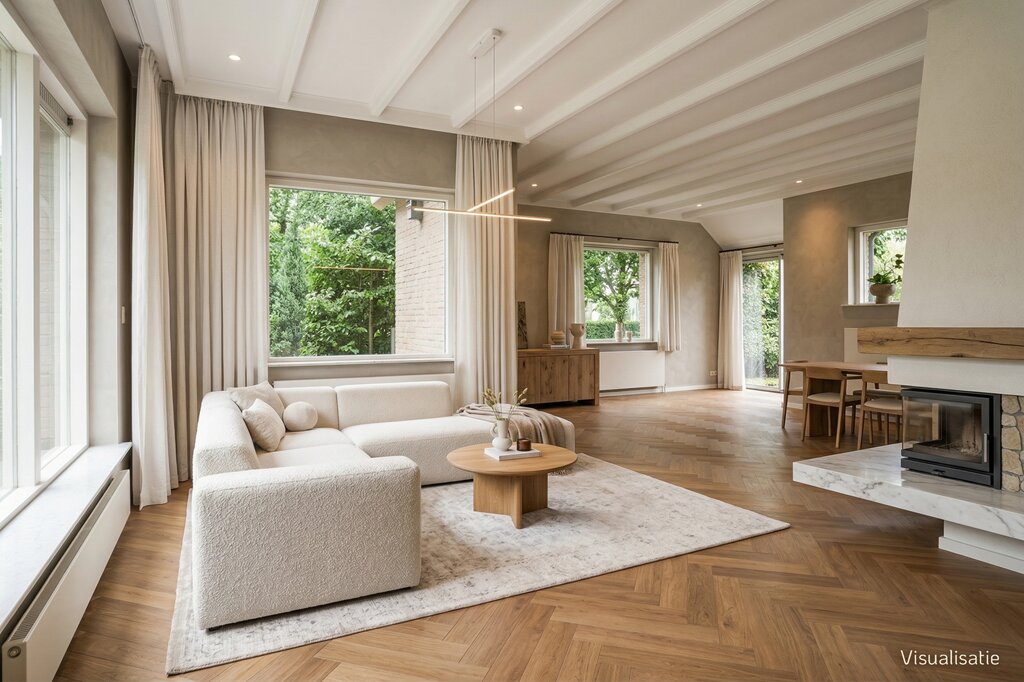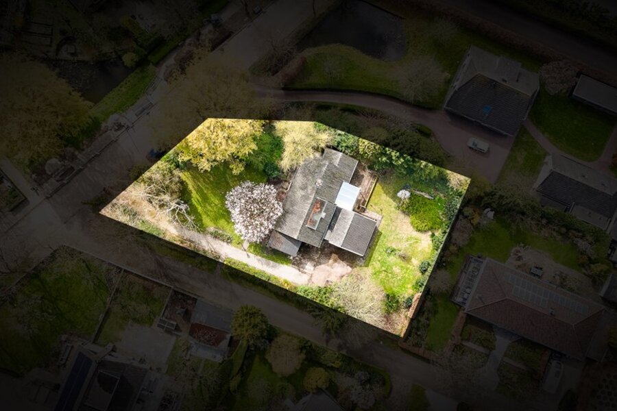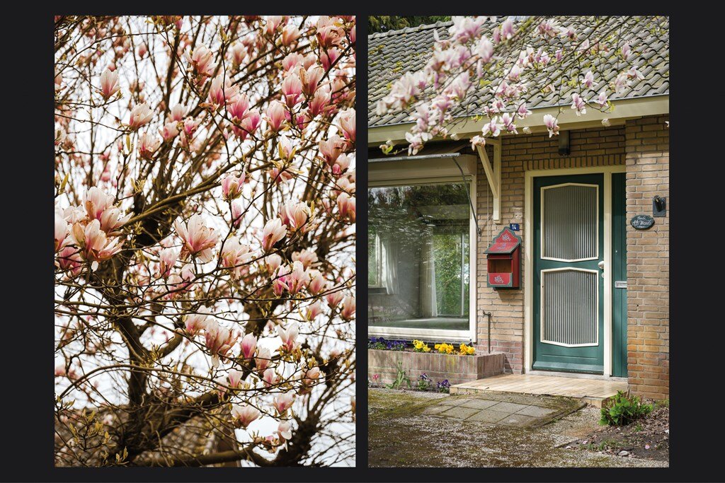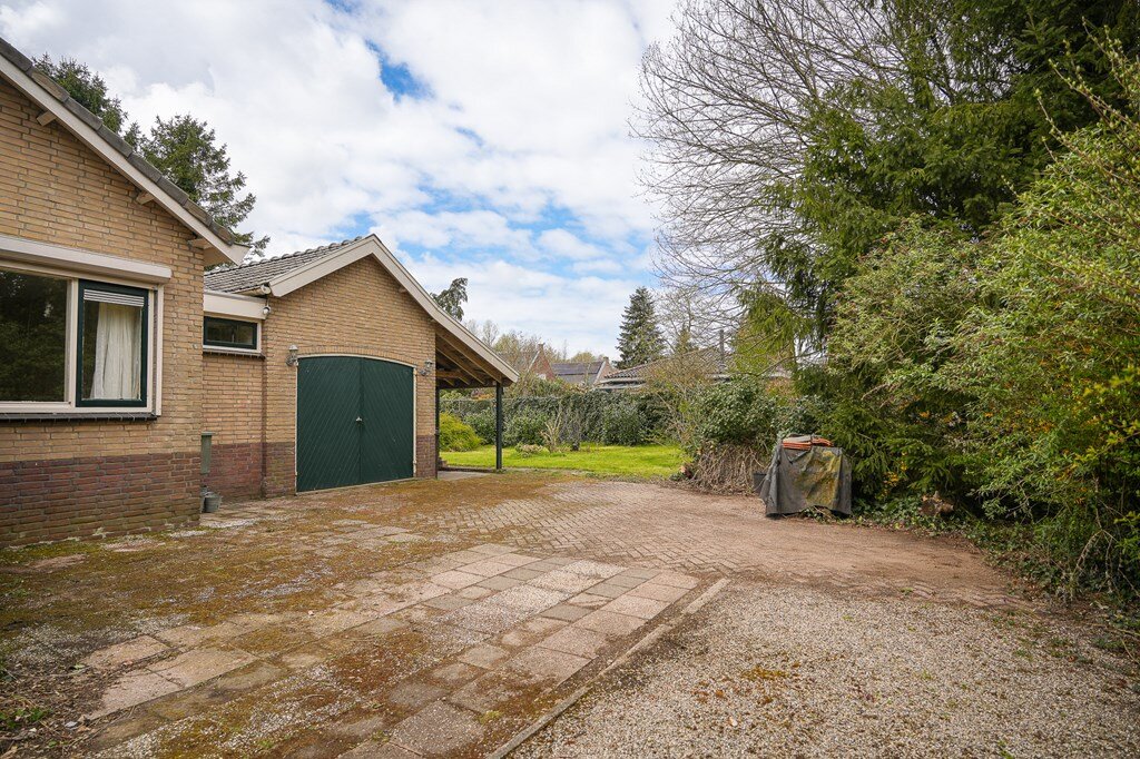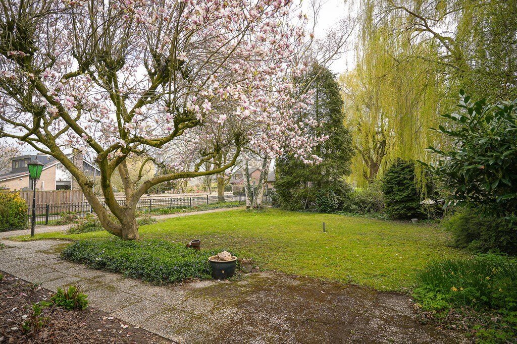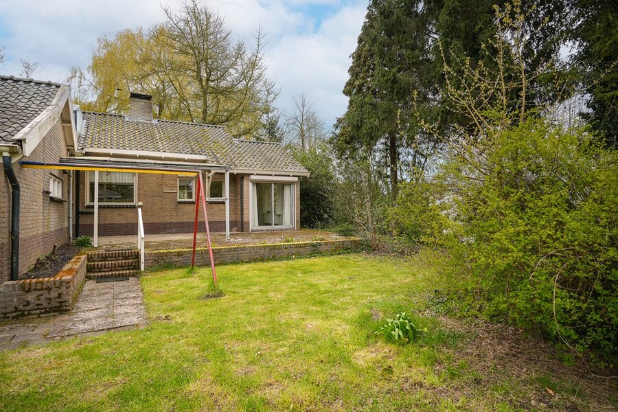 Het perceel is groot, groen en omgeven door volwassen beplanting. De tuin geeft privacy aan alle kanten. Dit is wat buiten wonen in een dorp is. Het perceel loopt rondom de woning en is diep genoeg om overal een fijne plek te vinden: volle zon, schaduw onder de grote bomen, of beschut op het terras direct aan de woonkamer. De lange oprit door de voortuin zorgt ervoor dat de woning op afstand van de weg ligt. Dat geeft rust en privacy, ook al woon je midden in het dorp. De magnolia aan de voorzijde bepaalt het beeld zodra je het erf oprijdt — een boom die in het voorjaar voor zichzelf spreekt.