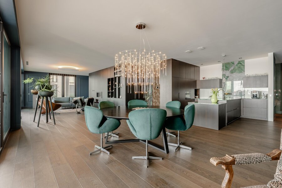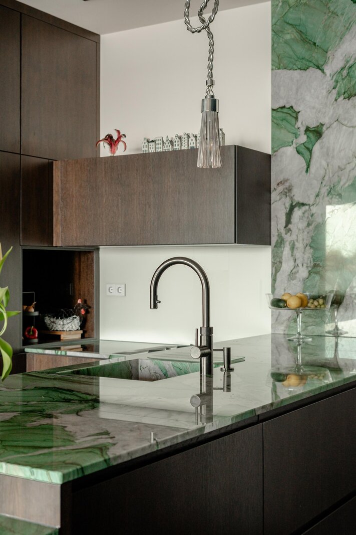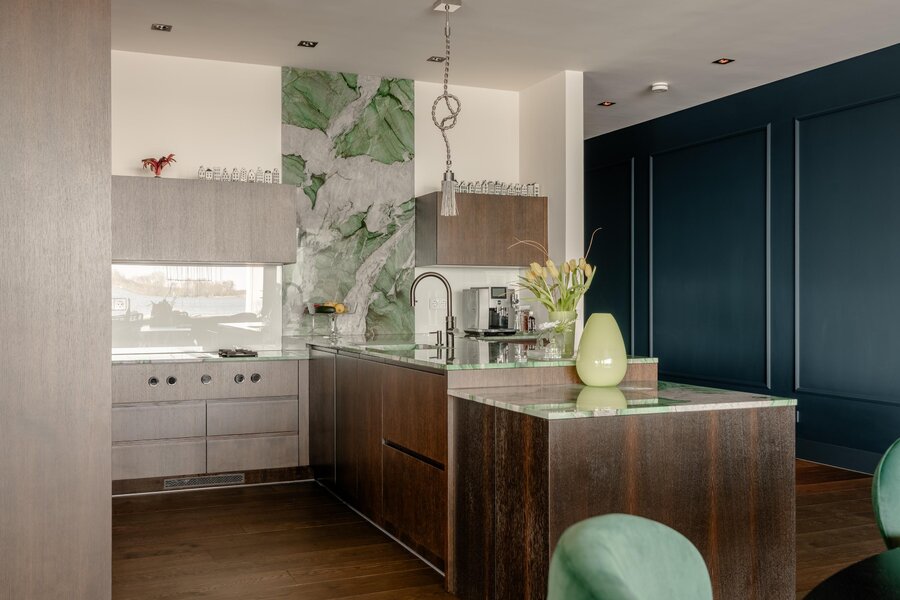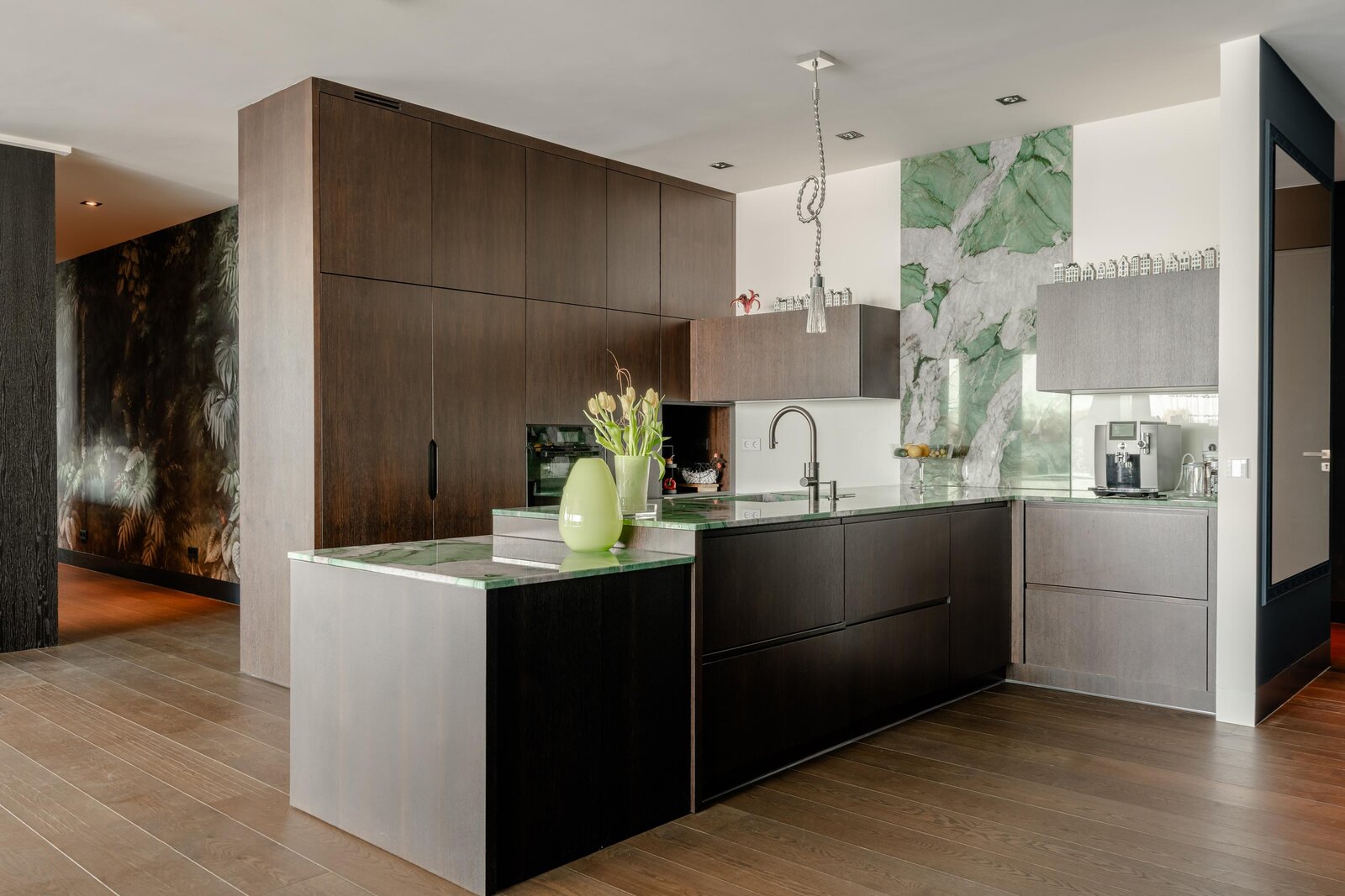The open-plan kitchen forms the central point of the living space and connects seamlessly to the living room and the terrace. The kitchen is fitted with an exclusive Italian marble countertop in white and green and is equipped with high-end built-in appliances, including a Miele steam oven, Quooker, a combination of gas and induction, a Liebherr fridge and freezer and an integrated sparkling water function.