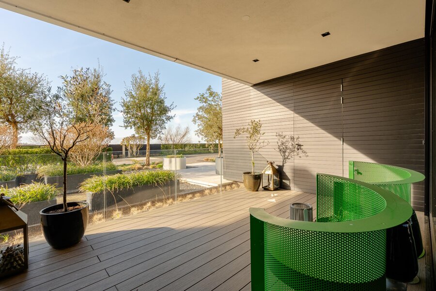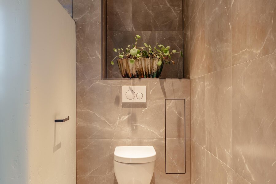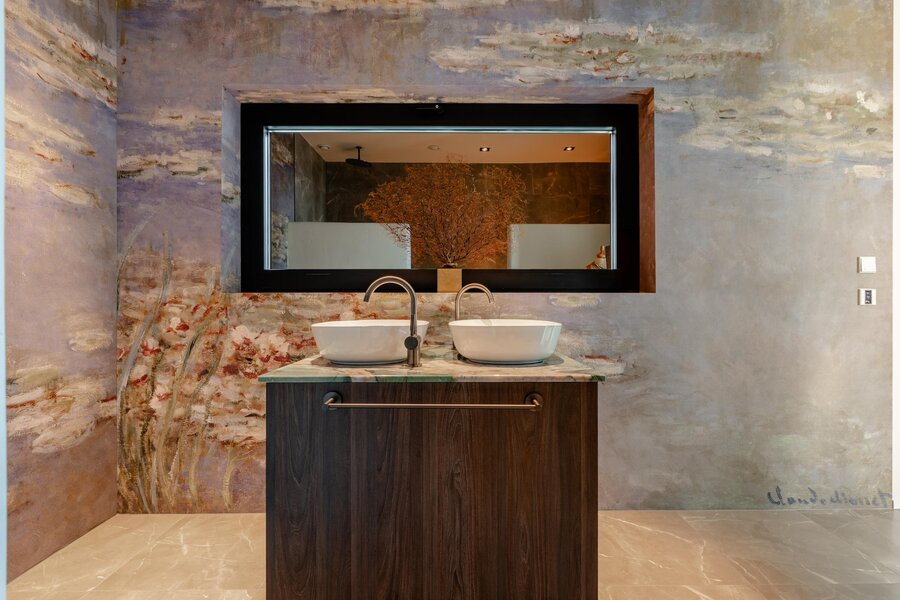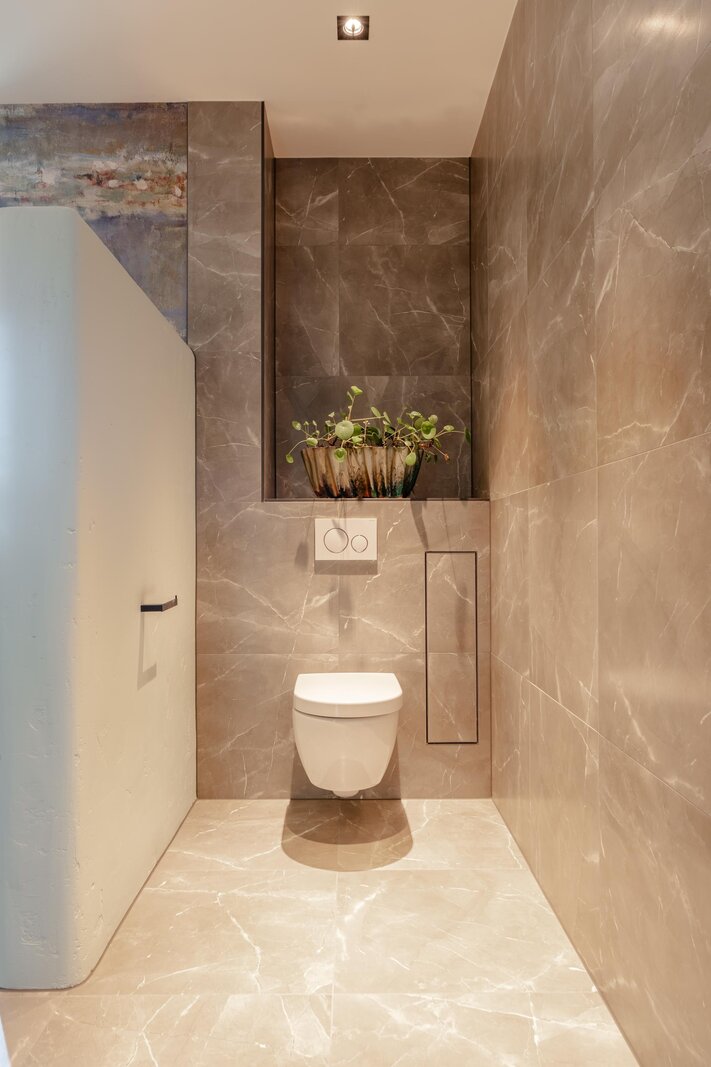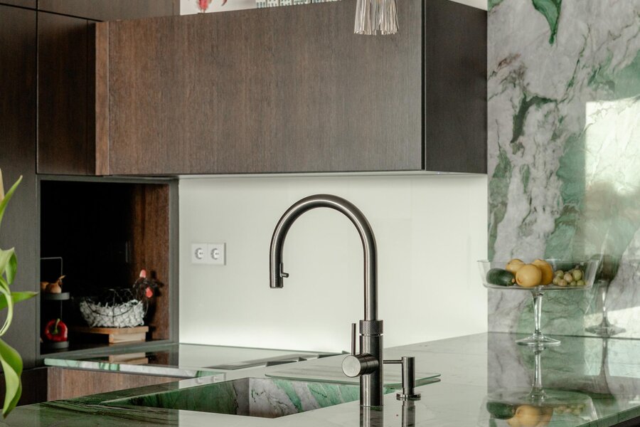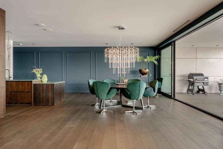 The open-plan kitchen forms the central point of the living space and connects seamlessly to the living room and the terrace. The kitchen is fitted with an exclusive Italian marble countertop in white and green and is equipped with high-end built-in appliances, including a Miele steam oven, Quooker, a combination of gas and induction, a Liebherr fridge and freezer and an integrated sparkling water function.