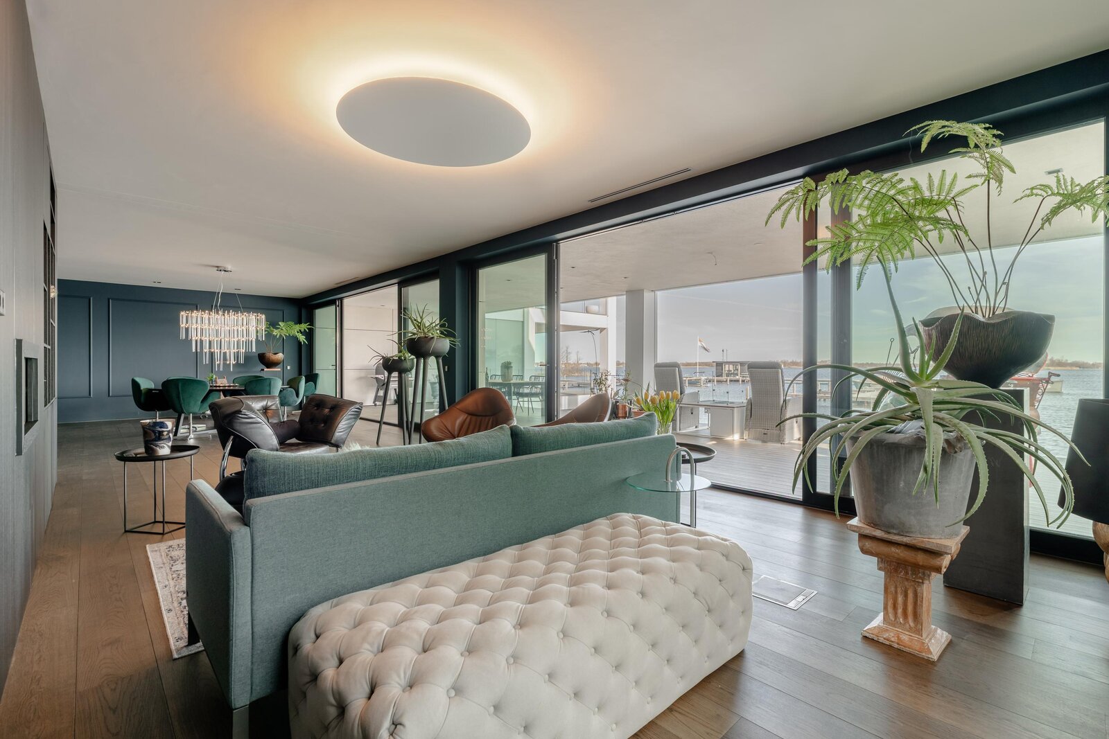 Dankzij de royale raampartijen en de ligging direct aan het water wordt het appartement gekenmerkt door een uitzonderlijke lichtinval en een vrij uitzicht over de haven en de aangemeerde boten. Dit resulteert in een verfijnd gevoel van ruimte, rust en exclusiviteit.