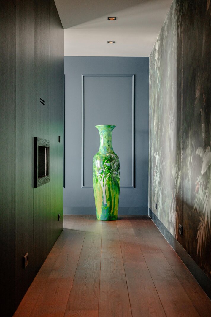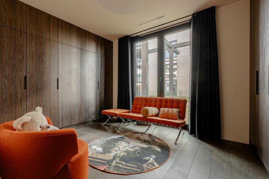 Throughout the entire apartment, a high-quality oak wooden floor has been installed, contributing to the warm and luxurious atmosphere of the interior.