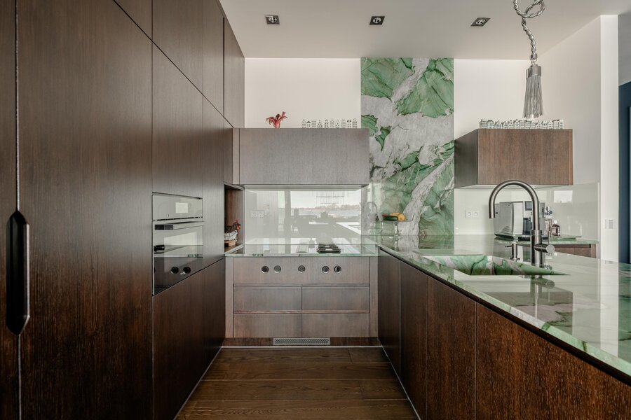 - Luxury open-plan kitchen with Italian marble countertop and high-end built-in appliances