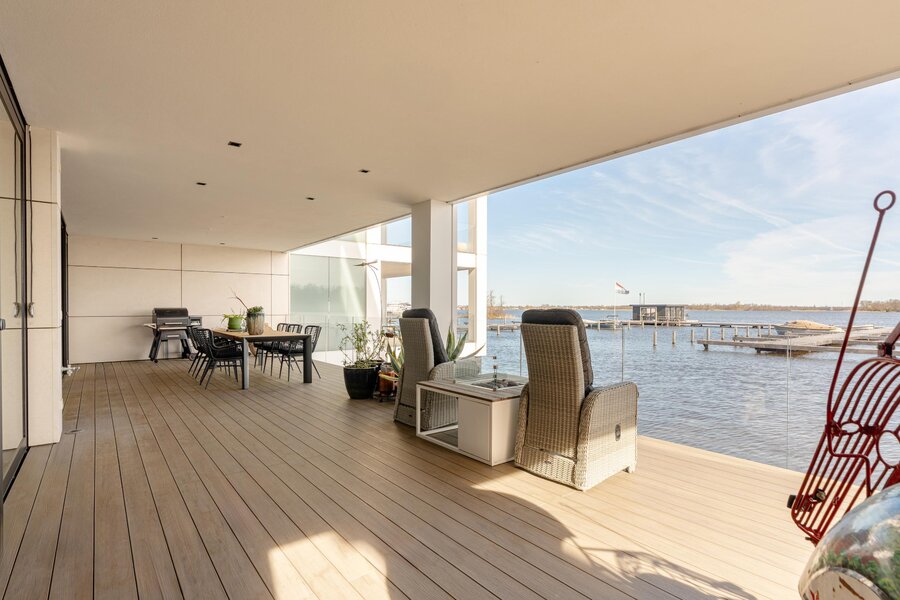 A remarkable feature of this apartment is the spacious terrace at the rear, approximately 65 m², which extends across the full width of the apartment. From here, you can enjoy beautiful views over the water of the Loosdrecht Lakes and the marina.