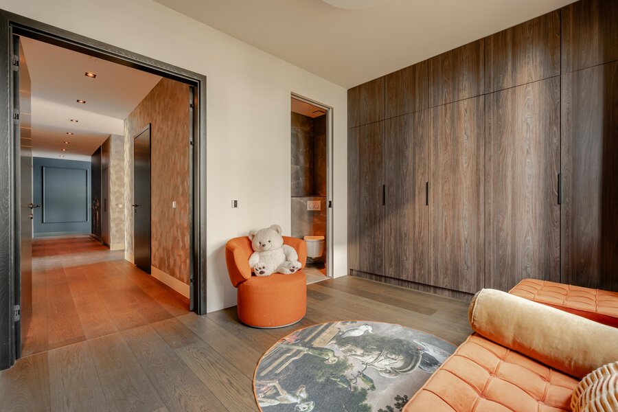 De royale master bedroom is voorzien van op maat gemaakte ensuite kasten met uitgebreide opbergmogelijkheden, waaronder een geïntegreerde schoenenkast. De ensuite badkamer is uitgevoerd met hetzelfde Italiaanse marmer als de keuken en beschikt over een ruime inloopdouche en toilet.