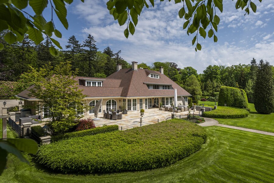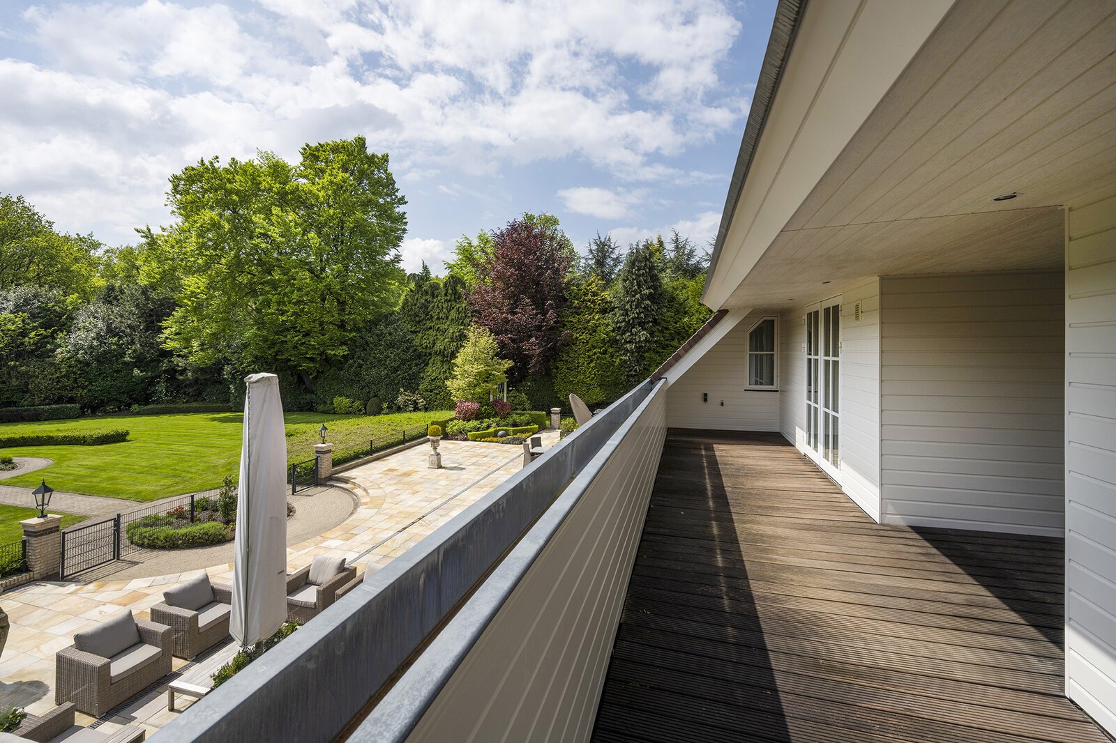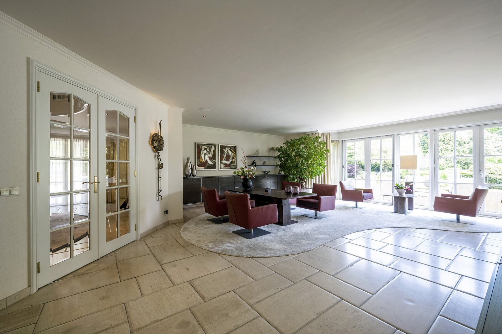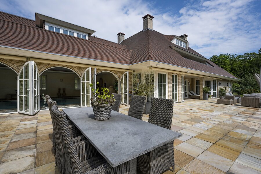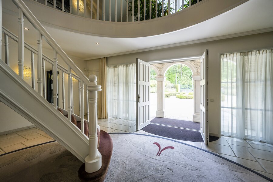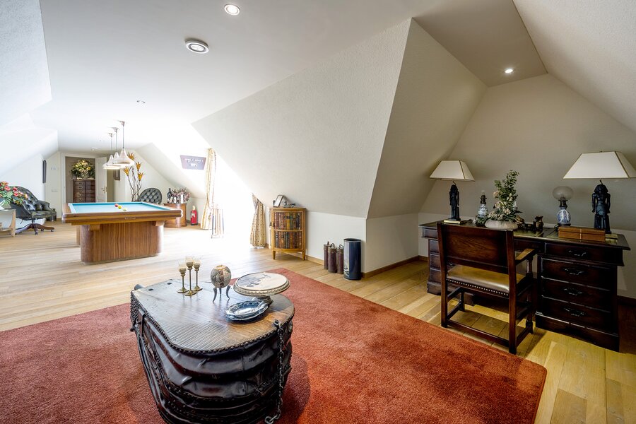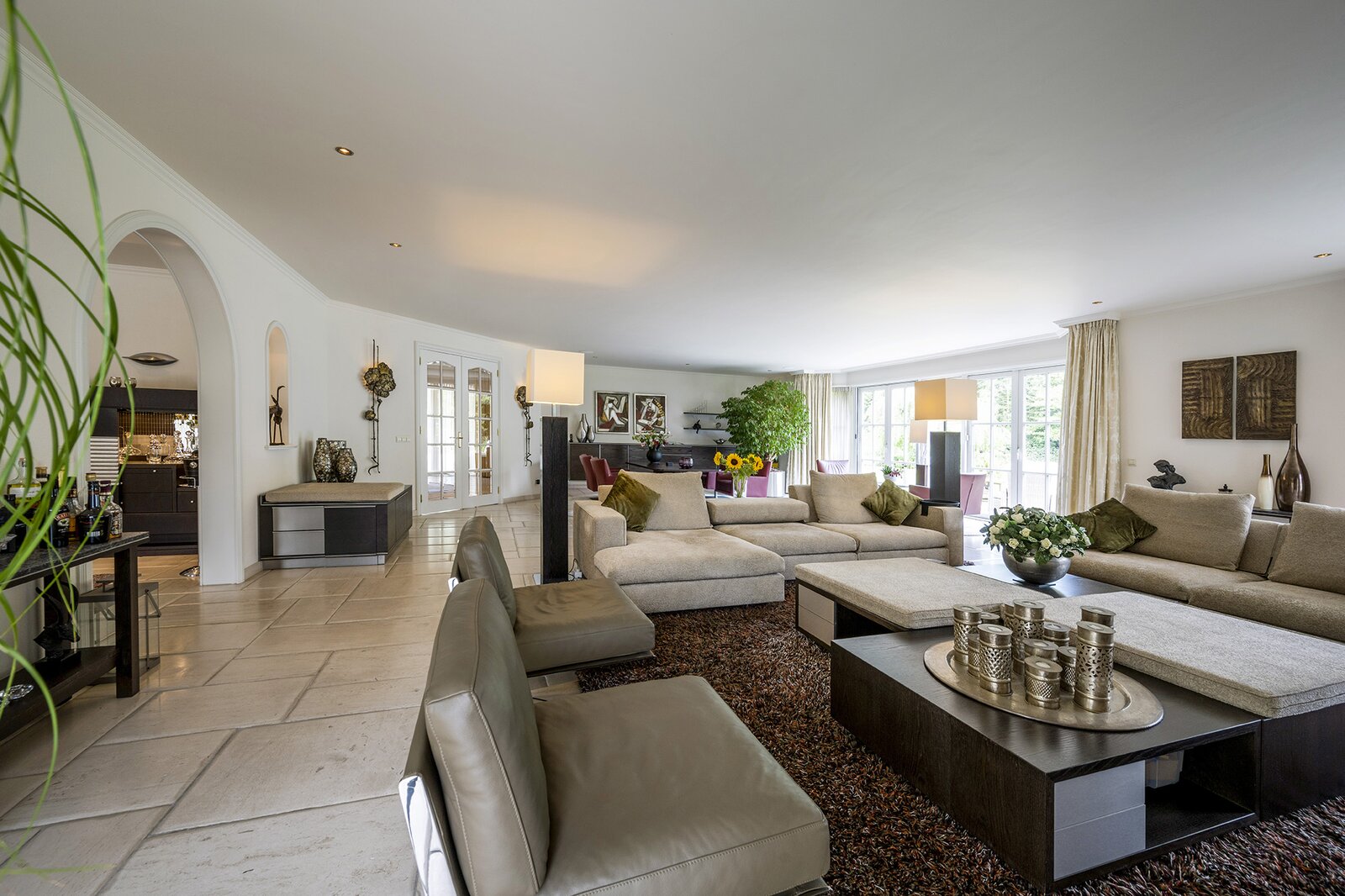 Dat uw villa midden op een meer dan 10.000 vierkante meter groot perceel staat en dat de buren ook niet op een postzegel wonen, draagt daar uiteraard aan bij. Sluit uw op afstand bedienbare toegangshek en u sluit de wereld buiten. Op ‘eigen erf’ vindt u vervolgens alles wat het leven aangenaam maakt, in aanvulling op uw buurtwensen. Tennisbaan? Check. Riante parkeergelegenheid – indoor én outdoor – voor uw collectie bolides? Check. Een lift? Check, dus daarmee is ook de levensloopbestendigheid geregeld. Binnenzwembad? Is er. Knoeperd van een buitenvijver? Vanzelfsprekend en mét koikarpers. Een inpandig maar wel volstrekt zelfstandig gastenverblijf? Maar natuurlijk. Wijnkelder? Bien sûr. Een alarminstallatie waar Fort Knox zich niet voor hoeft te schamen? Hoort erbij, op dit niveau. Want we hebben het hier over een villa in de buitencategorie: gebouwd in 2000/2001, met dik 1.000 – ja, duizend – vierkante meter woonoppervlak, verdeeld over vier etages, waarvan drie bovengronds plus een compleet geoutilleerd souterrain voor uw gasten of au-pair (met zelfs een eigen terras, dus die gasten krijgt u nooit meer weg; zeg niet dat we u niet gewaarschuwd hebben). De afwerking is tijdloos en van topkwaliteit, van de natuursteen vloeren op de begane grond tot de keramische leien op de zacht glooiende daken. Onder de brede overstek stroomt daglicht binnen door talloze roede-verdeelde ramen en openslaande deuren. En rondom, in de Engelse landschapsstijl aangelegde tuin, ziet u enkel 50 tinten groen.