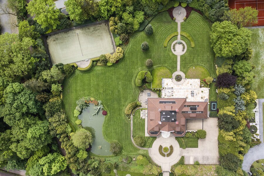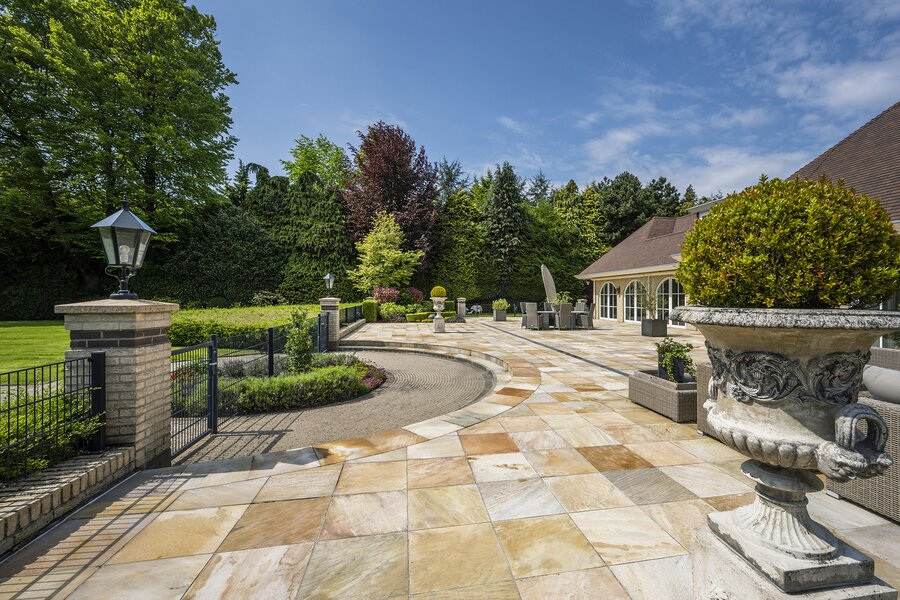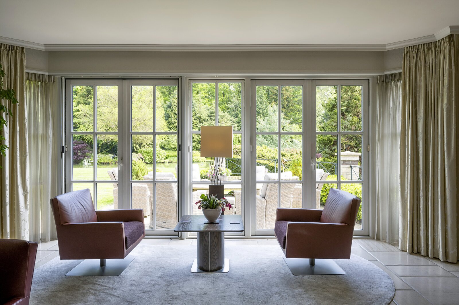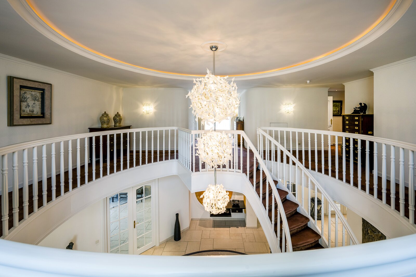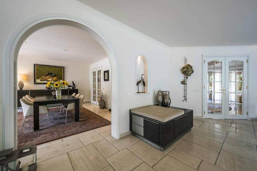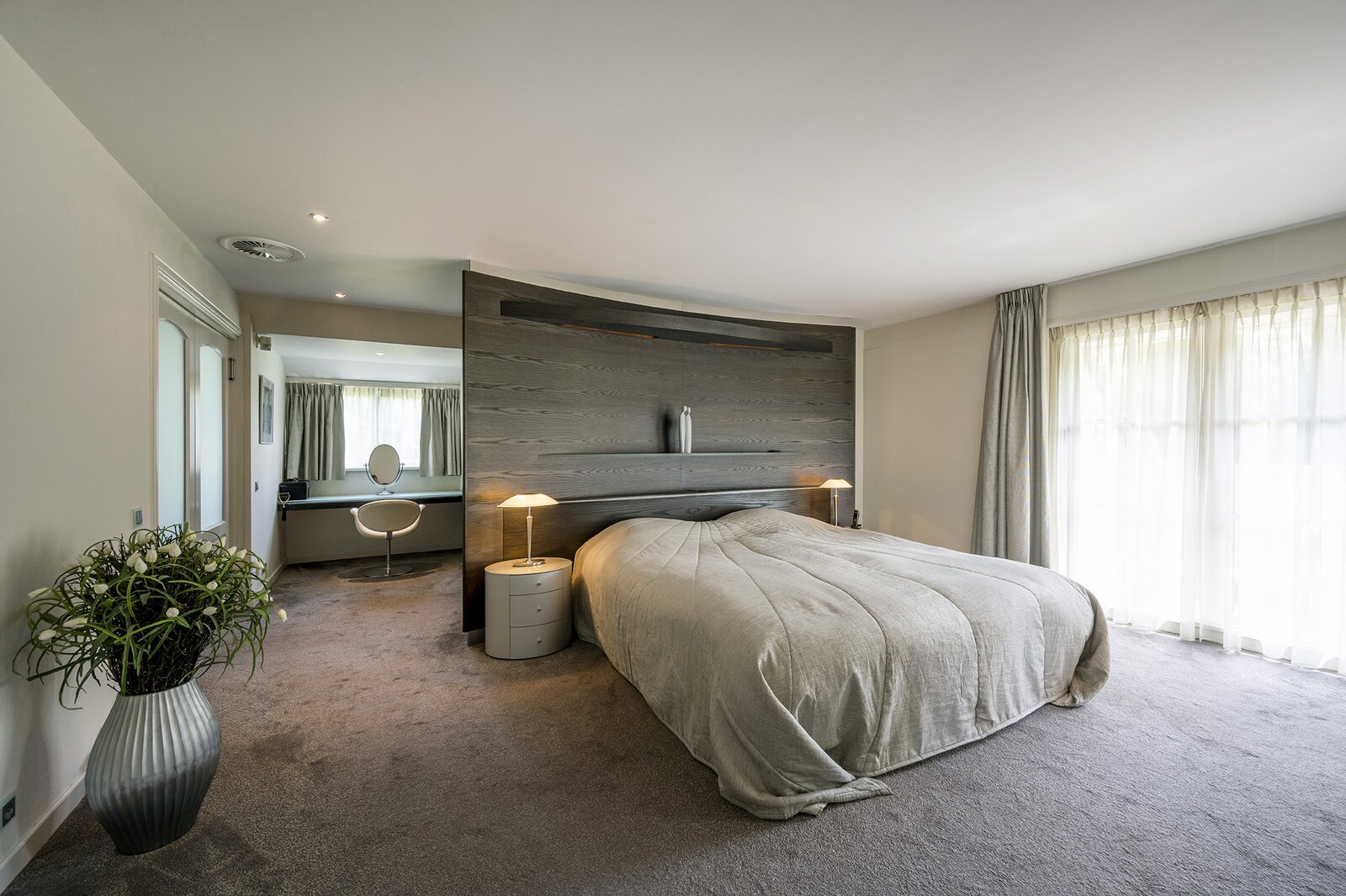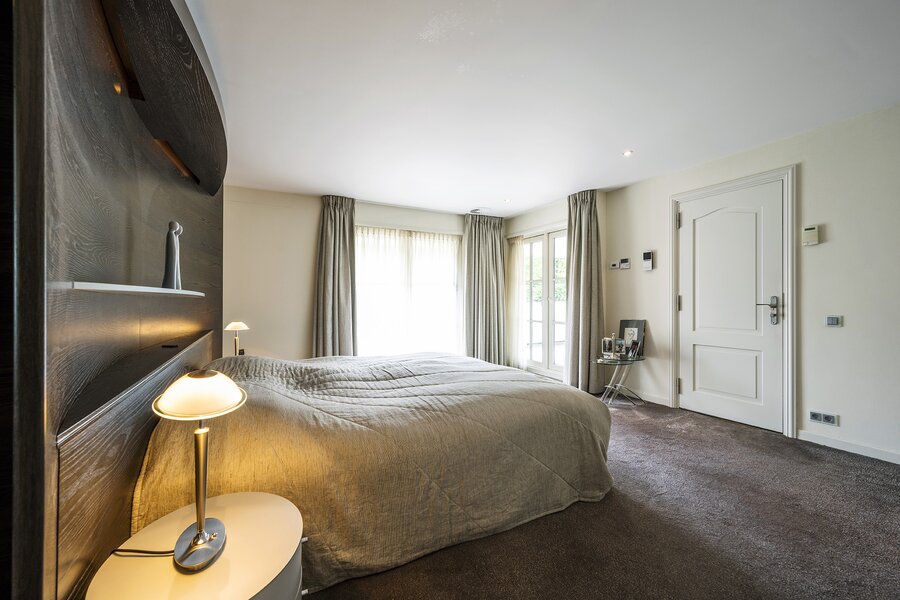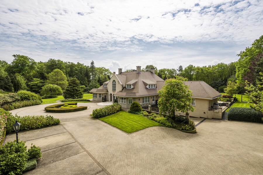 Dat uw villa midden op een meer dan 10.000 vierkante meter groot perceel staat en dat de buren ook niet op een postzegel wonen, draagt daar uiteraard aan bij. Sluit uw op afstand bedienbare toegangshek en u sluit de wereld buiten. Op ‘eigen erf’ vindt u vervolgens alles wat het leven aangenaam maakt, in aanvulling op uw buurtwensen. Tennisbaan? Check. Riante parkeergelegenheid – indoor én outdoor – voor uw collectie bolides? Check. Een lift? Check, dus daarmee is ook de levensloopbestendigheid geregeld. Binnenzwembad? Is er. Knoeperd van een buitenvijver? Vanzelfsprekend en mét koikarpers. Een inpandig maar wel volstrekt zelfstandig gastenverblijf? Maar natuurlijk. Wijnkelder? Bien sûr. Een alarminstallatie waar Fort Knox zich niet voor hoeft te schamen? Hoort erbij, op dit niveau. Want we hebben het hier over een villa in de buitencategorie: gebouwd in 2000/2001, met dik 1.000 – ja, duizend – vierkante meter woonoppervlak, verdeeld over vier etages, waarvan drie bovengronds plus een compleet geoutilleerd souterrain voor uw gasten of au-pair (met zelfs een eigen terras, dus die gasten krijgt u nooit meer weg; zeg niet dat we u niet gewaarschuwd hebben). De afwerking is tijdloos en van topkwaliteit, van de natuursteen vloeren op de begane grond tot de keramische leien op de zacht glooiende daken. Onder de brede overstek stroomt daglicht binnen door talloze roede-verdeelde ramen en openslaande deuren. En rondom, in de Engelse landschapsstijl aangelegde tuin, ziet u enkel 50 tinten groen.