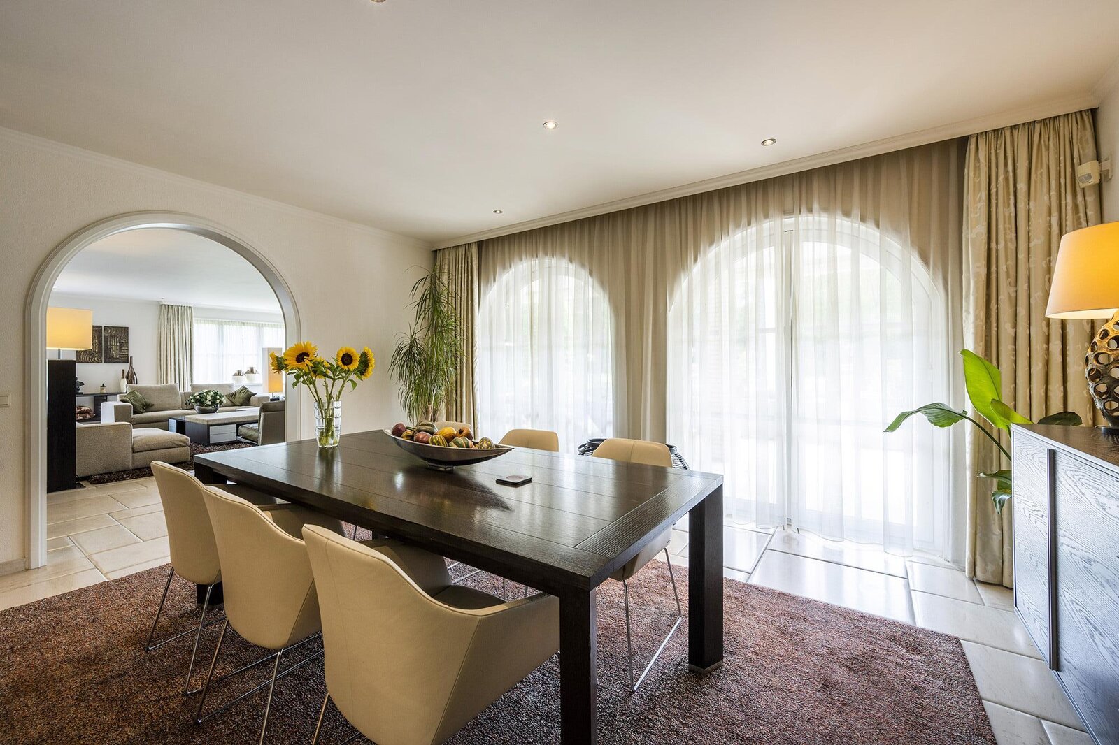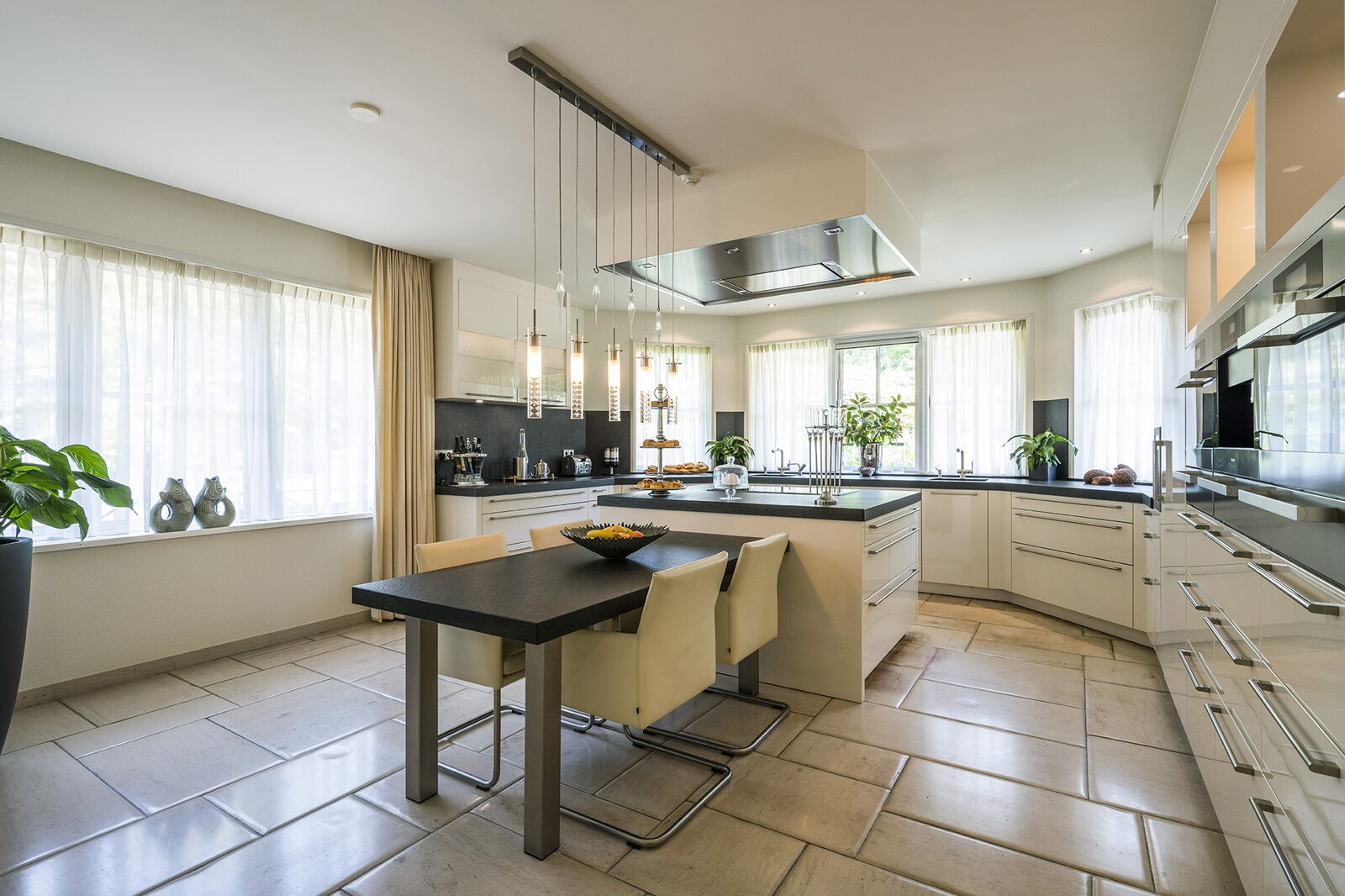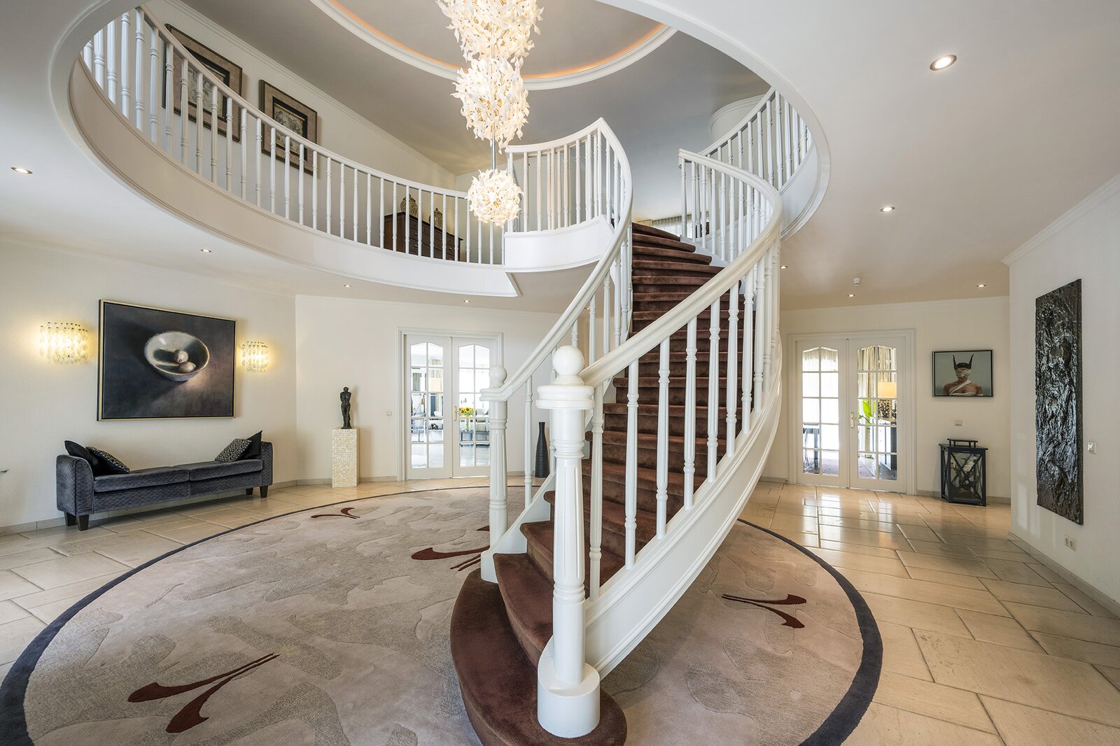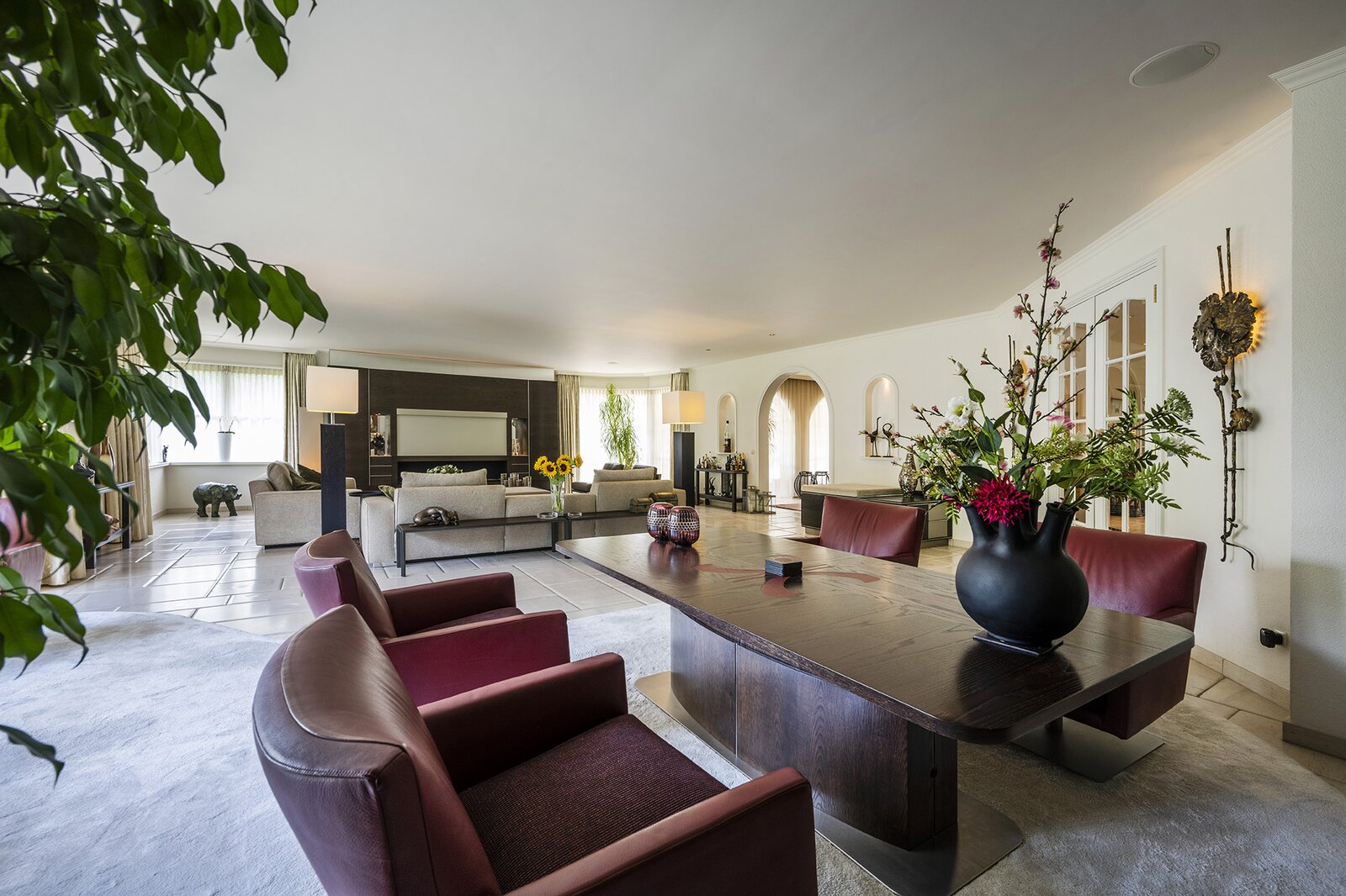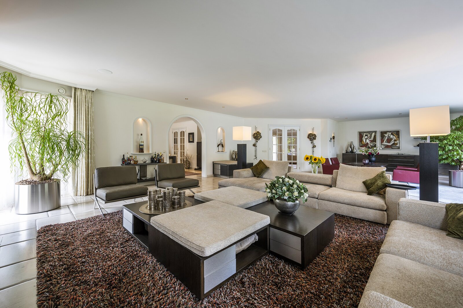 Dat uw villa midden op een meer dan 10.000 vierkante meter groot perceel staat en dat de buren ook niet op een postzegel wonen, draagt daar uiteraard aan bij. Sluit uw op afstand bedienbare toegangshek en u sluit de wereld buiten. Op ‘eigen erf’ vindt u vervolgens alles wat het leven aangenaam maakt, in aanvulling op uw buurtwensen. Tennisbaan? Check. Riante parkeergelegenheid – indoor én outdoor – voor uw collectie bolides? Check. Een lift? Check, dus daarmee is ook de levensloopbestendigheid geregeld. Binnenzwembad? Is er. Knoeperd van een buitenvijver? Vanzelfsprekend en mét koikarpers. Een inpandig maar wel volstrekt zelfstandig gastenverblijf? Maar natuurlijk. Wijnkelder? Bien sûr. Een alarminstallatie waar Fort Knox zich niet voor hoeft te schamen? Hoort erbij, op dit niveau. Want we hebben het hier over een villa in de buitencategorie: gebouwd in 2000/2001, met dik 1.000 – ja, duizend – vierkante meter woonoppervlak, verdeeld over vier etages, waarvan drie bovengronds plus een compleet geoutilleerd souterrain voor uw gasten of au-pair (met zelfs een eigen terras, dus die gasten krijgt u nooit meer weg; zeg niet dat we u niet gewaarschuwd hebben). De afwerking is tijdloos en van topkwaliteit, van de natuursteen vloeren op de begane grond tot de keramische leien op de zacht glooiende daken. Onder de brede overstek stroomt daglicht binnen door talloze roede-verdeelde ramen en openslaande deuren. En rondom, in de Engelse landschapsstijl aangelegde tuin, ziet u enkel 50 tinten groen.