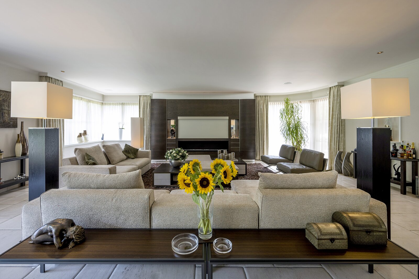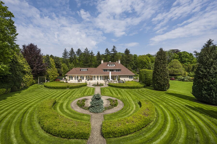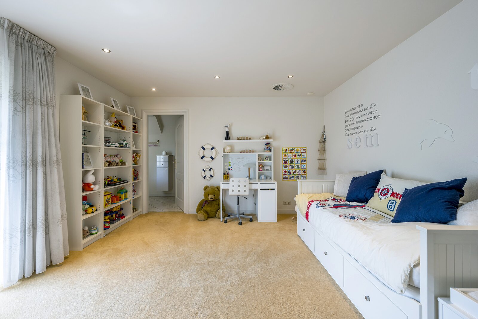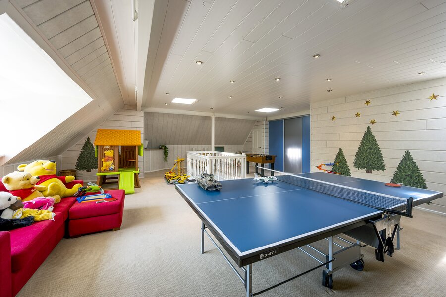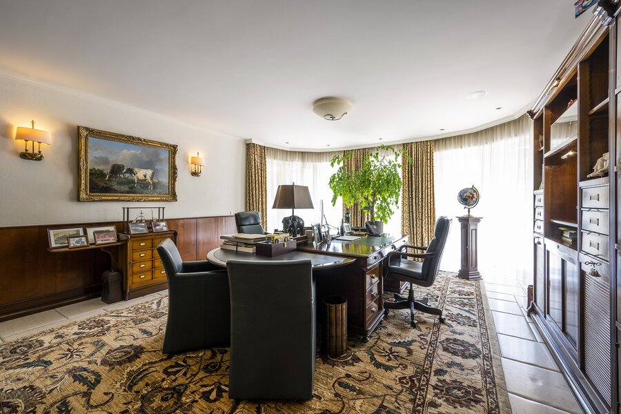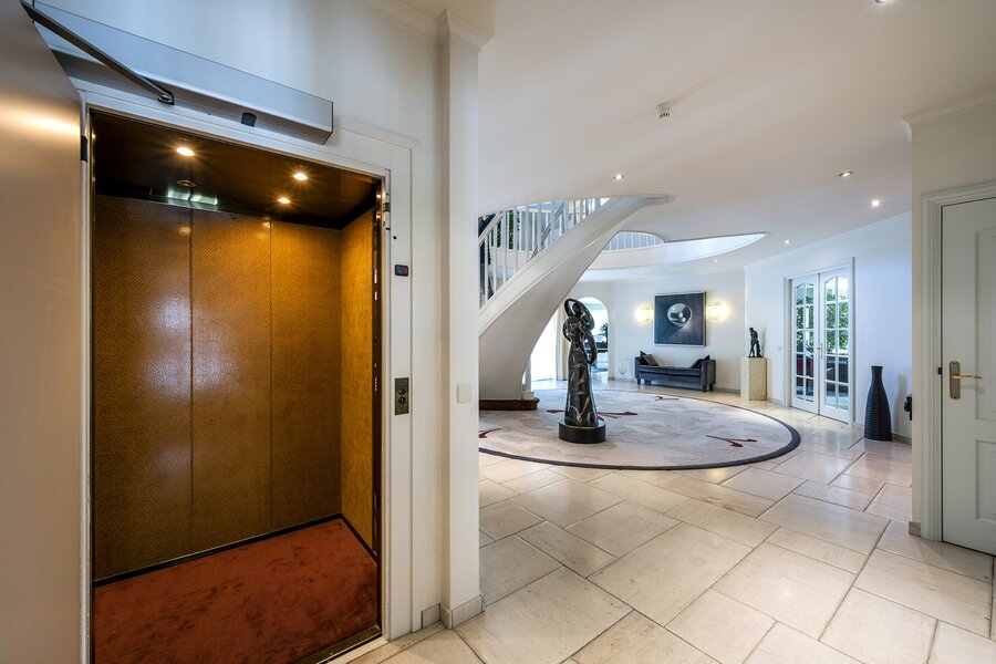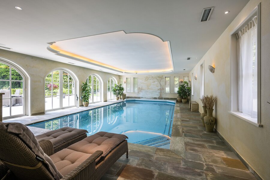 Dat uw villa midden op een meer dan 10.000 vierkante meter groot perceel staat en dat de buren ook niet op een postzegel wonen, draagt daar uiteraard aan bij. Sluit uw op afstand bedienbare toegangshek en u sluit de wereld buiten. Op ‘eigen erf’ vindt u vervolgens alles wat het leven aangenaam maakt, in aanvulling op uw buurtwensen. Tennisbaan? Check. Riante parkeergelegenheid – indoor én outdoor – voor uw collectie bolides? Check. Een lift? Check, dus daarmee is ook de levensloopbestendigheid geregeld. Binnenzwembad? Is er. Knoeperd van een buitenvijver? Vanzelfsprekend en mét koikarpers. Een inpandig maar wel volstrekt zelfstandig gastenverblijf? Maar natuurlijk. Wijnkelder? Bien sûr. Een alarminstallatie waar Fort Knox zich niet voor hoeft te schamen? Hoort erbij, op dit niveau. Want we hebben het hier over een villa in de buitencategorie: gebouwd in 2000/2001, met dik 1.000 – ja, duizend – vierkante meter woonoppervlak, verdeeld over vier etages, waarvan drie bovengronds plus een compleet geoutilleerd souterrain voor uw gasten of au-pair (met zelfs een eigen terras, dus die gasten krijgt u nooit meer weg; zeg niet dat we u niet gewaarschuwd hebben). De afwerking is tijdloos en van topkwaliteit, van de natuursteen vloeren op de begane grond tot de keramische leien op de zacht glooiende daken. Onder de brede overstek stroomt daglicht binnen door talloze roede-verdeelde ramen en openslaande deuren. En rondom, in de Engelse landschapsstijl aangelegde tuin, ziet u enkel 50 tinten groen.